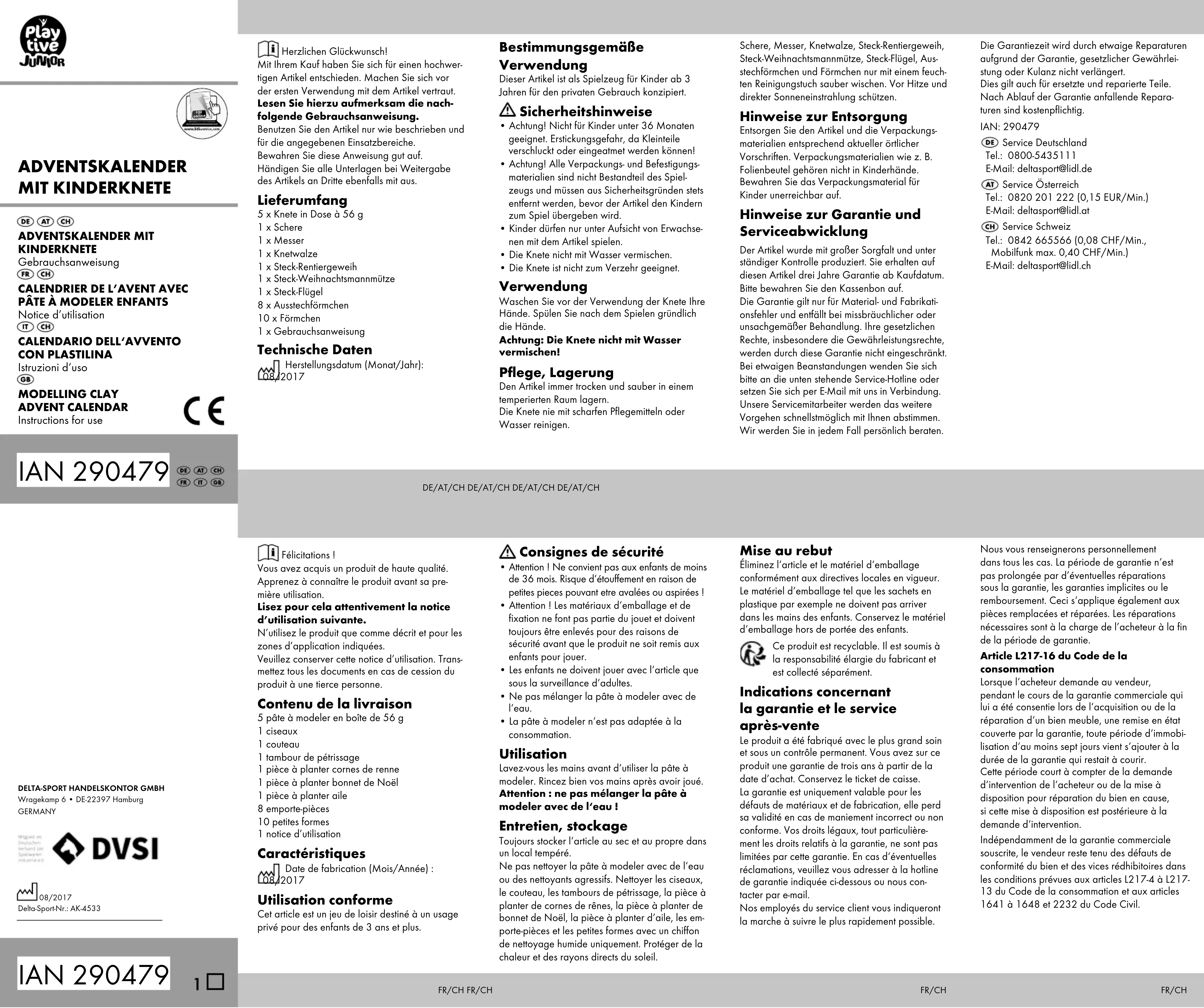 - Attention ! Ne convient pas aux enfants de moins de 36 mois. Risque d‘étouffement en raison de petites pieces pouvant etre avalées ou aspirées !• Attention ! Les matériaux d‘emballage et de fixation ne font pas partie du jouet et doivent toujours être enlevés pour des raisons de sécurité avant que le produit ne soit remis aux enfants pour jouer.• Les enfants ne doivent jouer avec l‘article que sous la surveillance d‘adultes.• Ne pas mélanger la pâte à modeler avec de l‘eau.• La pâte à modeler n‘est pas adaptée à la consommation. Utilisation Lavez-vous les mains avant d‘utiliser la pâte à modeler. Rincez bien vos mains après avoir joué.Attention : ne pas mélanger la pâte à modeler avec de l‘eau ! Entretien, stockage Toujours stocker l‘article au sec et au propre dans un local tempéré.Ne pas nettoyer la pâte à modeler avec de l‘eau ou des nettoyants agressifs. Nettoyer les ciseaux, le couteau, les tambours de pétrissage, la pièce à planter de cornes de rênes, la pièce à planter de bonnet de Noël, la pièce à planter d‘aile, les em-porte-pièces et les petites formes avec un chiffon de nettoyage humide uniquement. Protéger de la chaleur et des rayons directs du soleil. IAN 290479 IAN 290479
