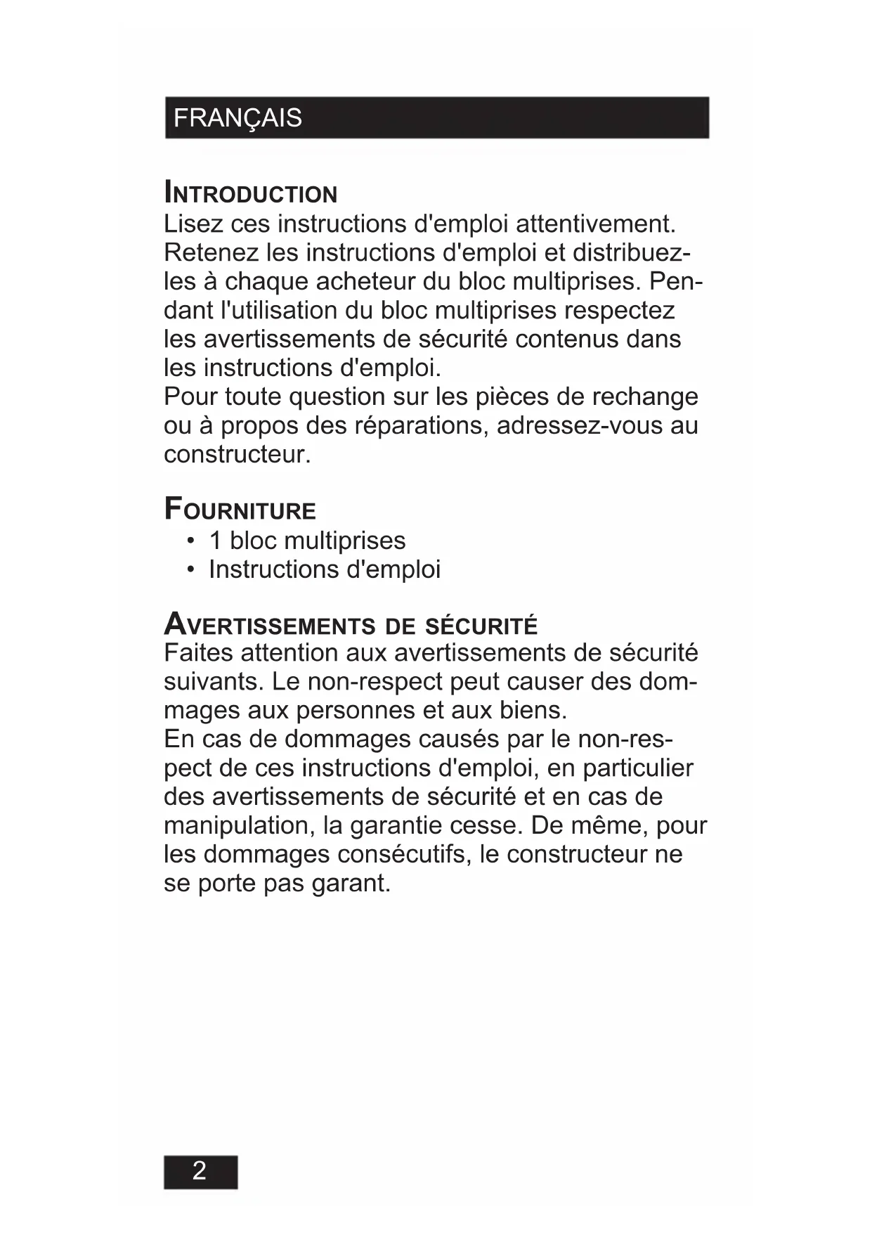INTRODUCTION Lisez ces instructions d'emploi attentivement. Retenez les instructions d'emploi et distribuez- les à chaque acheteur du bloc multiprises. Pen- dant l'utilisation du bloc multiprises respectez les avertissements de sécurité contenus dans les instructions d'emploi. Pour toute question sur les pièces de rechange ou à propos des réparations, adressez-vous au constructeur. FOURNITURE 1 bloc multiprises Instructions d'emploi