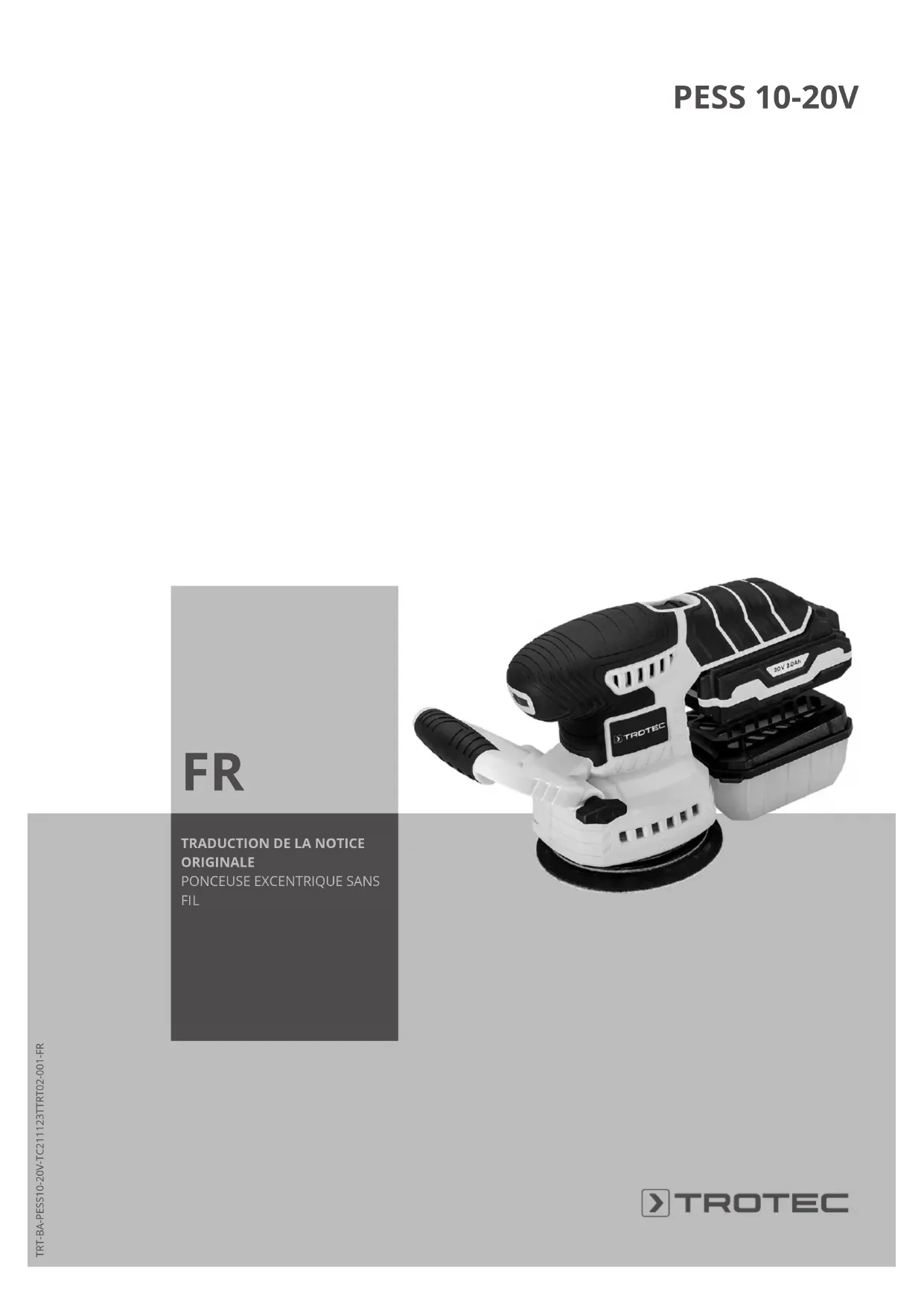 https://hub.trotec.com/?id=46068FR 3 Ponceuse excentrique sans fil PESS 10-20V Sécurité Consignes générales de sécurité pour les outils électriques Avertissement Lisez toutes les mises en garde de sécurité, instructions, illustrations et caractéristiques techniques fournies avec cet outil électroportatif. Le non-respect des instructions suivantes risque de causer une électrocution, de provoquer un incendie ou de donner lieu à des blessures graves. Conservez toutes les consignes de sécurité et toutes les instructions pour pouvoir vous y reporter ultérieurement. Le terme outil électrique utilisé dans les consignes de sécurité se rapporte aux outils électriques utilisés sur secteur (avec un câble électrique) et aux outils électriques sans fil (sans câble électrique). Avertissements de sécurité généraux pour les outils – Sécurité de la zone de travail
