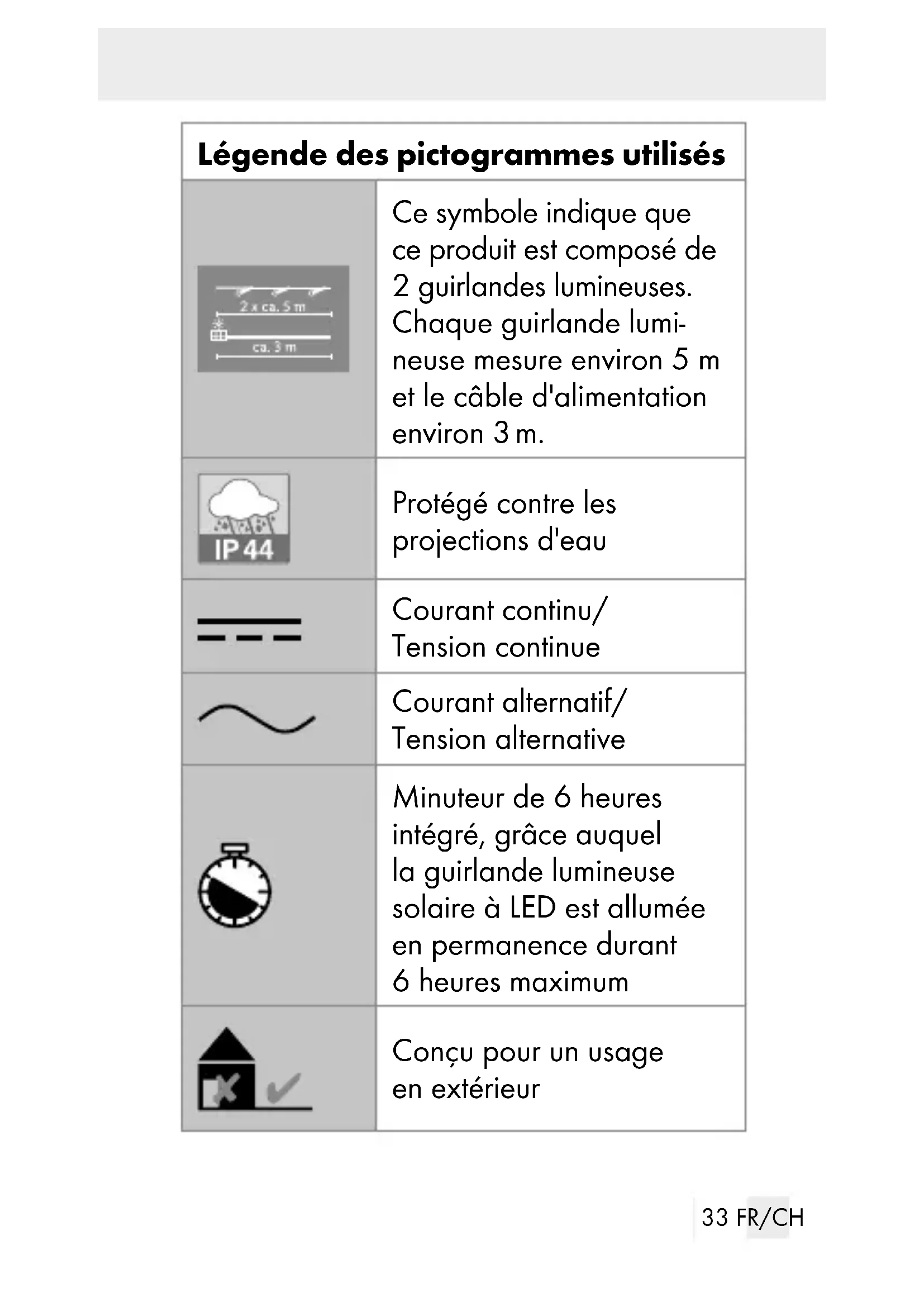 nstructions de manipulation Guirlande lumineuse solaire à LED Introduction Nous vous félicitons pour l‘achat de votre nouveau produit. Vous avez opté pour un produit de grande qualité. Le mode d‘emploi fait partie intégrante de ce produit. Il contient des indications importantes pour la sécurité,35 FR/CH l’utilisation et la mise au rebut. Veuillez lire consciencieusement toutes les indications d‘utilisation et de sécurité du produit. Ce produit doit uniquement être utilisé conformé- ment aux instructions et dans les domaines d‘application spécifiés. Lors d‘une cession à tiers, veuillez également remettre tous les documents. Utilisation conforme Ce produit convient à un usage en extérieur. Ce produit est prévu pour une utilisation dans des foyers privés et ne convient pas à un usage commercial ou à d‘autres utilisations. Descriptif des pièces