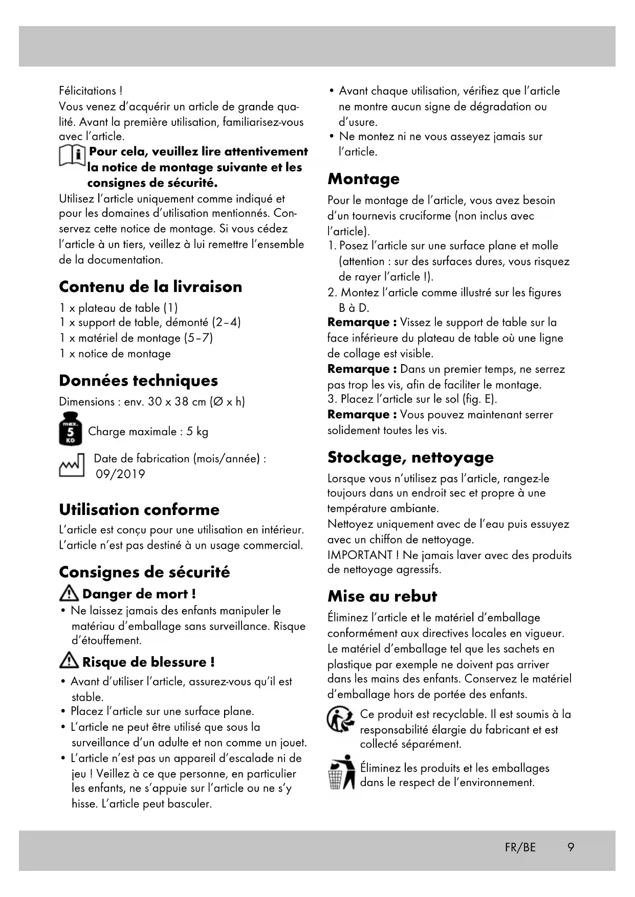 - s‘il présente les qualités qu‘un acheteur peut légitimement attendre eu égard aux déclara- tions publiques faites par le vendeur, par le producteur ou par son représentant, notamment dans la publicité ou l‘étiquetage ; 2° Ou s‘il présente les caractéristiques définies d‘un commun accord par les parties ou être pro- pre à tout usage spécial recherché par l‘acheteur, porté à la connaissance du vendeur et que ce dernier a accepté. Article L217-12 du Code de la consommation L‘action résultant du défaut de conformité se prescrit par deux ans à compter de la délivrance du bien. Article 1641 du Code civil Le vendeur est tenu de la garantie à raison des défauts cachés de la chose vendue qui la rendent impropre à l‘usage auquel on la destine, ou qui diminuent tellement cet usage que l‘acheteur ne l‘aurait pas acquise, ou n‘en aurait donné qu‘un moindre prix, s‘il les avait connus.11FR/BE Article 1648 1er alinéa du Code civil L‘action résultant des vices rédhibitoires doit être intentée par l‘acquéreur dans un délai de deux ans à compter de la découverte du vice. Les pièces détachées indispensables à l’utilisation du produit sont disponibles pendant la durée de la garantie du produit. IAN : 306711_1904 Service France Tel. : 0800 919270 E-Mail : deltasport@lidl.fr Service Belgique Tel. : 070 270 171 (0,15 EUR/Min.) E-Mail : deltasport@lidl.be12 NL/BE Gefeliciteerd! Met uw aankoop hebt u voor een hoogwaardig artikel gekozen. Zorg ervoor dat u voor het eerste gebruik met het artikel vertrouwd raakt. Lees hiervoor de volgende monta- gehandleiding en de veiligheidstips zorgvuldig door. Gebruik het artikel alleen zoals omschreven en voor het aangegeven doel. Bewaar deze monta- gehandleiding goed. Geef alle documenten mee als u het artikel aan iemand anders geeft. In het leveringspakket inbegrepen 1 x tafelblad (1) 1 x tafelonderstel, gedemonteerd (2–4) 1 x montagemateriaal (5–7) 1 x montagehandleiding Technische gegevens Afmetingen: ca. 30 x 38 cm (Ø x h) Maximale belasting: 5 kg Productiedatum (maand/jaar): 09/2019 Voorgeschreven gebruik Het artikel is ontworpen voor gebruik binnenshuis. Het artikel is niet bestemd voor commercieel gebruik. Veiligheidsinstructies Levensgevaar!