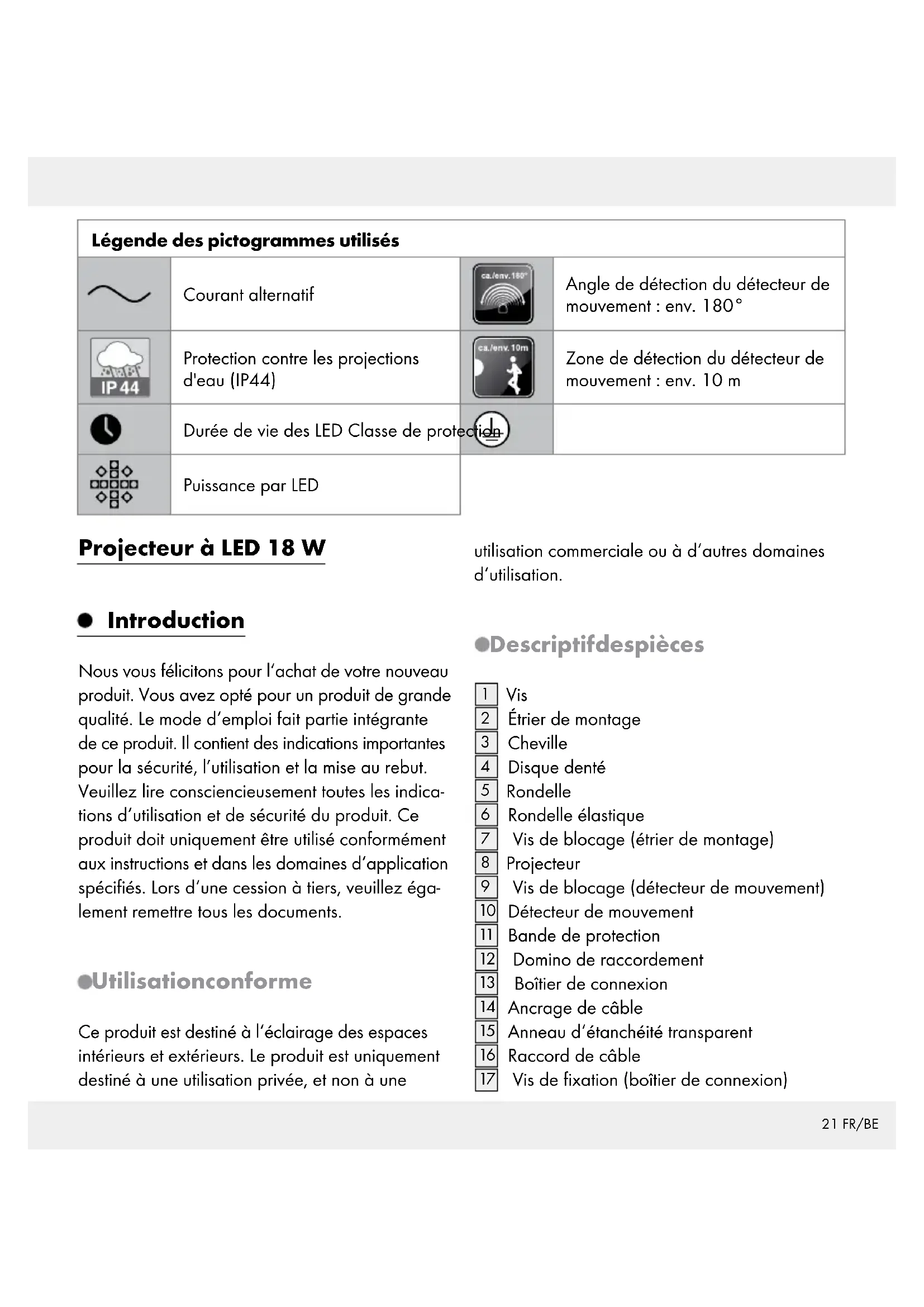 Molette de réglage LUX Caractéristiques techniques Tension de service : 230 V ∼ 50 Hz Puissance absorbée : 18 W Ampoule : 30 x LED 0,5 W Interrupteur crépusculaire : réglable de 10 lx –20.000 lx Durée d‘éclairage : réglable d‘env. 10s +/- 5s – 4 min +/- 1min Angle de détection du détecteur de mouvement : env.180° à l‘horizontal Portée du détecteur de mouvement : 10 m maximum Classe de protection : I Indice de protection: IP44 (protection contre les projections d‘eau) Dimensions totales : 15,5 x 17,5 x 14,5 cm Poids : env. 460 g (accessoires inclus) Surface de projection : max. 15,5 x 17,5 cm Hauteur de montage : env. 1,8-2,5 m Certifié TÜV SÜD / GS Contenu de la livraison Immédiatement après le déballage du produit, veuillez toujours contrôler que le contenu de la livraison est complet et que le produit se trouve en parfait état. 1 projecteur LED avec détecteur de mouvement 2 chevilles (Ø 8 mm) 2 vis (Ø 5 mm x 50 mm) 1 étrier de montage 1 ancrage de câble 2 disques dentés 2 rondelles 2 rondelles élastiques 2 vis de blocage 1 mode d‘emploi Instructions générales de sécurité
