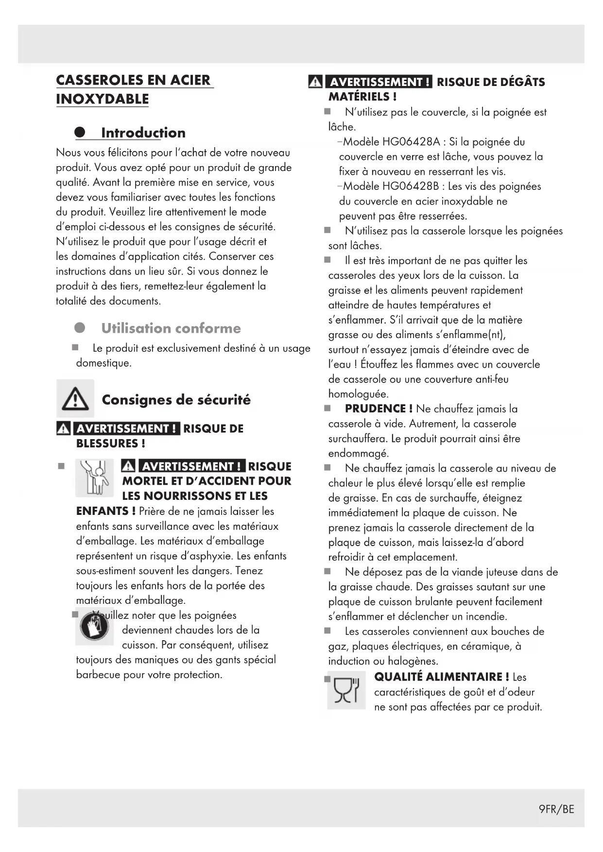 MATÉRIELS! N’utilisez pas le couvercle, si la poignée est lâche. – Modèle HG06428A: Si la poignée du couvercle en verre est lâche, vous pouvez la fixer à nouveau en resserrant les vis. – Modèle HG06428B: Les vis des poignées du couvercle en acier inoxydable ne peuvent pas être resserrées. N’utilisez pas la casserole lorsque les poignées sont lâches. Il est très important de ne pas quitter les casseroles des yeux lors de la cuisson. La graisse et les aliments peuvent rapidement atteindre de hautes températures et s’enflammer. S’il arrivait que de la matière grasse ou des aliments s’enflamme(nt), surtout n’essayez jamais d’éteindre avec de l’eau! Étouffez les flammes avec un couvercle de casserole ou une couverture anti-feu homologuée. PRUDENCE! Ne chauffez jamais la casserole à vide. Autrement, la casserole surchauffera. Le produit pourrait ainsi être endommagé. Ne chauffez jamais la casserole au niveau de chaleur le plus élevé lorsqu’elle est remplie de graisse. En cas de surchauffe, éteignez immédiatement la plaque de cuisson. Ne prenez jamais la casserole directement de la plaque de cuisson, mais laissez-la d’abord refroidir à cet emplacement. Ne déposez pas de la viande juteuse dans de la graisse chaude. Des graisses sautant sur une plaque de cuisson brulante peuvent facilement s’enflammer et déclencher un incendie. Les casseroles conviennent aux bouches de gaz, plaques électriques, en céramique, à induction ou halogènes.