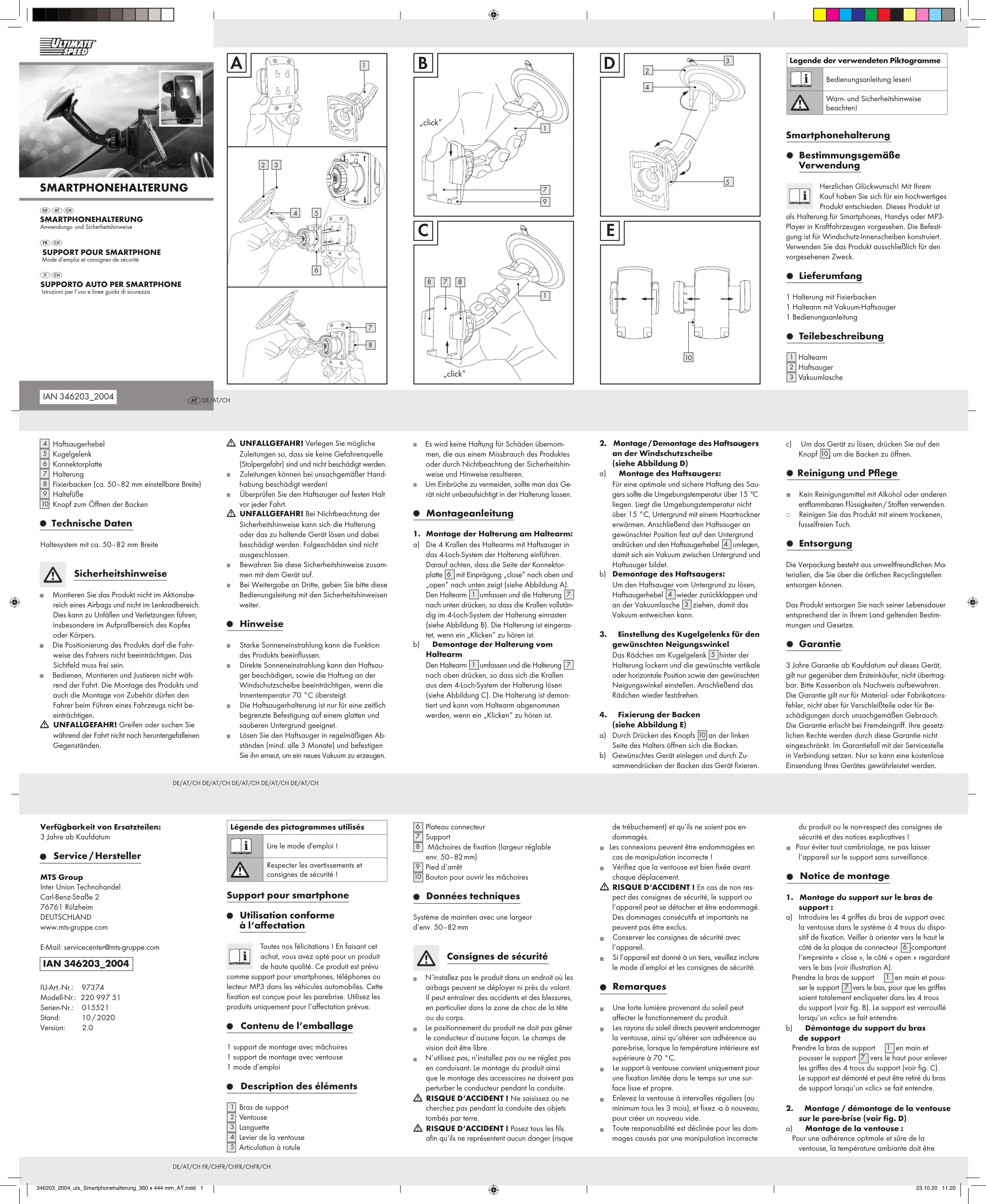 Istruzioni per l‘uso e linee guida di sicurezza SUPPORT POUR SMARTPHONE Mode d’emploi et consignes de sécurité Support pour smartphone Utilisation conforme à l‘affectation Toutes nos félicitations ! En faisant cet achat, vous avez opté pour un produit de haute qualité. Ce produit est prévu comme support pour smartphones, téléphones ou lecteur MP3 dans les véhicules automobiles. Cette fixation est conçue pour les parebrise. Utilisez les produits uniquement pour l‘affectation prévue. Contenu de l’emballage 1 support de montage avec mâchoires1 support de montage avec ventouse1 mode d’emploi Description des éléments