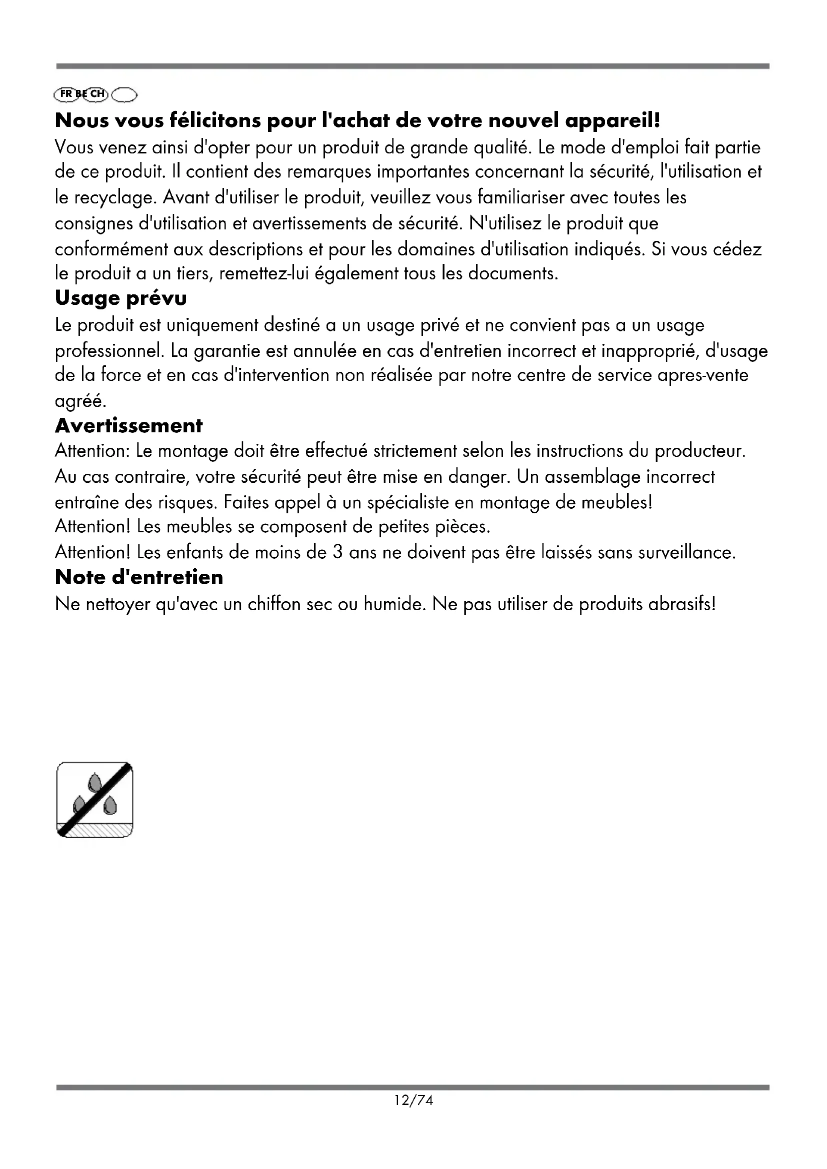 Garantie Chere cliente, cher client, cet appareil est garanti 3 ans a compter de la date d'achat. Si ce produit venait a présenter des vices, vous disposez de droits légaux envers le vendeur de ce produit. Ces droits légaux ne sont pas restreints par notre garantie présentée ci-dessous. Conditions de garantie La période de garantie débute a la date d'achat. Veillez a bien conserver le ticket de caisse. Celui-ci servira de preuve d'achat. Si dans un délai de 3 ans suivant la date d'achat de ce produit, un vice de matériel ou de fabrication venait a apparaître, le produit sera réparé, remplacé gratuitement par nos soins ou le prix d'achat remboursé, selon notre choix. Cette prestation sous garantie nécessite, dans le délai de 3 ans, la présentation de l'appa reil défectueux et du justificative d'achat (ticket de caisse) ainsi que la description écrite succincte du vice et du moment de son apparition. Si le vice est couvert par notre garantie, vous recevrez le produit réparé ou un nouveau produit en retour. Aucune nouvelle période de garantie ne débute avec la réparation ou l'échange du produit. Période de garantie et réclamation légale pour vices cachés L'exercice de la garantie ne prolonge pas la période de garantie. Cette disposition s'applique également aux pieces remplacées ou réparées. Les dommages et vices éventuellement déja présents a l'achat doivent etre signalés immédiatement apres le déballage. Toute réparation survenant apres la période sous garantie fera l'objet d'une facturation. Étendue de la garantie L'appareil a été fabriqué avec soin conformément a des directives de qualité strictes et consciencieusement contrôlé avant sa livraison. La prestation de la garantie s'applique aux vices de matériel et de fabrication. Cette garantie ne s'étend pas aux pieces du produit qui sont exposées a une usure normale et peuvent de ce fait etre considérées comme pieces d'usure, ni aux détériorations de pieces fragiles, par ex. interrupteurs ou pieces en verre. Cette garantie devient caduque si le produit est détérioré, utilisé ou entretenu de maniere non conforme. Toutes les instructions listées dans le manuel d'utilisation doivent etre exactement respectées pour une utilisation conforme du produit. Des buts d'utilisation et actions qui sont déconseillés dans le manuel d'utilisation, ou dont vous etes avertis doivent également etre évités. Article L217-4 du Code de la consommation Le vendeur livre un bien conforme au contrat et repond des defauts de conformite existant lors de la delivrance. Il repond egalement des defauts de conformite resultant de l'emballage, des instructions de montage ou de l'installation lorsque celle-ci a ete mise a sa charge par le contrat ou a ete realisee sous sa responsabilite. BE CH14/74