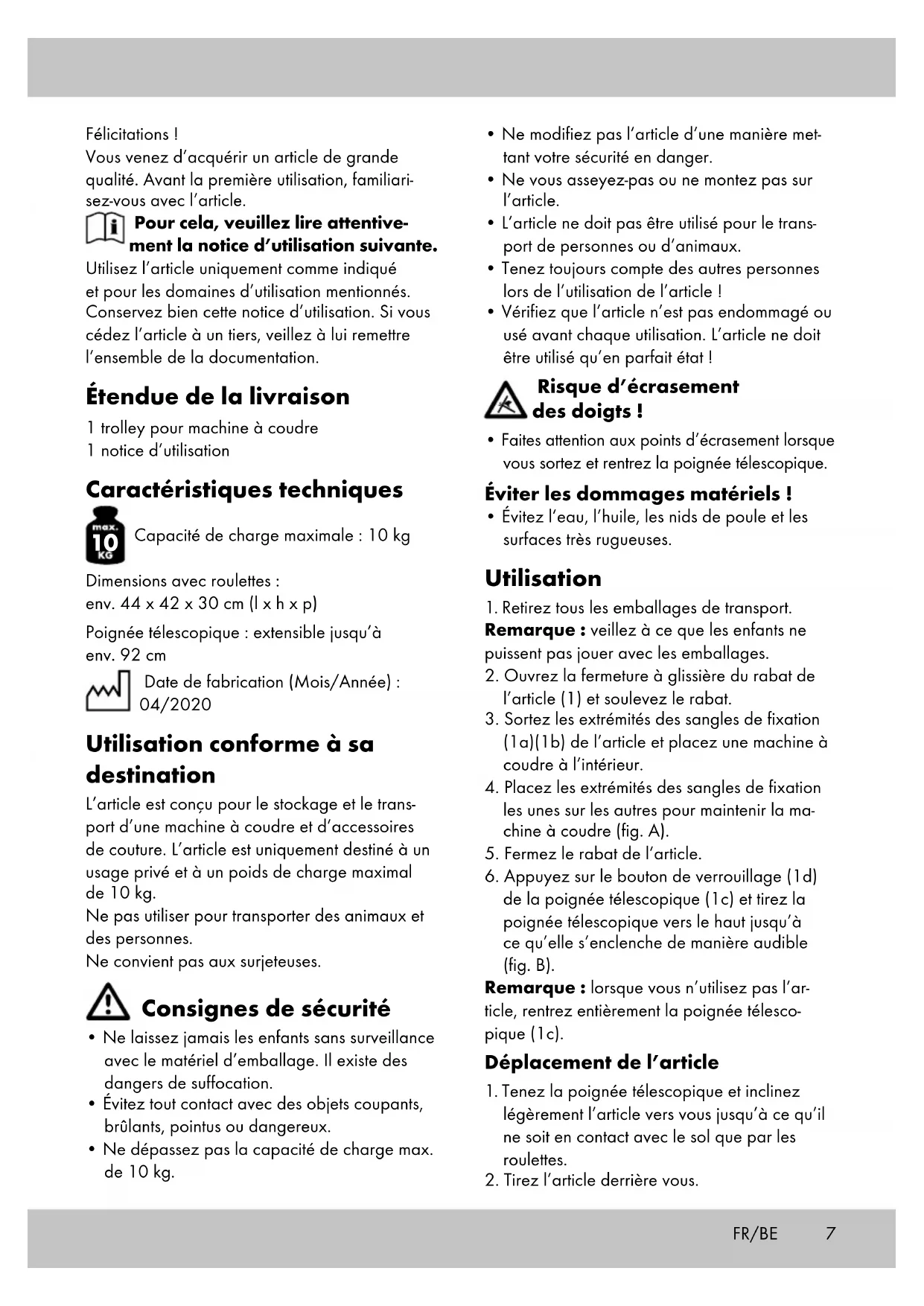 Capacité de charge maximale : 10 kg Dimensions avec roulettes : env. 44 x 42 x 30 cm (l x h x p) Poignée télescopique : extensible jusqu’à env. 92 cm Date de fabrication (Mois/Année) : 04/2020 Utilisation conforme à sa destination L’article est conçu pour le stockage et le trans- port d’une machine à coudre et d’accessoires de couture. L’article est uniquement destiné à un usage privé et à un poids de charge maximal de 10 kg. Ne pas utiliser pour transporter des animaux et des personnes. Ne convient pas aux surjeteuses. Consignes de sécurité