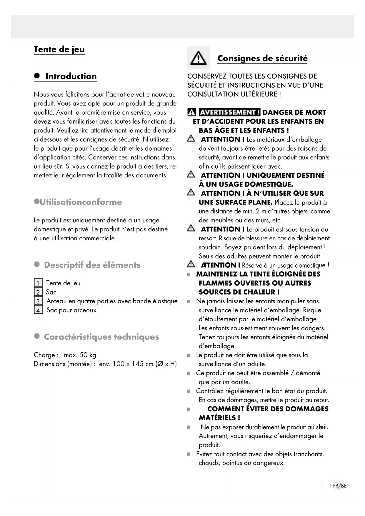 ou can return a defective product to us free of ch arge to the service address that will be provided to you. Ensure that you enclose the proof of purchase (till10 GB/IE receipt) and information about what the defect is and when it occurred. Service Service Great Britain Tel.: 0800 404 7657 E-Mail: owim@lidl.co.uk Service Ireland Tel.: 1890 930 034 (0,08 EUR / Min., (peak)) (0,06 EUR / Min., (off peak)) E-Mail: owim@lidl.ie11 FR/BE Tente de jeu Introduction Nous vous félicitons pour l‘achat de votre nouveau produit. Vous avez opté pour un produit de grande qualité. Avant la première mise en service, vous devez vous familiariser avec toutes les fonctions du produit. Veuillez lire attentivement le mode d’emploi ci-dessous et les consignes de sécurité. N’utilisez le produit que pour l’usage décrit et les domaines d’application cités. Conserver ces instructions dans un lieu sûr. Si vous donnez le produit à des tiers, re- mettez-leur également la totalité des documents. Utilisation conforme Le produit est uniquement destiné à un usage domestique et privé. Le produit n‘est pas destiné à une utilisation commerciale. Descriptif des éléments