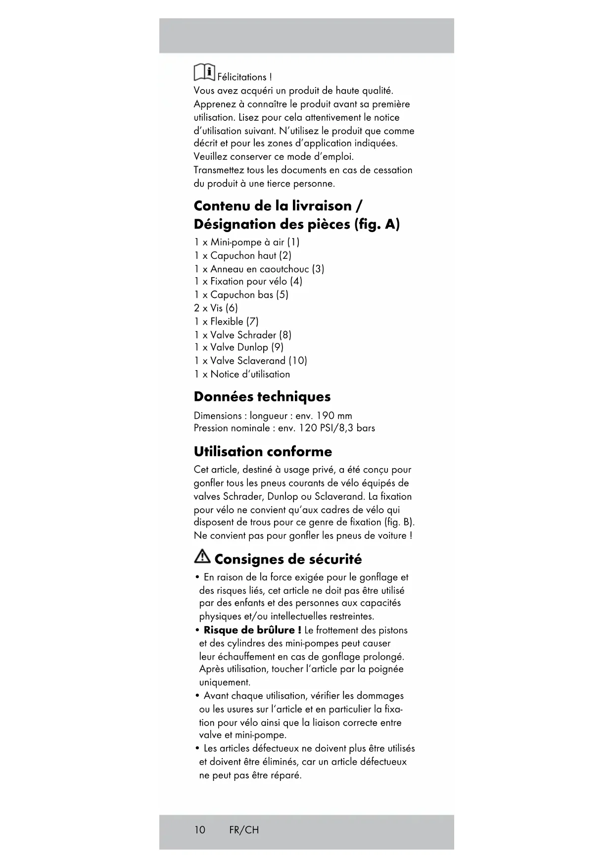 - Avant chaque utilisation, vérifier les dommages ou les usures sur l‘article et en particulier la fixa- tion pour vélo ainsi que la liaison correcte entre valve et mini-pompe.