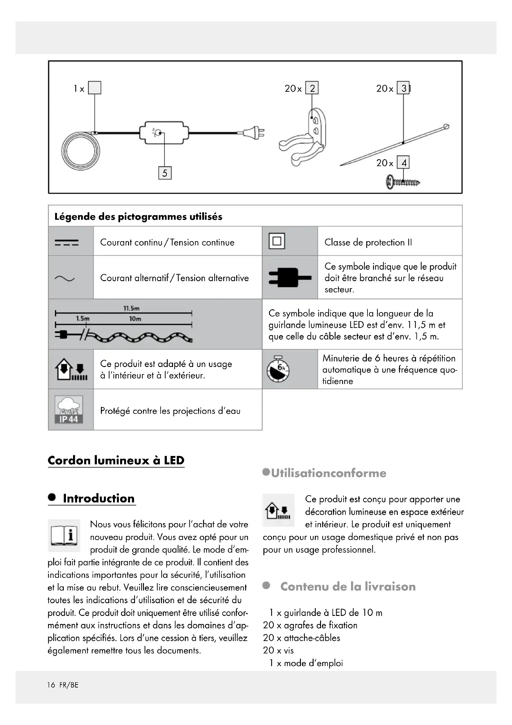 est protégée contre les projections d‘eau (IP44). Cet indice de protec- tion est uniquement assuré si la prise de courant utilisée est au moins conforme à cet indice de protection. Assurez-vous que la guirlande à LED