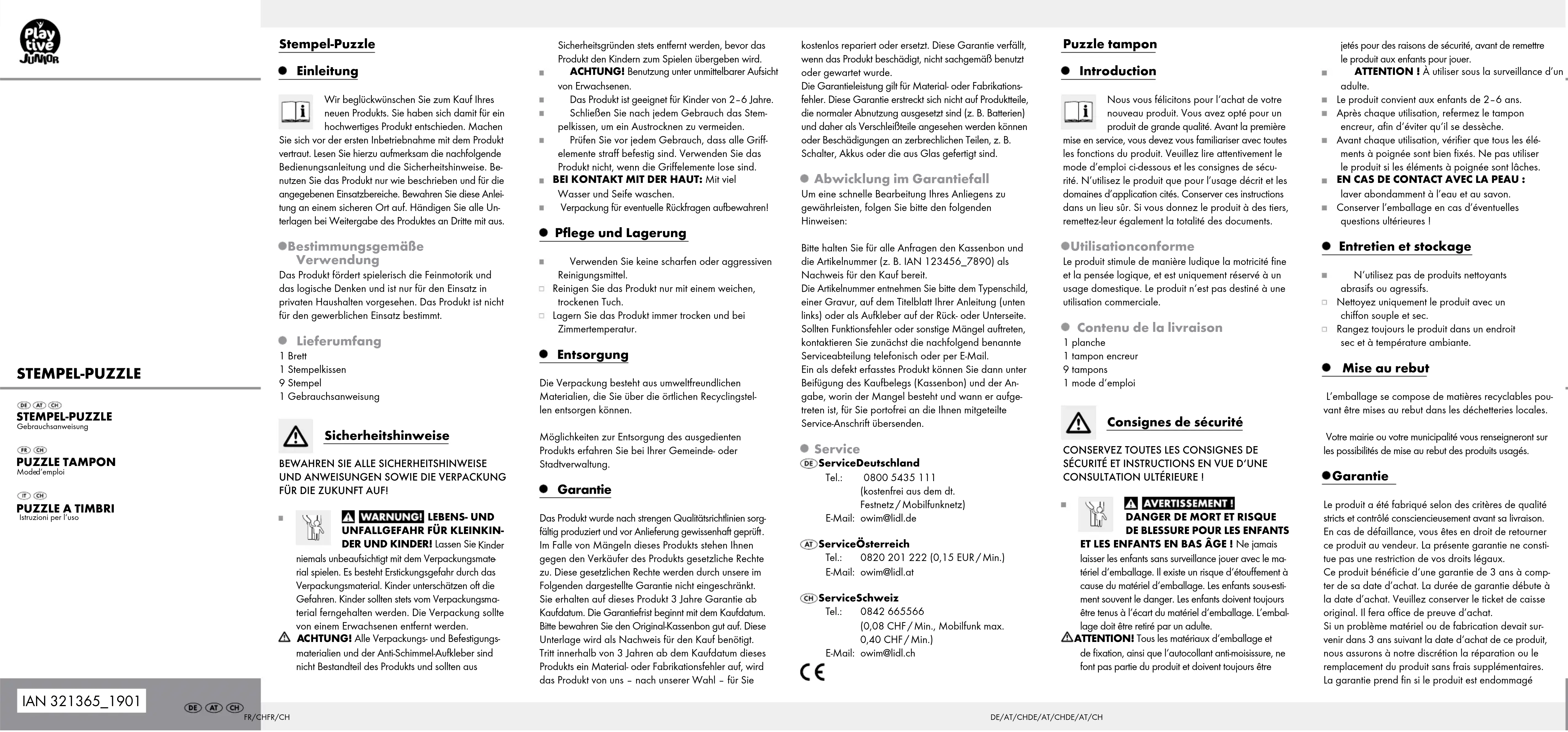FR/CH FR/CH jetés pour des raisons de sécurité, avant de remettre le produit aux enfants pour jouer. ATTENTION ! À utiliser sous la surveillance d’un adulte. Le produit convient aux enfants de 2–6 ans. Après chaque utilisation, refermez le tampon encreur, afin d‘éviter qu‘il se dessèche. Avant chaque utilisation, vérifier que tous les élé- ments à poignée sont bien fixés. Ne pas utiliser le produit si les éléments à poignée sont lâches. EN CAS DE CONTACT AVEC LA PEAU : laver abondamment à l’eau et au savon. Conserver l’emballage en cas d’éventuelles questions ultérieures ! Entretien et stockage N‘utilisez pas de produits nettoyants abrasifs ou agressifs. Nettoyez uniquement le produit avec un chiffon souple et sec. Rangez toujours le produit dans un endroit sec et à température ambiante. Mise au rebut L’emballage se compose de matières recyclables pou- vant être mises au rebut dans les déchetteries locales. Votre mairie ou votre municipalité vous renseigneront sur les possibilités de mise au rebut des produits usagés. Garantie Le produit a été fabriqué selon des critères de qualité stricts et contrôlé consciencieusement avant sa livraison. En cas de défaillance, vous êtes en droit de retourner ce produit au vendeur. La présente garantie ne consti- tue pas une restriction de vos droits légaux. Ce produit bénéficie d‘une garantie de 3 ans à comp- ter de sa date d’achat. La durée de garantie débute à la date d’achat. Veuillez conserver le ticket de caisse original. Il fera office de preuve d’achat. Si un problème matériel ou de fabrication devait sur- venir dans 3 ans suivant la date d‘achat de ce produit, nous assurons à notre discrétion la réparation ou le remplacement du produit sans frais supplémentaires. La garantie prend fin si le produit est endommagé Puzzle tampon Introduction Nous vous félicitons pour l‘achat de votre nouveau produit. Vous avez opté pour un produit de grande qualité. Avant la première mise en service, vous devez vous familiariser avec toutes les fonctions du produit. Veuillez lire attentivement le mode d’emploi ci-dessous et les consignes de sécu- rité. N’utilisez le produit que pour l’usage décrit et les domaines d’application cités. Conserver ces instructions dans un lieu sûr. Si vous donnez le produit à des tiers, remettez-leur également la totalité des documents. Utilisation conforme Le produit stimule de manière ludique la motricité fine et la pensée logique, et est uniquement réservé à un usage domestique. Le produit n‘est pas destiné à une utilisation commerciale. Contenu de la livraison 1 planche 1 tampon encreur 9 tampons 1 mode d‘emploi Consignes de sécurité