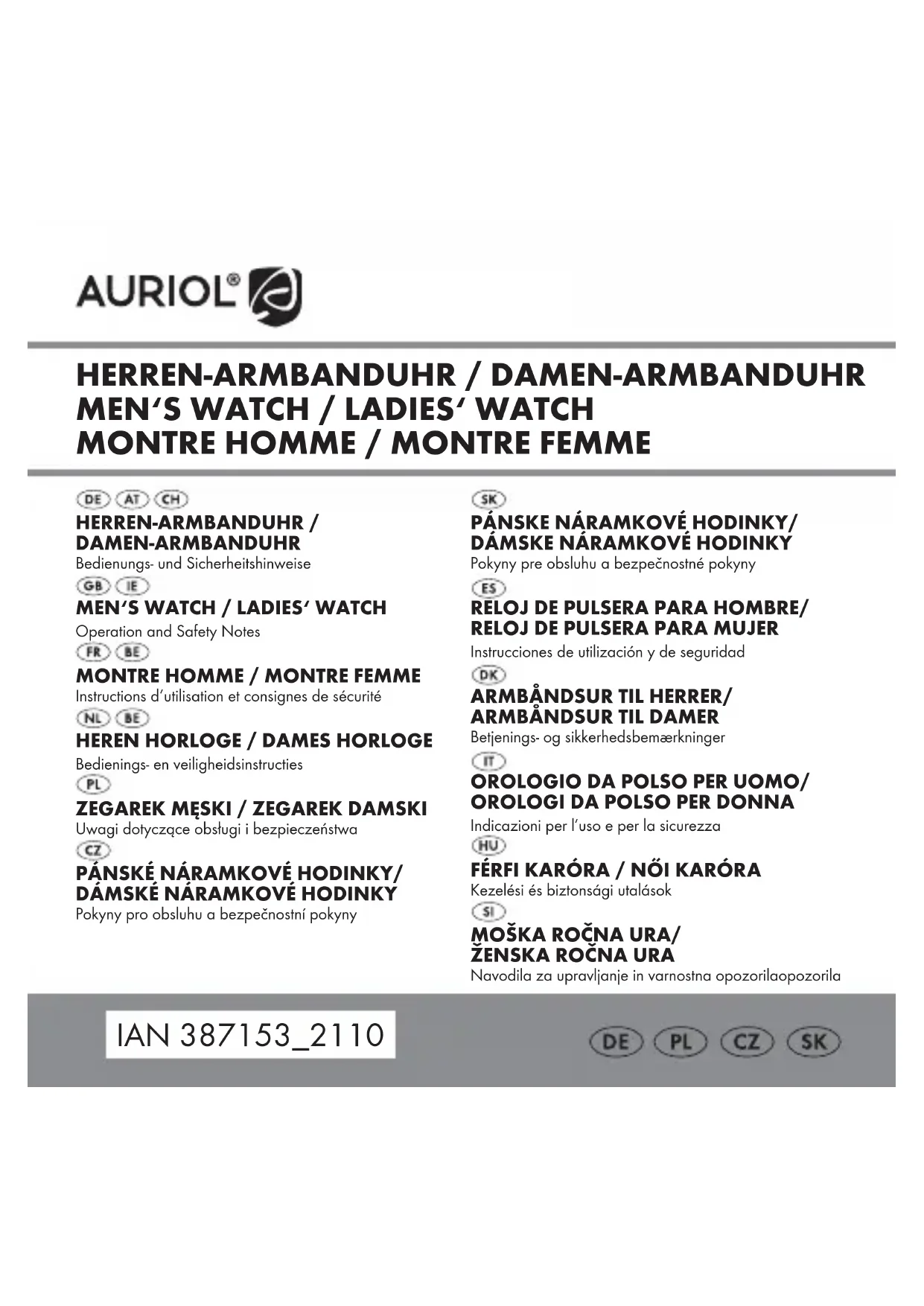 - s‘il présente les qualités qu‘un acheteur peut légitimement attendre eu égard aux déclarations publiques faites par le38 FR/BE vendeur, par le producteur ou par son représentant, notamment dans la publicité ou l‘étiquetage ; 2° Ou s‘il présente les caractéristiques définies d‘un commun accord par les parties ou être propre à tout usage spécial recherché par l‘acheteur, porté à la connaissance du vendeur et que ce dernier a accepté. Article L217-12 du Code de la consommation L‘action résultant du défaut de conformité se prescrit par deux ans à compter de la délivrance du bien. Article 1641 du Code civil Le vendeur est tenu de la garantie à raison des défauts cachés de la chose vendue qui la rendent impropre à l‘usage auquel on la destine, ou qui diminuent tellement cet usage que l‘acheteur ne l‘aurait pas acquise, ou n‘en aurait donné qu‘un moindre prix, s‘il les avait connus. Article 1648 1er alinéa du Code civil L‘action résultant des vices rédhibitoires doit être intentée par l‘acquéreur dans un délai de deux ans à compter de la découverte du vice. Les pièces détachées indispensables à l’utilisation du produit sont disponibles pendant la durée de la garantie du produit.39 FR/BE Le produit a été fabriqué selon des critères de qualité stricts et contrôlé consciencieusement avant sa livraison. En cas de défaillance, vous êtes en droit de retourner ce produit au vendeur. La présente garantie ne constitue pas une restriction de vos droits légaux. Ce produit bénéficie d‘une garantie de 3 ans à compter de sa date d’achat. La durée de garantie débute à la date d’achat. Veuillez conserver le ticket de caisse original. Il fera office de preuve d’achat. Si un problème matériel ou de fabrication devait survenir dans 3 ans suivant la date d‘achat de ce produit, nous assurons à notre discrétion la réparation ou le remplacement du produit sans frais supplémentaires. La garantie prend fin si le produit est endommagé suite à une utilisation inappropriée ou à un entretien défaillant. La garantie couvre les vices matériels et de fabrication. Cette garantie ne s’étend ni aux pièces du produit soumises à une usure normale (p. ex. des piles) et qui, par conséquent, peuvent être considérées comme des pièces d’usure, ni aux dommages sur des composants fragiles, comme des interrupteurs, des batteries ou des éléments fabriqués en verre.40 FR/BE P Faire valoir sa garantie Pour garantir la rapidité d’exécution de la procédure de garantie, veuillez respecter les indications suivantes : Veuillez conserver le ticket de caisse et la référence du produit (IAN 387153_2110) à titre de preuve d’achat pour toute demande. Le numéro de référence de l’article est indiqué sur la plaque d’identification, gravé sur la page de titre de votre manuel (en bas à gauche) ou sur un autocollant apposé sur la face arrière ou inférieure du produit. En cas de dysfonctionnement du produit, ou de tout autre défaut, contactez en premier lieu le service après-vente par téléphone ou par e-mail aux coordonnées indiquées ci-dessous. Vous pouvez alors envoyer franco de port tout produit considéré comme défectueux au service clientèle indiqué, accompagné de la preuve d’achat (ticket de caisse) et d’une description écrite du défaut avec mention de sa date d’apparition.41 FR/BE P Service après-vente Service après-vente France Tél.: 0800904879 E-Mail: owim@lidl.fr Service après-vente Belgique Tél.: 080071011 Tél.: 80023970 (Luxembourg) E-Mail: owim@lidl.be42 NL/BE Overzicht gebruikte pictogrammen ..............Pagina 43 Inleiding ........................................Pagina 43 Beoogd gebruik ................................Pagina 44 Onderdelenbeschrijving .........................Pagina 44 Technische gegevens.............................Pagina 45 Leveringsomvang................................Pagina 45 Voor gebruik ....................................Pagina 45 Batterij vervangen ...............................Pagina 45 Tijd instellen.....................................Pagina 45 Waterdichtheid..................................Pagina 46 Lengte horlogebandje aanpassen (HG09306C) .......Pagina 46 Schakels verwijderen ............................Pagina 46 Vervangen van de pin in de schuif (afb. D, E, F)........Pagina 47 Schoonmaken en onderhoud.....................Pagina 48 Afvoer ..........................................Pagina 48 Garantie en service ...........................Pagina 49 Garantie ......................................Pagina 49 Afwikkeling in geval van garantie...................Pagina 50 Service .......................................Pagina 5143 NL/BE Overzicht gebruikte pictogrammen Gelijkstroom / -spanning Geschikt voor gebruik bij regen, handenwassen, opspattend water Geschikt voor gebruik bij douchen, de afwas doen, baden Geschikt voor gebruik bij zwemmen, snorkelen Geschikt voor gebruik bij het windsurfen, duiken De CE-markering duidt op conformiteit met relevante EU-richtlijnen die van toepassing zijn op dit product.