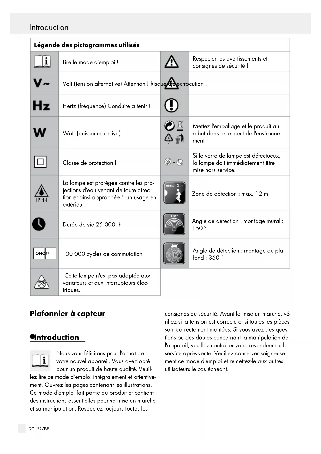 Angle de détection : montage au pla- fond : 360 ° Cette lampe n'est pas adaptée aux variateurs et aux interrupteurs élec- triques. Plafonnier à capteur Introduction Nous vous félicitons pour l'achat de votre nouvel appareil. Vous avez opté pour un produit de haute qualité. Veuil- lez lire ce mode d'emploi intégralement et attentive- ment. Ouvrez les pages contenant les illustrations. Ce mode d'emploi fait partie du produit et contient des instructions essentielles pour sa mise en marche et sa manipulation. Respectez toujours toutes les consignes de sécurité. Avant la mise en marche, vé- rifiez si la tension est correcte et si toutes les pièces sont correctement montées. Si vous avez des ques- tions ou des doutes concernant la manipulation de l'appareil, veuillez contacter votre revendeur ou le service après-vente. Veuillez conserver soigneuse- ment ce mode d'emploi et remettez-le aux autres utilisateurs le cas échéant. Introduction Introduction / Sécurité23 FR/BE Utilisation conforme Cette lampe est conçue pour un usage en intérieur et en extérieur. Cette lampe peut être fixée sur toutes les surfaces normalement inflammables. L'électricien qui a installé cette lampe doit veiller à ce qu'elle ne soit pas placée sur une surface hu- mide ou conductrice ! Ce produit est uniquement destiné à un usage domestique et privé. Contenu de la livraison Immédiatement après le déballage du produit, veuillez toujours contrôler que le contenu de la li- vraison est complet et que le produit se trouve en parfait état. 1 Plafonnier à capteur 1 ampoule LED (5,5 W, E27) (non variable) Matériel de montage (chevilles et vis) 1 mode d'emploi Description des éléments