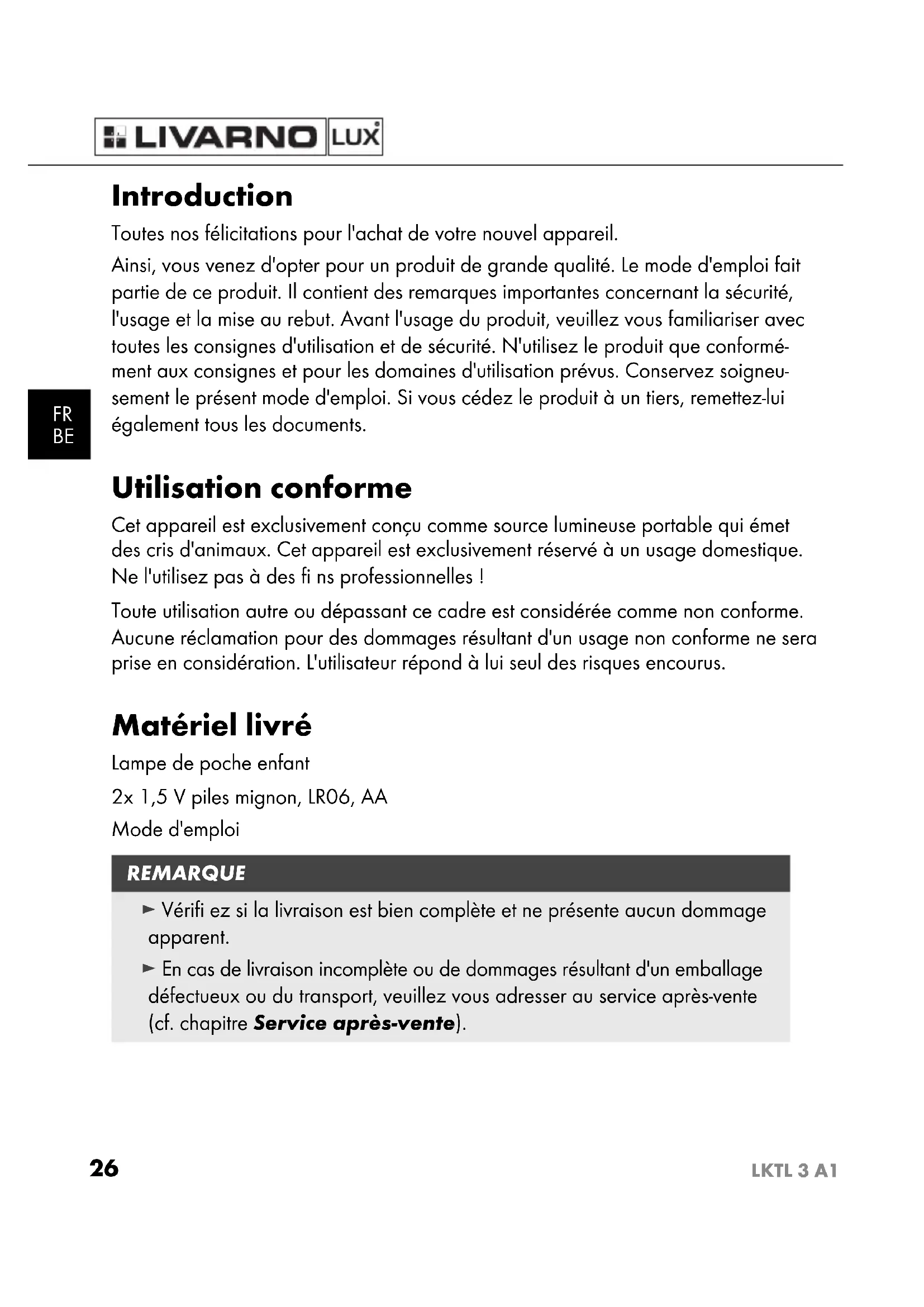 LKTL 3 A1 Introduction Toutes nos félicitations pour l'achat de votre nouvel appareil. Ainsi, vous venez d'opter pour un produit de grande qualité. Le mode d'emploi fait partie de ce produit. Il contient des remarques importantes concernant la sécurité, l'usage et la mise au rebut. Avant l'usage du produit, veuillez vous familiariser avec toutes les consignes d'utilisation et de sécurité. N'utilisez le produit que conformé- ment aux consignes et pour les domaines d'utilisation prévus. Conservez soigneu- sement le présent mode d'emploi. Si vous cédez le produit à un tiers, remettez-lui également tous les documents. Utilisation conforme Cet appareil est exclusivement conçu comme source lumineuse portable qui émet des cris d'animaux. Cet appareil est exclusivement réservé à un usage domestique. Ne l'utilisez pas à des fi ns professionnelles ! Toute utilisation autre ou dépassant ce cadre est considérée comme non conforme. Aucune réclamation pour des dommages résultant d'un usage non conforme ne sera prise en considération. L'utilisateur répond à lui seul des risques encourus. Matériel livré Lampe de poche enfant 2x 1,5 V piles mignon, LR06, AA Mode d'emploi REMARQUE ► Vérifi ez si la livraison est bien complète et ne présente aucun dommage appar ent. ► En cas de livraison incomplète ou de dommages résultant d'un emballage défectueux ou du tr ansport, veuillez vous adresser au service après-vente (cf. chapitre Service après-vente). IB_94068_LKTL3A1_LB3.indb 26IB_94068_LKTL3A1_LB3.indb 26 04.11.13 16:5904.11.13 16:59 125 mm x 160 mmFR
