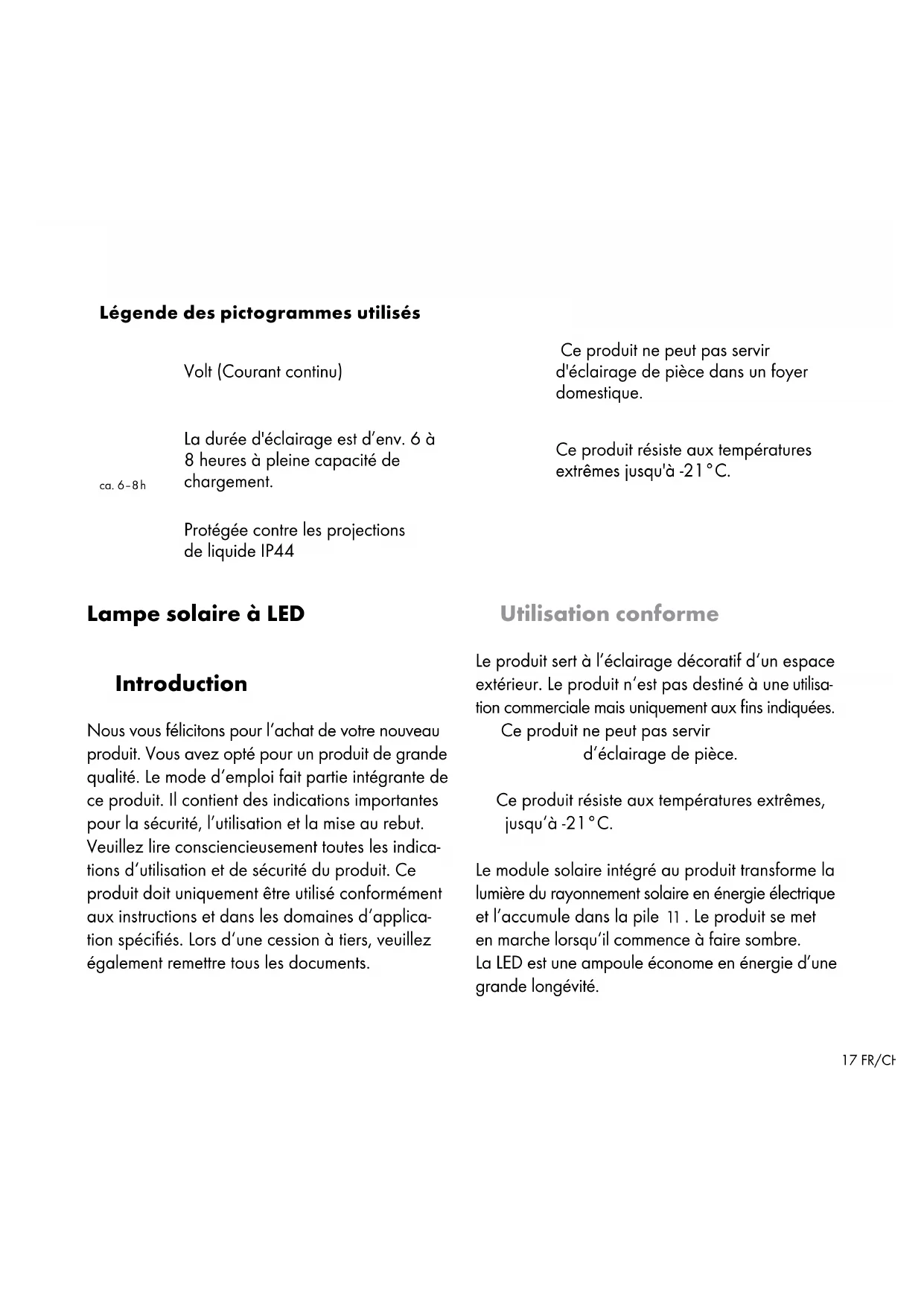 POUR LES BÉBÉS ET LES EN- FANTS! Les piles sont à garder hors de portée des en- fants. Ne laissez pas traîner les piles à la vue de tous. Les enfants ou les animaux domestiques risqueraient de les avaler. En cas d‘ingestion, consultez immédiatement un médecin. Les enfants ou personnes manquant de connais- sances ou d’expérience dans la manipulation du produit, ou limitées dans leurs capacités physiques, sensorielles ou mentales, ne doivent pas utiliser ce produit sauf sous la surveillance ou la direction d’une personne responsable de leur sécurité. Les enfants doivent être surveillés pour qu‘ils ne jouent pas avec le produit. Ne jamais laisser les enfants manipuler sans surveillance le matériel d’emballage. L‘embal- lage présente un risque d‘étouffement. Les en- fants sous-estiment souvent le danger. Toujours tenir le produit à l‘écart des enfants. Ce produit n‘est pas un jouet, il doit être tenu hors de portée des enfants. Les enfants ne sont pas en mesure de reconnaître les dangers liés à des produits électriques. Ne pas utiliser ce produit si vous constatez le moindre endommagement. La LED n‘est pas remplaçable. Si la LED arrive en fin de vie, l‘ensemble du produit doit alors être remplacé. RISQUE D’EXPLOSION ! N’utilisez pas le produit dans un environnement soumis à un risque d’explosion, où se trouvent des liquides, gaz ou poussières inflammables.20 FR/CH Instructions de sécurité spécifiques au produit N‘exposez pas le produit à de fortes vibrations ni à des sollicitations mécaniques importantes. Veillez à ce que le module solaire