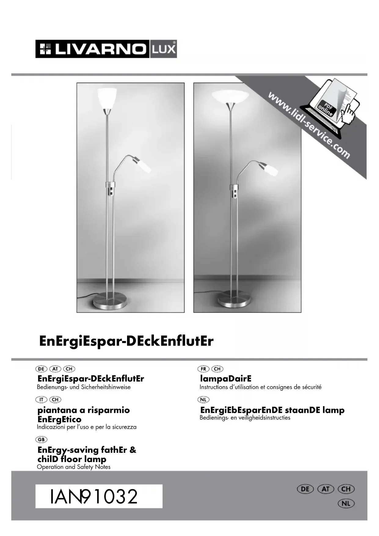 CUTION! Pour des raisons relevant de la sécurité électrique, ne jamais nettoyer la lampe à l’eau ou avec d’autres liquides, ni la plonger dans l’eau. Ne pas utiliser de solvants, essence ou autres. Ceci endommage la lampe. Pour le nettoyage, utilisez uniquement un chiffon sec ne bourrant pas. Mise au rebut L’emballage et les matériaux d’emballage se com- posent exclusivement de matières recyclables. Vous pouvez les mettre au rebut dans les conteneurs de recyclage locaux. Le symbole de poubelle rayé sur les roues signifie que dans l’Union Européenne, ce produit doit être mis au rebut séparément. Ceci s’applique au produit ainsi qu’à tous les accessoires portant ce symbole. Les produits ainsi signalés ne doivent pas être mis au rebut dans les ordures ménagères, mais dans un centre de collecte pour le recyclage des appareils électriques et électro- niques. Le recyclage aide à réduire la consommation en matières premières et à préserver l’environnement. Garantie et service après-vente Déclaration de garantie Indépendamment de la garantie commerciale sous- crite, le vendeur reste tenu des défauts de conformité du bien et des vices rédhibitoires dans les conditions prévues aux articles L211-4 et suivants du Code de la consommation et aux articles 1641 et suivants du Code Civil. 3 ans de garantie à partir de la date d‘achat pour cet appareil, uniquement valables pour le premier acheteur, non transférables. Conservez le ticket de caisse en tant que justificatif. La prestation de ga- rantie couvre uniquement les vices matériels ou de fabrication, mais pas les pièces d‘usures, ni les en- dommagements dus à un usage incorrect. La ga- rantie est annulée en cas d‘intervention externe. Cette garantie ne constitue pas une restriction de vos droits légaux. Si vous voulez faire fonctionner votre garantie, veuillez contacter le S.A.V. par télé- phone. Il est autrement impossible d‘assurer l‘envoi gratuit de votre appareil. Adresse du service après-vente Briloner Leuchten GmbH Im Kissen 2, 59929 Brilon, Allemagne Tél. : +49 (0) 29 61 / 97 12 - 0 Fax : +49 (0) 29 61 / 97 12 - 199 Courriel : Info@briloner.de www.briloner.de Numéro de service gratuit Tél. : 00800 / 2745663716 FR/CH IndiceGarantie et service après-vente IAN 91032 Veuillez conserver le ticket de caisse et le numéro de référence de l’article (par ex. IAN 12345) afin de les produire à titre de preuves d’achat pour toute demande. Déclaration de conformité Ce produit est conforme aux exigences des directives européennes et nationales applicables (compatibilité électromagnétique 2004 / 108 / EC, directive basse tension 2006 / 95 / EC, directive écodesign 2009 / 125 / EG, directive RoHS 2011 / 65 / EU). La conformité a été attestée. Les déclarations et docu- ments respectifs sont en possession du fabricant. Fabricant Briloner Leuchten GmbH Im Kissen 2 59929 Brilon Allemagne17 IT/CH Indice Introduzione Uso corretto ..................................................................................................................................... Pagina 18 Fornitura ........................................................................................................................................... Pagina 18 Descrizione dei pezzi ..................................................................................................................... Pagina 18 Dati tecnici ....................................................................................................................................... Pagina 18 Sicurezza Indicazioni per la sicurezza ........................................................................................................... Pagina 19 Messa in funzione Montaggio della lampada ............................................................................................................. Pagina 20 Accensione / spegnimento della lampada .................................................................................... Pagina 20 Posizionamento della lampada ..................................................................................................... Pagina 20 Sostituire le lampade ...................................................................................................................... Pagina 21 Manutenzione e pulizia .................................................................................................. Pagina 21 Smaltimento .............................................................................................................................. Pagina 21 Garanzia e servizio Dichiarazione di garanzia ............................................................................................................. Pagina 21 Indirizzo servizio clienti .................................................................................................................. Pagina 22 Dichiarazione di conformità ........................................................................................................... Pagina 22 Produttore ........................................................................................................................................ Pagina 22 Garantie et service après-vente18 IT/CH Introduzione / Sicurezza Introduzione Piantana a risparmio energetico Introduzione Ci congratuliamo con voi per l’acquisto del vostro nuovo prodotto. Avete optato per un prodotto di alta qualità. Per favore leggete bene e completamente questo manuale d’uso