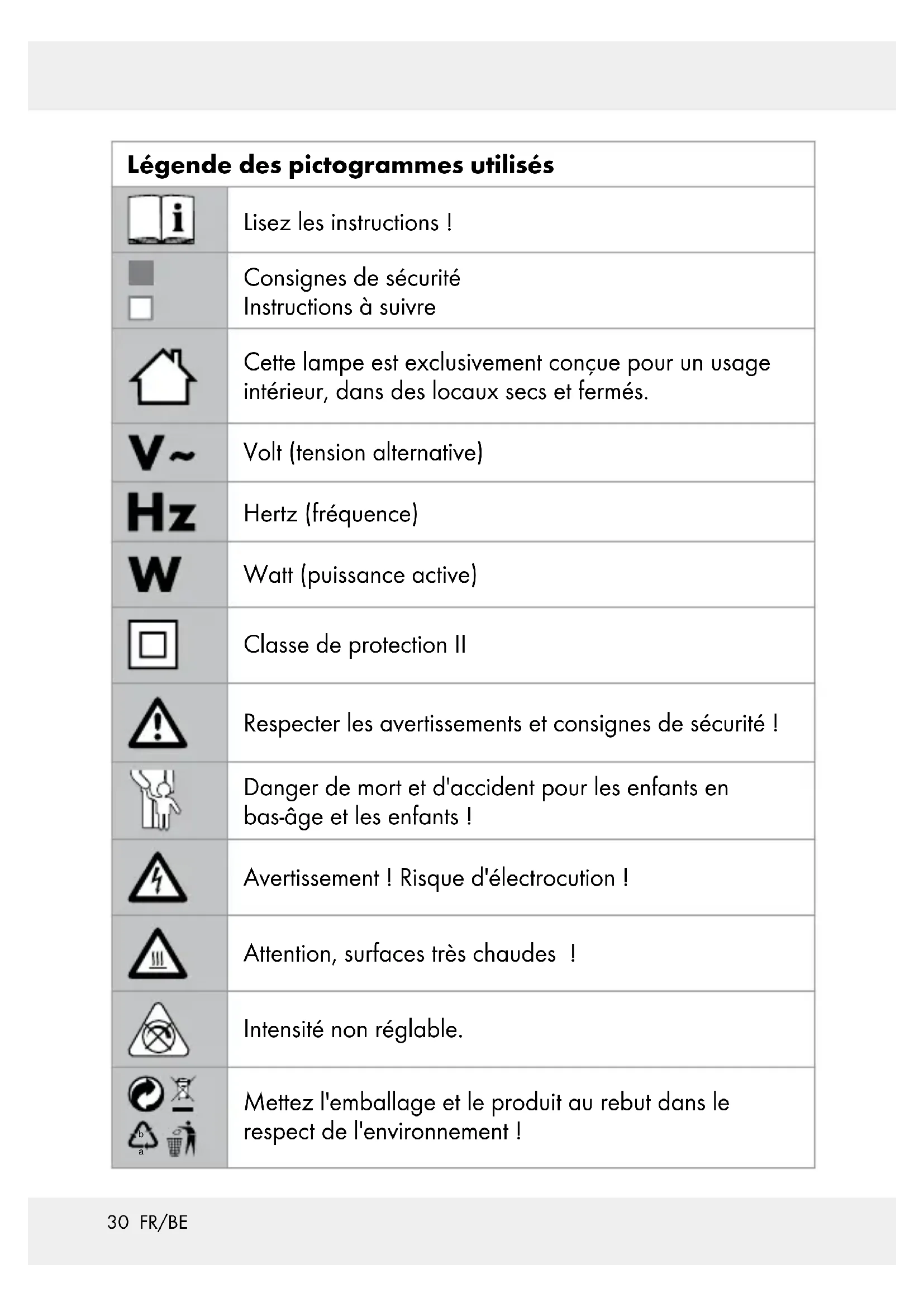 D‘ACCIDENT POUR LES ENFANTS EN BAS-ÂGE ET LES ENFANTS! Cet appareil peut être utilisé par des enfants de 8 ans et plus ainsi que par des personnes avec des capacités physiques, sensorielles ou psychiques réduites ou man- quant d‘expérience et de connaissance, s‘ils sont surveillés ou s‘ils ont été informés de l‘utilisation de l‘appareil de manière sûre et comprennent les risques découlant de son utilisation. Ne laissez pas les enfants jouer avec le produit. Le nettoyage et la maintenance34 FR/BE domestique de l’appareil ne doivent pas être effectués par un en- fant sans surveillance. Ne laissez pas la lampe ou le matériel d‘emballage traîner sans surveillance. Les films et les sachets en plastique, les éléments en matières synthétiques, etc. peuvent devenir des jouets dangereux dans les mains des enfants. Prévention de risques mortels par électrocution Il n’est assumé ni garantie ni responsabilité pour les dommages matériels ou corporels causés par une manipulation erronée ou le non respect des instructions de sécurité ! N’utilisez jamais votre lampe si vous constatez le moindre endom- magement. Avant chaque branchement sur le secteur, contrôlez le bon état de la lampe et du câble d‘alimentation avec la fiche secteur. Évitez impérativement tout contact de la lampe avec de l‘eau ou d‘autres liquides. N‘ouvrez jamais les composants électriques, et n‘y insérez jamais d‘objets quelconques. De telles interventions impliquent un danger de mort par électrocution. Uniquement saisir la fiche secteur par les parties isolées pour la brancher ou la débrancher ! Pour éviter toute mise en danger, le remplacement du câble flexible extérieur de cette lampe est exclusivement réservé au fabricant, à son représentant de maintenance ou à un spécialiste comparable ! Avant d‘utiliser l‘article, assurez-vous que la tension de secteur présente correspond bien à la tension de fonctionnement de la lampe (220 – 240 V