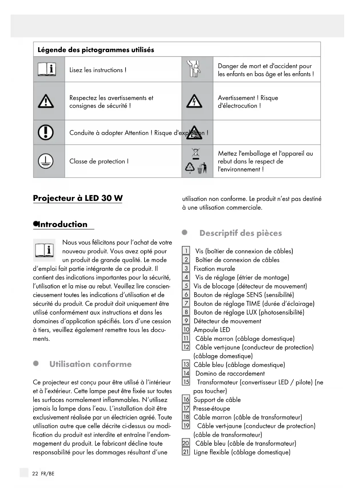 Mettez l'emballage et l'appareil au rebut dans le respect de l'environnement ! Projecteur à LED 30 W Introduction Nous vous félicitons pour l‘achat de votre nouveau produit. Vous avez opté pour un produit de grande qualité. Le mode d‘emploi fait partie intégrante de ce produit. Il contient des indications importantes pour la sécurité, l’utilisation et la mise au rebut. Veuillez lire conscien- cieusement toutes les indications d‘utilisation et de sécurité du produit. Ce produit doit uniquement être utilisé conformément aux instructions et dans les domaines d‘application spécifiés. Lors d‘une cession à tiers, veuillez également remettre tous les docu- ments. Utilisation conforme Ce projecteur est conçu pour être utilisé à l‘intérieur et à l’extérieur. Cette lampe peut être fixée sur toutes les surfaces normalement inflammables. N‘utilisez jamais la lampe dans l’eau. L‘installation doit être exclusivement réalisée par un électricien agréé. Toute utilisation autre que celle décrite ci-dessus ou modi- fication du produit est interdite et entraîne l’endom- magement du produit. Le fabricant décline toute responsabilité pour les dommages résultant d‘une utilisation non conforme. Le produit n’est pas destiné à une utilisation commerciale. Descriptif des pièces