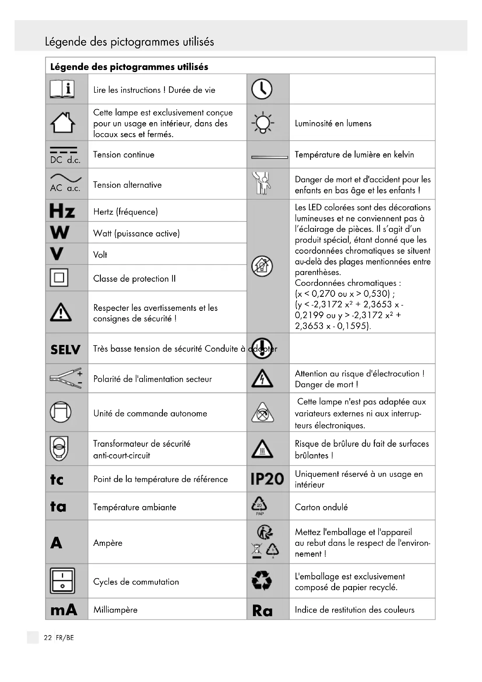 Indice de restitution des couleurs Introduction23 FR/BE Légende des pictogrammes utilisés Introduction Réglette à LED Introduction Félicitations pour l‘achat de votre nouvel appareil. Vous avez opté pour un produit de grande qualité. Veuillez lire ce mode d‘emploi intégralement et attentivement. Ce mode d‘emploi fait partie du produit et contient des instruc- tions essentielles pour sa mise en service et sa ma- nipulation. Respectez toujours toutes les consignes de sécurité. Avant la mise en service, vérifiez si la tension est correcte et si toutes les pièces sont cor- rectement montées. Si vous avez des questions ou des doutes concernant la manipulation de l‘appareil, veuillez contacter votre revendeur ou le service après- vente. Veuillez conserver soigneusement ce mode d‘emploi et remettez-le aux autres utilisateurs. Utilisation conforme Cette lampe est exclusivement conçue pour un usage intérieur, dans des locaux secs et fermés. Cette lampe est uniquement conçu pour un usage domestique privé et non pas pour un usage com- mercial. Toute utilisation autre que celle décrite ci- dessus est interdite et entraîne l’endommagement du produit. De plus, ceci comporte des risques tels que par ex. un court-circuit, un incendie, un choc électrique etc. Ce produit est prévu pour un fonc- tionnement normal. Les LED colorées sont des décorations lumineuses et ne conviennent pas à l‘éclairage de pièces. Il s‘agit d‘un produit spécial, étant donné que les coordonnées chromatiques se situent au-delà des plages men- tionnées entre parenthèses. Coordonnées chromatiques: (x < 0,270 ou x > 0,530); (y < -2,3172 x² + 2,3653 x - 0,2199 ou y > -2,3172 x² + 2,3653 x - 0,1595). Contenu de la livraison Immédiatement après avoir déballé l‘appareil, veuillez toujours vérifier que le matériel livré est complet et que l‘appareil se trouve en parfait état. 1 réglette lumineuse à LED, 14149505L / 14149506L 2 chevilles 2 vis 1 notice de montage et d‘utilisation Descriptif des pièces