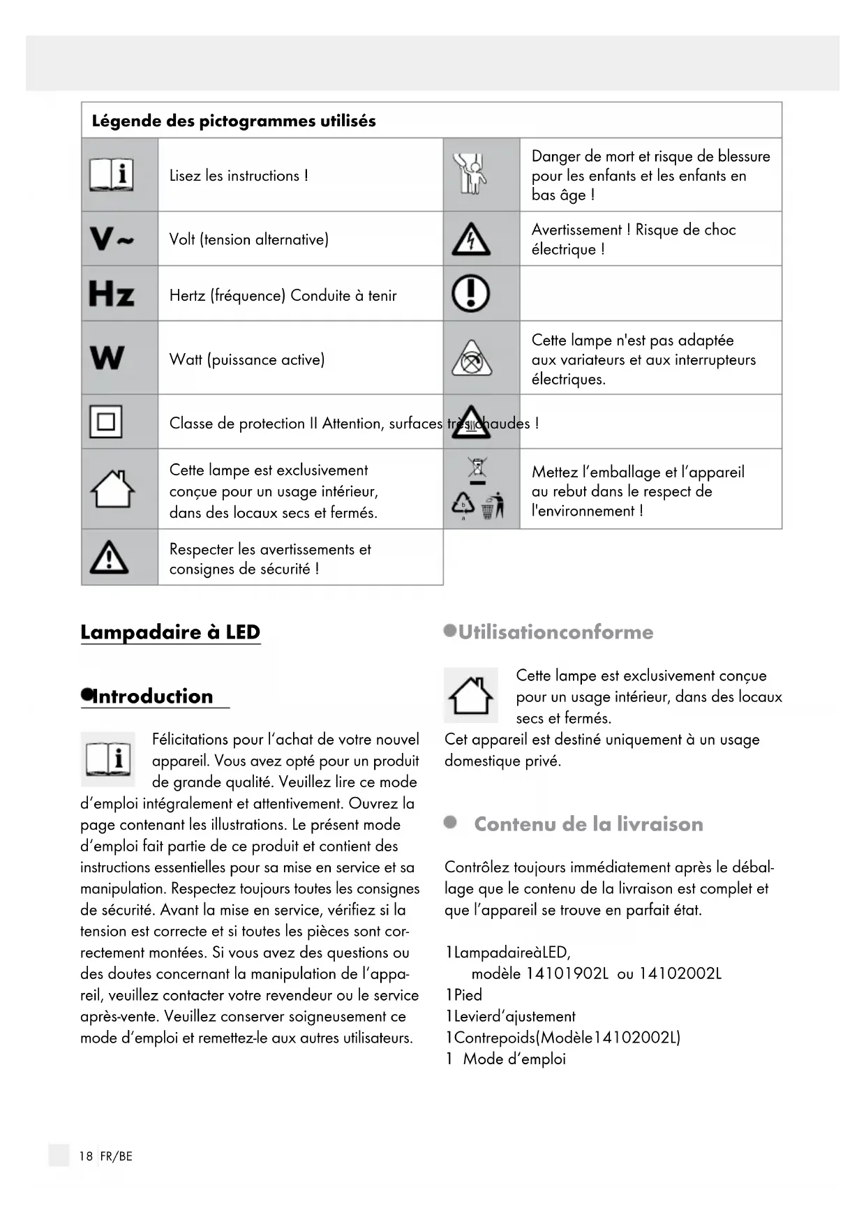 Mettez l’emballage et l’appareil au rebut dans le respect de l'environnement ! Respecter les avertissements et consignes de sécurité ! Lampadaire à LED Introduction Félicitations pour l‘achat de votre nouvel appareil. Vous avez opté pour un produit de grande qualité. Veuillez lire ce mode d‘emploi intégralement et attentivement. Ouvrez la page contenant les illustrations. Le présent mode d‘emploi fait partie de ce produit et contient des instructions essentielles pour sa mise en service et sa manipulation. Respectez toujours toutes les consignes de sécurité. Avant la mise en service, vérifiez si la tension est correcte et si toutes les pièces sont cor- rectement montées. Si vous avez des questions ou des doutes concernant la manipulation de l‘appa- reil, veuillez contacter votre revendeur ou le service après-vente. Veuillez conserver soigneusement ce mode d‘emploi et remettez-le aux autres utilisateurs. Utilisation conforme Cette lampe est exclusivement conçue pour un usage intérieur, dans des locaux secs et fermés. Cet appareil est destiné uniquement à un usage domestique privé. Contenu de la livraison Contrôlez toujours immédiatement après le débal- lage que le contenu de la livraison est complet et que l’appareil se trouve en parfait état. 1 Lampadaire à LED, modèle 14101902L ou 14102002L 1 Pied 1 Levier d‘ajustement 1 Contrepoids (Modèl e 14102002L) 1 Mode d‘emploi19 FR/BE Introduction / Sécurité Introduction Descriptif des pièces