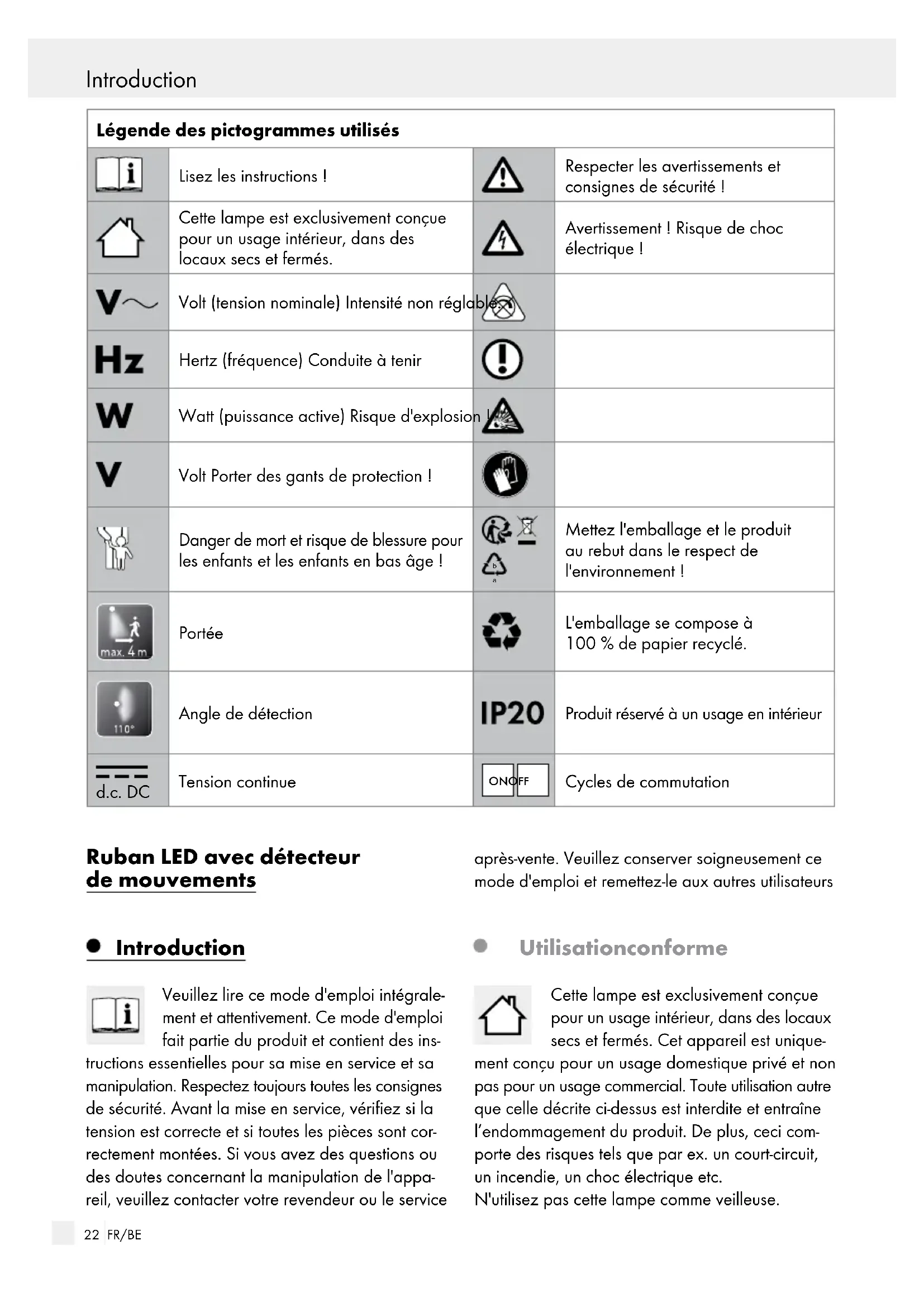 Mettez l'emballage et le produit au rebut dans le respect de l'environnement ! Portée L'emballage se compose à 100 % de papier recyclé. Angle de détection Produit réservé à un usage en intérieur d.c. DC Tension continue ON OFF Cycles de commutation Ruban LED avec détecteur de mouvements Introduction Veuillez lire ce mode d'emploi intégrale- ment et attentivement. Ce mode d'emploi fait partie du produit et contient des ins- tructions essentielles pour sa mise en service et sa manipulation. Respectez toujours toutes les consignes de sécurité. Avant la mise en service, vérifiez si la tension est correcte et si toutes les pièces sont cor- rectement montées. Si vous avez des questions ou des doutes concernant la manipulation de l'appa- reil, veuillez contacter votre revendeur ou le service après-vente. Veuillez conserver soigneusement ce mode d'emploi et remettez-le aux autres utilisateurs Utilisation conforme Cette lampe est exclusivement conçue pour un usage intérieur, dans des locaux secs et fermés. Cet appareil est unique- ment conçu pour un usage domestique privé et non pas pour un usage commercial. Toute utilisation autre que celle décrite ci-dessus est interdite et entraîne l’endommagement du produit. De plus, ceci com- porte des risques tels que par ex. un court-circuit, un incendie, un choc électrique etc. N'utilisez pas cette lampe comme veilleuse. Introduction / Sécurité23 FR/BE Introduction Introduction / Sécurité Contenu de la livraison Après le déballage du produit, contrôlez toujours et immédiatement que le contenu de la livraison est complet et que l’appareil se trouve en parfait état. 1 Ruban à LED 1 Bande adhésive 4 Piles 1,5 V AAA 1 Mode d'emploi Descriptif des pièces