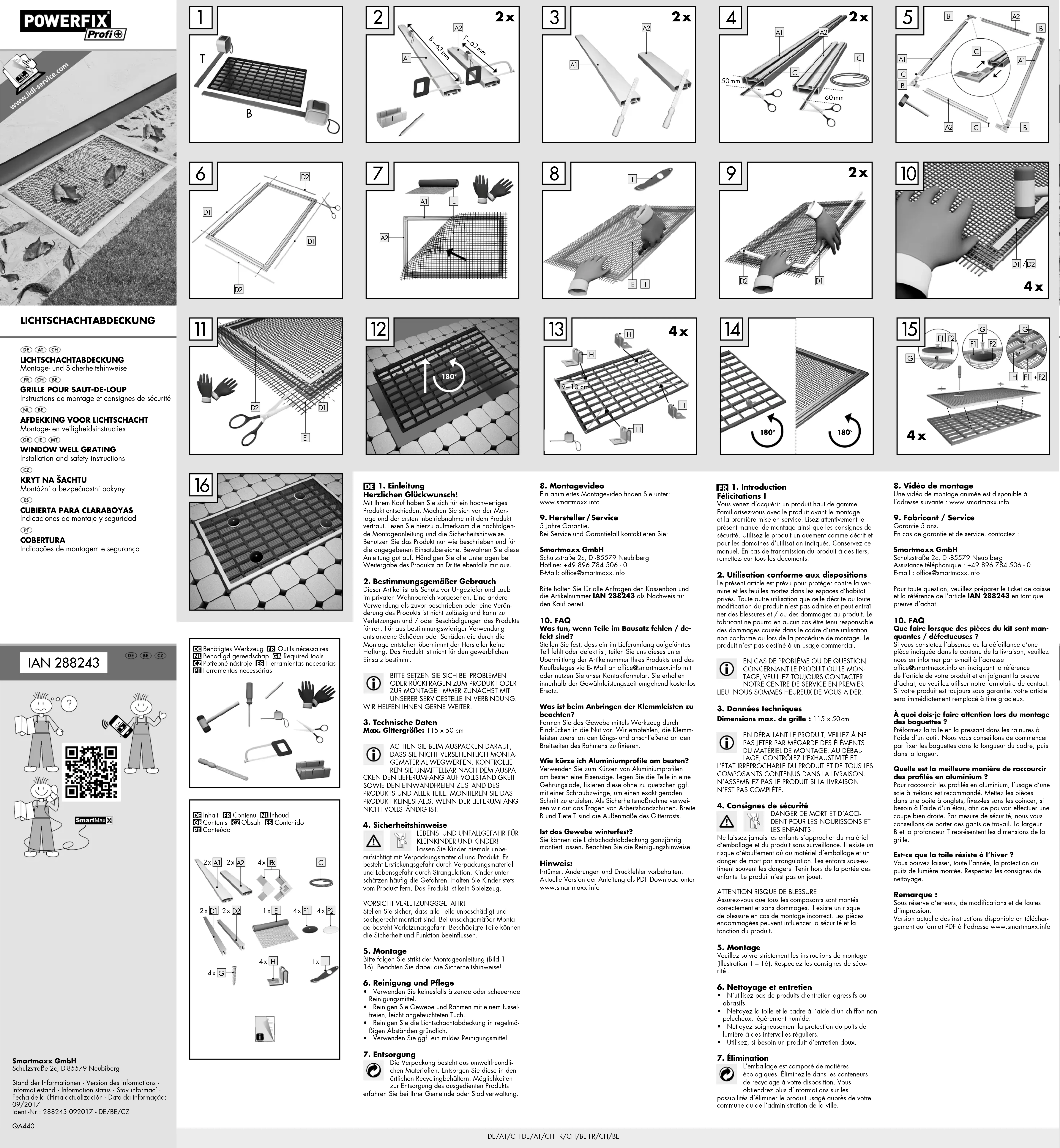 Que faire lorsque des pièces du kit sont man-quantes / défectueuses? Si vous constatez l’absence ou la défaillance d’une pièce indiquée dans le contenu de la livraison, veuillez nous en informer par e-mail à l’adresse office@smartmaxx.info en indiquant la référence de l’article de votre produit et en joignant la preuve d’achat, ou veuillez utiliser notre formulaire de contact. Si votre produit est toujours sous garantie, votre article sera immédiatement remplacé à titre gracieux.À quoi dois-je faire attention lors du montage des baguettes?Préformez la toile en la pressant dans les rainures à l’aide d’un outil. Nous vous conseillons de commencer par fixer les baguettes dans la longueur du cadre, puis dans la largeur.Quelle est la meilleure manière de raccourcir des profilés en aluminium?Pour raccourcir les profilés en aluminium, l’usage d’une scie à métaux est recommandé. Mettez les pièces dans une boîte à onglets, fixez-les sans les coincer, si besoin à l’aide d’un étau, afin de pouvoir effectuer une coupe bien droite. Par mesure de sécurité, nous vous conseillons de porter des gants de travail. La largeur B et la profondeur T représentent les dimensions de la grille.Est-ce que la toile résiste à l’hiver?Vous pouvez laisser, toute l’année, la protection du puits de lumière montée. Respectez les consignes de nettoyage. Remarque: Sous réserve d’erreurs, de modifications et de fautes d’impression. Version actuelle des instructions disponible en téléchar-gement au format PDF à l’adresse www.smartmaxx.info DE/AT/CH DE/AT/CH FR/CH/BE FR/CH/BESmartmaxx GmbHSchulzstraße 2c, D-85579 Neubiberg Stand der Informationen · Version des informations · Informatiestand · Information status · Stav informací ·Fecha de la última actualización · Data da informação: 09/2017Ident.-Nr.: 288243 092017 - DE/BE/CZ QA440VIDEO IAN 288243 LICHTSCHACHTABDECKUNG