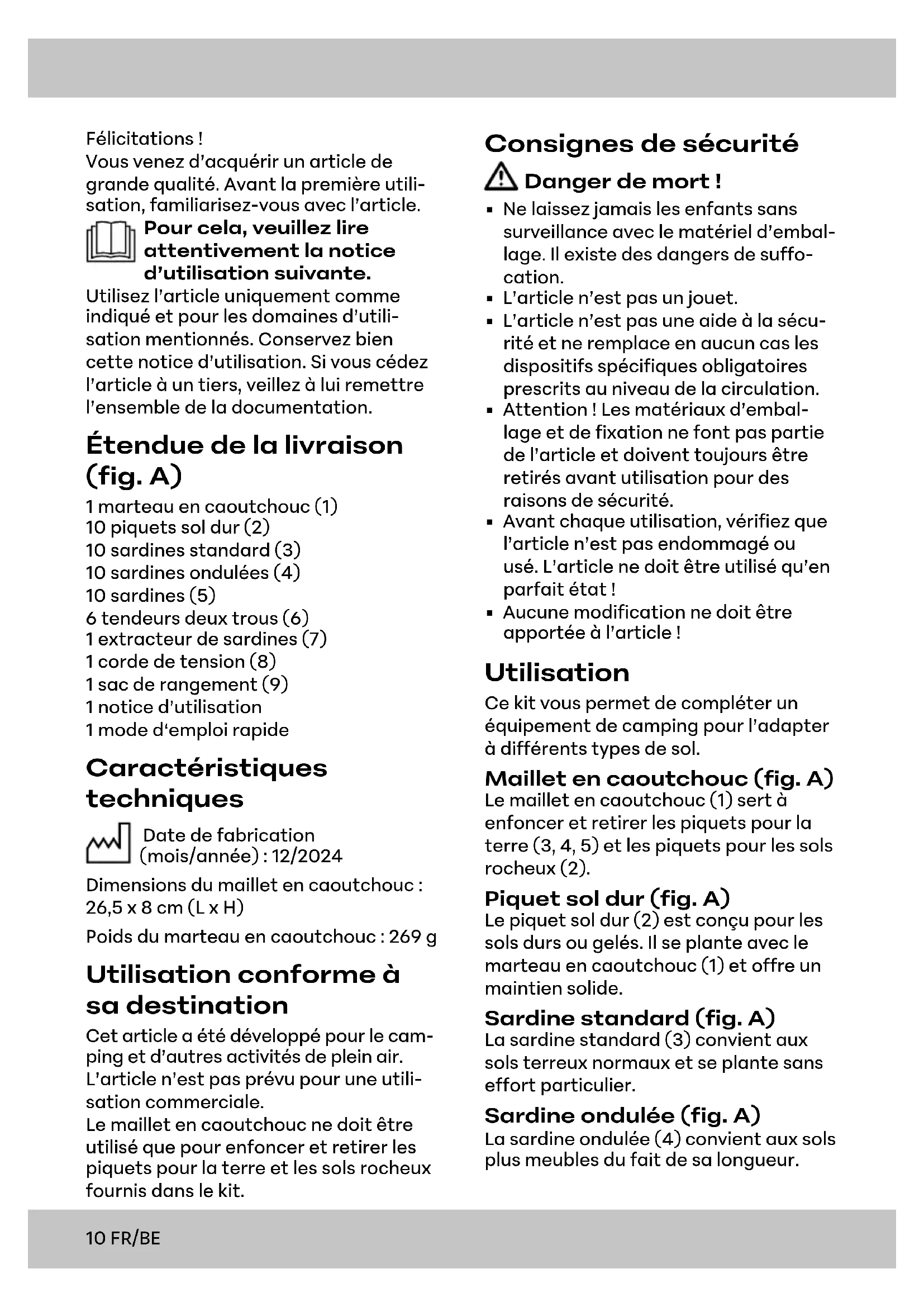 - s‘il présente les qualités qu‘un ache- teur peut légitimement attendre eu égard aux déclarations publiques faites par le vendeur, par le pro- ducteur ou par son représentant, notamment dans la publicité ou l‘étiquetage ; 2° Ou s‘il présente les caractéristiques définies d‘un commun accord par les parties ou être propre à tout usage spécial recherché par l‘acheteur, porté à la connaissance du vendeur et que ce dernier a accepté. Article L217-12 du Code de la consommation L‘action résultant du défaut de conformité se prescrit par deux ans à compter de la délivrance du bien.13FR/BE Article 1641 du Code civil Le vendeur est tenu de la garantie à raison des défauts cachés de la chose vendue qui la rendent impropre à l‘usage auquel on la destine, ou qui diminuent tellement cet usage que l‘acheteur ne l‘aurait pas acquise, ou n‘en aurait donné qu‘un moindre prix, s‘il les avait connus. Article 1648 1er alinéa du Code civil L‘action résultant des vices rédhi- bitoires doit être intentée par l‘ac- quéreur dans un délai de deux ans à compter de la découverte du vice. Les pieces detachees indispensables a l’utilisation du produit sont disponibles pendant la duree de la garantie du produit. IAN : 470672_2407 Service France Tel. : 0800 919 270 E-Mail : deltasport@lidl.fr Service Belgique Tel. : 0800 12089 E-Mail : deltasport@lidl.be *n’est valable que pour la France14 NL/BE Gefeliciteerd! Met uw aankoop hebt u voor een hoog- waardig artikel gekozen. Zorg ervoor dat u voor het eerste gebruik met het artikel vertrouwd raakt. Lees hiervoor de volgende gebruiksaanwijzing zorgvuldig door. Gebruik het artikel alleen zoals om- schreven en voor het aangegeven doel. Bewaar deze gebruiksaanwijzing goed. Geef alle documenten mee als u het artikel aan iemand anders geeft. Leveringsomvang (afb.A) 1xrubberhamer (1) 10xrotspen (2) 10xgrondpen, standaard (3) 10xgrondpen, golvend (4) 10xgrondpen (5) 6xtweegaatsspanner (6) 1xgrondpentrekker (7) 1xscheerlijn (8) 1xopbergtas (9) 1xgebruiksaanwijzing 1 x korte handleiding Technische gegevens Productiedatum (maand/jaar): 12/2024 Afmetingen rubberen hamer: 26,5 x 8 cm (l x h) Gewicht rubberen hamer: 269 g Beoogd gebruik Dit artikel is ontwikkeld voor de cam- ping en andere outdooractiviteiten. Het artikel is niet bestemd voor zakelijk gebruik. De rubberen hamer mag alleen gebruikt worden om de tot de set behorende grond- en steenpennen in te slaan en te verwijderen. Veiligheidstips Levensgevaar!
