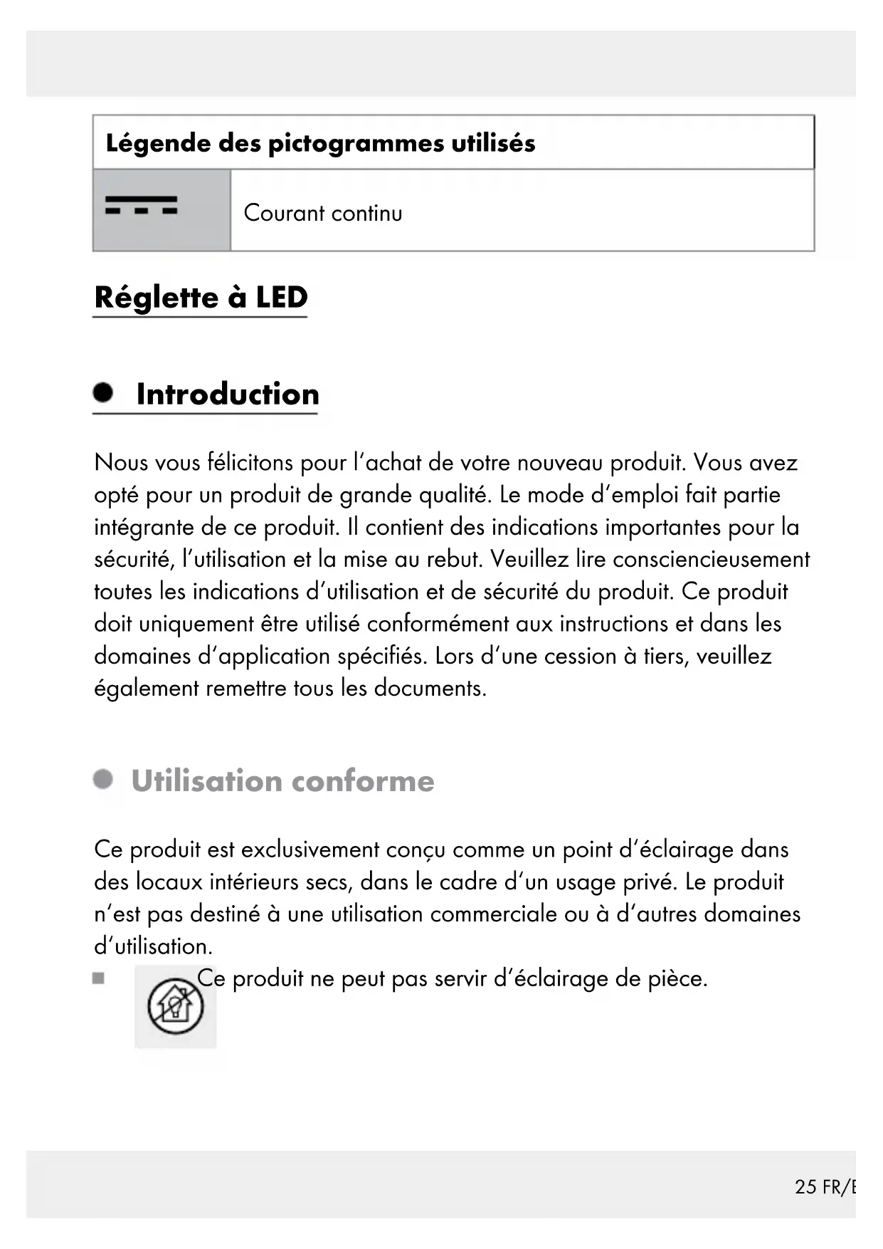 Veuillez respecter l‘identification des matériaux d‘emballage pour le tri sélectif, ils sont identifiés avec des abbréviations (a) et des chiffres (b) ayant la signification suivante : 1–7 : plastiques / 20–22 : papiers et cartons / 80–98 : matériaux composite. Le produit et les matériaux d’emballage sont recyclables, mettez-les au rebut séparément pour un meilleur traitement des déchets. Le logo Triman n’est valable qu’en France.32 FR/BE Votre mairie ou votre municipalité vous renseigneront sur les possibilités de mise au rebut des produits usagés. Afin de contribuer à la protection de l’environnement, veuillez ne pas jeter votre produit usagé dans les ordures ménagères, mais éliminez-le de manière appropriée. Pour obtenir des ren- seignements concernant les points de collecte et leurs ho- raires d’ouverture, vous pouvez contacter votre municipalité. Les piles / piles rechargeables défectueuses ou usagées doivent être re- cyclées conformément à la directive 2006/66/CE et ses modifications. Les piles et / ou piles rechargeables et / ou le produit doivent être retour- nés dans les centres de collecte proposés. Pollution de l’environnement par la mise au rebut incorrecte des piles / piles rechargeables ! Les piles / piles rechargeables ne doivent pas être mises au rebut avec les ordures ménagères. Elles peuvent contenir des métaux lourds to- xiques et doivent être considérées comme des déchets spéciaux. Les symboles chimiques des métaux lourds sont les suivants : Cd = cad- mium, Hg = mercure, Pb = plomb. Pour cette raison, veuillez toujours dé- poser les piles / piles rechargeables usagées dans les conteneurs de recyclage communaux.33 FR/BE Garantie Le produit a été fabriqué selon des critères de qualité stricts et contrôlé consciencieusement avant sa livraison. En cas de défaillance, vous êtes en droit de retourner ce produit au vendeur. La présente garantie ne constitue pas une restriction de vos droits légaux. Ce produit bénéficie d‘une garantie de 3 ans à compter de sa date d’achat. La durée de garantie débute à la date d’achat. Veuillez conser- ver le ticket de caisse original. Il fera office de preuve d’achat. Si un problème matériel ou de fabrication devait survenir dans 3 ans suivant la date d‘achat de ce produit, nous assurons à notre discrétion la réparation ou le remplacement du produit sans frais supplémentaires. La garantie prend fin si le produit est endommagé suite à une utilisation inappropriée ou à un entretien défaillant. La garantie couvre les vices matériels et de fabrication. Cette garantie ne s’étend ni aux pièces du produit soumises à une usure normale (p. ex. des piles) et qui, par conséquent, peuvent être considérées comme des pièces d’usure, ni aux dommages sur des composants fragiles, comme des interrupteurs, des batteries ou des éléments fabriqués en verre.34 NL/BE Legenda van de gebruikte pictogrammen .................................................................Pagina 35 Inleiding ...............................................................................Pagina 35 Correct gebruik .......................................................................Pagina 35 Beschrijving van de onderdelen .............................................Pagina 36 Technische gegevens ..............................................................Pagina 36 Omvang van de levering ........................................................Pagina 36 Algemene veiligheidsinstructies ......................Pagina 37 Veiligheidsinstructies voor batterijen / accu‘s ........................Pagina 37 Gebruik .................................................................................Pagina 39 Montage ..................................................................................Pagina 39 Voor de ingebruikname ..........................................................Pagina 39 Ingebruikname ........................................................................Pagina 39 Beweeglijke spotjes aan- / uitschakelen.................................Pagina 40 Batterijen vervangen ...............................................................Pagina 40 Reiniging en onderhoud .........................................Pagina 41 Afvoer ....................................................................................Pagina 41 Garantie ...............................................................................Pagina 4235 NL/BE Legenda van de gebruikte pictogrammen Gelijkstroom LED-onderbouwlamp Inleiding Hartelijk gefeliciteerd met de aankoop van uw nieuwe product. U heeft voor een hoogwaardig product gekozen. De gebruiksaanwijzing is een deel van het product. Deze bevat belangrijke aanwijzingen voor veilig- heid, gebruik en verwijdering. Maakt U zich voor de ingebruikname van het product met alle bedienings- en veiligheidsvoorschriften vertrouwd. Gebruik het product alleen zoals beschreven en voor de aangegeven toepassingsgebieden. Overhandig alle documenten bij doorgifte van het product aan derden. Correct gebruik Dit product is uitsluitend bedoeld voor de verlichting in droge ruimtes binnenshuis en alléén geschikt voor privégebruik. Het product is niet ge- schikt voor commercieel gebruik of gebruik voor andere toepassingsge- bieden. Dit product is niet geschikt voor de verlichting van kamers in privé-huishoudens.36 NL/BE Beschrijving van de onderdelen