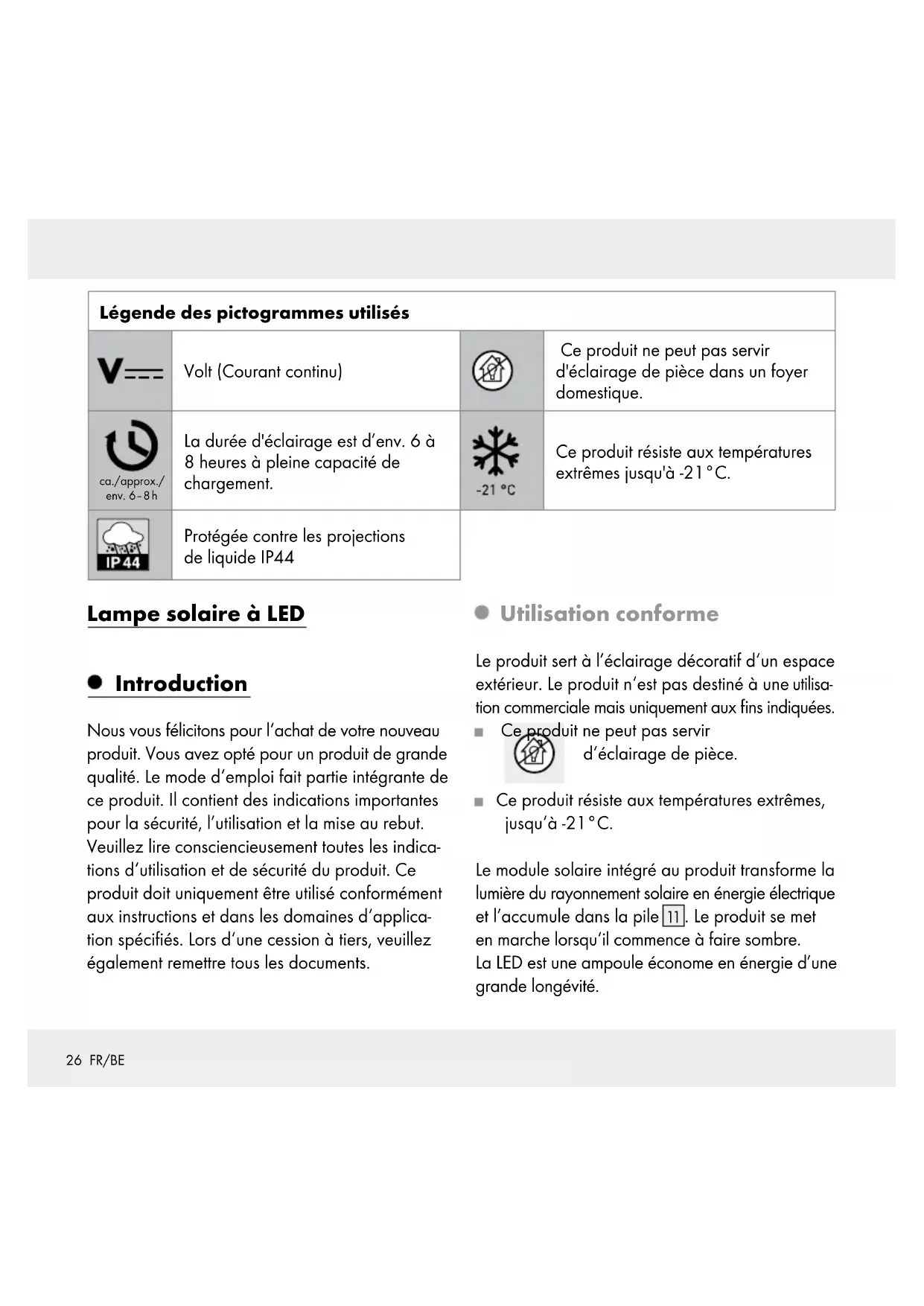 . Le produit se met en marche lorsqu‘il commence à faire sombre. La LED est une ampoule économe en énergie d’une grande longévité.27 FR/BE La durée d’éclairage dépend du rayonnement so- laire, de l’angle d’incidence de la lumière sur le module solaire