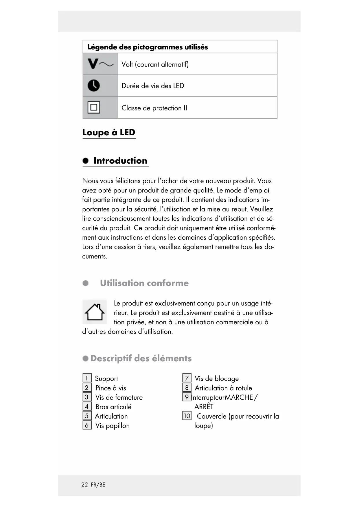 Couvercle (pour recouvrir la loupe)23 FR/BE Caractéristiques techniques Lampe-loupe LED Tension de service : 230 V ∼ (courant alternatif), 50 Hz Puissance absorbée: env. 6,3 W Classe de protection: II / Certifié TÜV SÜD / GS Loupe Taille de la lentille: env. 5dioptries Grossissement: env. x 2,25 Contenu de la livraison 1 lampe-loupe LED 1 vis de fermeture 1 vis papillon 1 support 1 pince à vis 1 mode d‘emploi Sécurité Consignes de sécurité CONSERVEZ TOUTES LES CONSIGNES DE SÉCURITÉ ET INS- TRUCTIONS EN VUE D‘UNE CONSULTATION ULTÉRIEURE!
