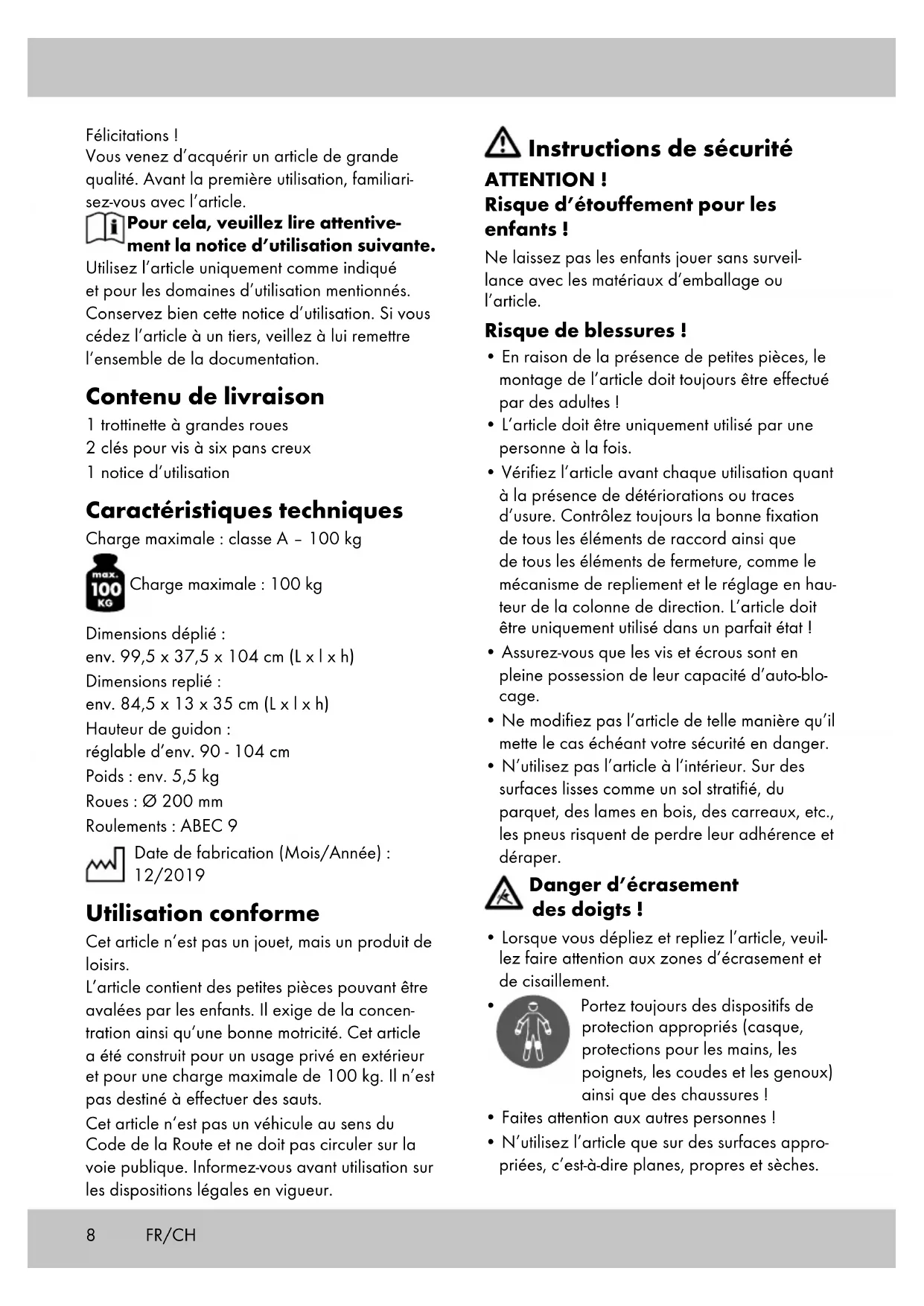 - N’utilisez l’article que sur des surfaces appro- priées, c’est-à-dire planes, propres et sèches. FR/CH9FR/CH Roulez si possible à l’écart des autres usagers de la route. Evitez les terrains en pente, les escaliers et les plans d’eau ouverts.