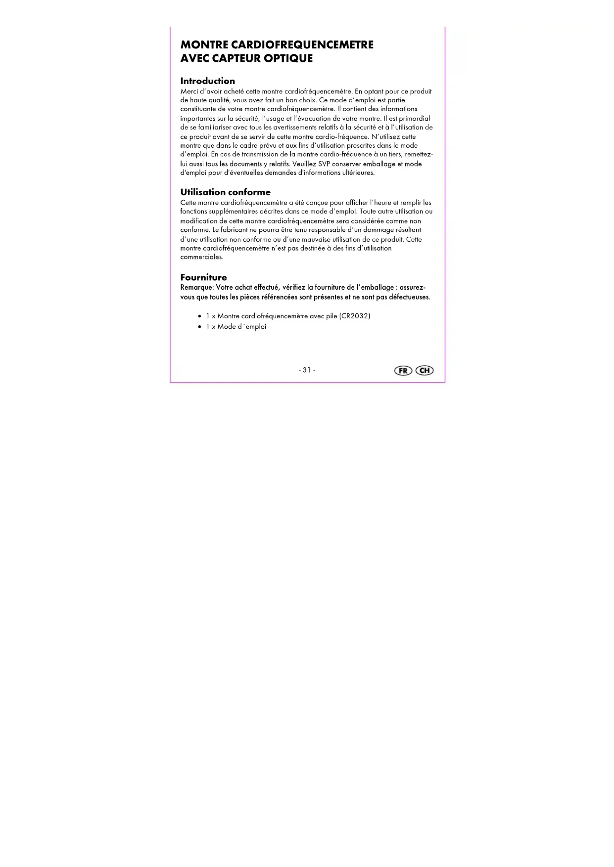 Introduction Merci d’avoir acheté cette montre cardiofréquencemètre. En optant pour ce produit de haute qualité, vous avez fait un bon choix. Ce mode d’emploi est partie constituante de votre montre cardiofréquencemètre. Il contient des informations importantes sur la sécurité, l’usage et l’évacuation de votre montre. Il est primordial de se familiariser avec tous les avertissements relatifs à la sécurité et à l’utilisation de ce produit avant de se servir de cette montre cardio-fréquence. N’utilisez cette montre que dans le cadre prévu et aux fins d’utilisation prescrites dans le mode d’emploi. En cas de transmission de la montre cardio-fréquence à un tiers, remettez- lui aussi tous les documents y relatifs. Veuillez SVP conserver emballage et mode d'emploi pour d'éventuelles demandes d'informations ultérieures. Utilisation conforme Cette montre cardiofréquencemètre a été conçue pour afficher l’heure et remplir les fonctions supplémentaires décrites dans ce mode d‘emploi. Toute autre utilisation ou modification de cette montre cardiofréquencemètre sera considérée comme non conforme. Le fabricant ne pourra être tenu responsable d’un dommage résultant d’une utilisation non conforme ou d’une mauvaise utilisation de ce produit. Cette montre cardiofréquencemètre n’est pas destinée à des fins d’utilisation commerciales. Fourniture Remarque: Votre achat effectué, vérifiez la fourniture de l’emballage : assurez- vous que toutes les pièces référencées sont présentes et ne sont pas défectueuses. 1 x Montre cardiofréquencemètre avec pile (CR2032) 1 x Mode d´emploi-