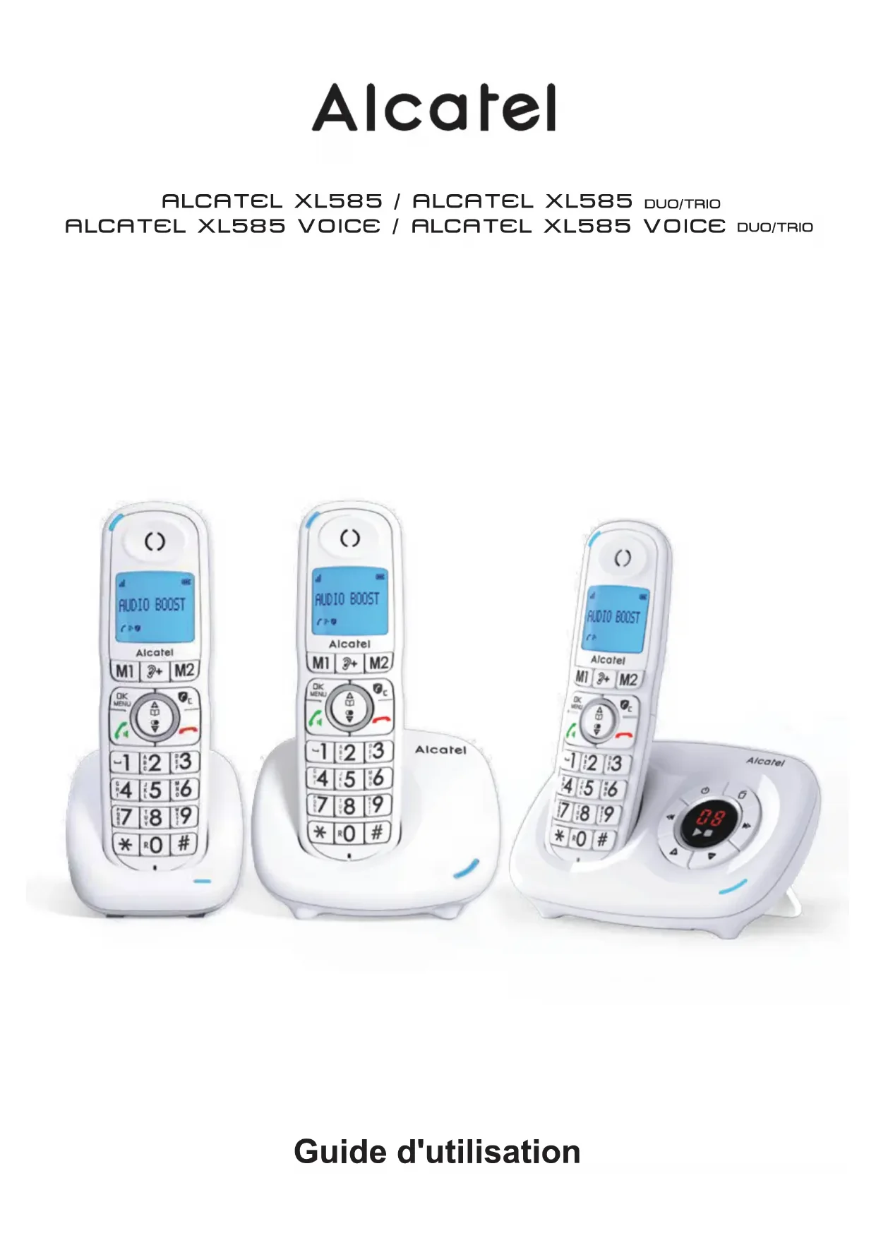 ALCATEL XL585 VOICE / ALCATEL XL585 VOICEL'emballage contient les éléments suivants : Alcatel XL585 / XL585 Voice - la base, - le cordon de ligne, - le combiné, - l’alimentation électrique, - le guide rapide. Alcatel XL585 / XL585 Voice duo/trio - le(s) combiné(s) supplémentaire(s) - le(s) chargeur(s) - les batteries Afin de vous familiariser avec votre téléphone Alcatel XL585 / XL585 Voice, nous vous recommandons de lire attentivement ce manuel, ainsi que les consignes de sécurité avant toute utilisation. Nous vous invitons également à communiquer et partager les avertissements détaillés dans ce guide avec l’ensemble de votre famille et notamment vos enfants. Il est rappelé aux parents et personnes en charge de très jeunes enfants qu’ils doivent veiller d’une façon générale à ce que les enfants ne portent pas à la bouche des objets métalliques, des pièces ou éléments plastiques, hors ceux à usage alimentaire. DUO/TRIO DUO/TRIO