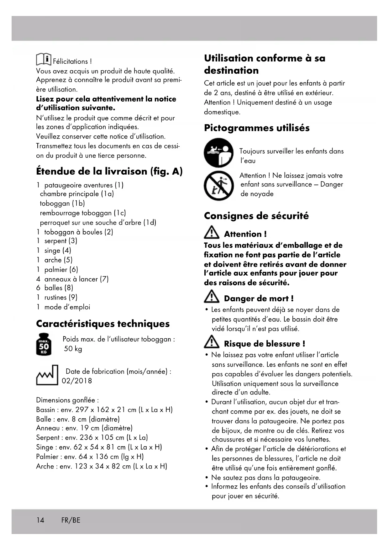- s‘il présente les qualités qu‘un acheteur peut légitimement attendre eu égard aux déclara- tions publiques faites par le vendeur, par le producteur ou par son représentant, notam- ment dans la publicité ou l‘étiquetage ; 2° Ou s‘il présente les caractéristiques définies d‘un commun accord par les parties ou être propre à tout usage spécial recherché par l‘acheteur, porté à la connaissance du vendeur et que ce dernier a accepté. Article L217-12 du Code de la consommation L‘action résultant du défaut de conformité se prescrit par deux ans à compter de la délivrance du bien. Article 1641 du Code civil Le vendeur est tenu de la garantie à raison des défauts cachés de la chose vendue qui la ren- dent impropre à l‘usage auquel on la destine, ou qui diminuent tellement cet usage que l‘acheteur ne l‘aurait pas acquise, ou n‘en aurait donné qu‘un moindre prix, s‘il les avait connus. Article 1648 1er alinéa du Code civil L‘action résultant des vices rédhibitoires doit être intentée par l‘acquéreur dans un délai de deux ans à compter de la découverte du vice. Stockage, nettoyage Changer fréquemment l‘eau dans l‘article, en particulier par temps chaud et lorsqu‘elle est sale ! Toujours stocker l‘article au sec et au propre non gonflé dans un local tempéré. Les valves doivent toujours être fermées lors du stockage. Laver uniquement à l‘eau ou à l‘eau savonneuse, jamais avec des produits d‘entretien agressifs. Lors du stockage pendant l‘hiver, ne pas poser d‘objets coupants sur l‘article et ne pas appliquer de talc. Remarques relatives à la mise au rebut Mettez l‘article et les matériaux d‘emballage au rebut conformément aux prescriptions locales. Les matériaux d‘emballage comme les sacs plastique ne doivent pas tomber entre les mains des enfants. Gardez le matériel d‘emballage hors de la portée des enfants. Ce produit est recyclable. Il est soumis à la responsabilité élargie du fabricant et est collecté séparément. Informations de garantie Article L217-16 du Code de la consommation Lorsque l‘acheteur demande au vendeur, pendant le cours de la garantie commerciale qui lui a été consentie lors de l‘acquisition ou de la réparation d‘un bien meuble, une remise en état couverte par la garantie, toute période d‘immobilisation d‘au moins sept jours vient s‘ajouter à la durée de la garantie qui restait à courir. Cette période court à compter de la demande d‘intervention de l‘acheteur ou de la mise à disposition pour réparation du bien en cause, si cette mise à disposition est postérieure à la demande d‘intervention. Indépendamment de la garantie commerciale souscrite, le vendeur reste tenu des défauts de conformité du bien et des vices rédhibitoires dans les conditions prévues aux articles L217-4 à L217-13 du Code de la consommation et aux articles 1641 à 1648 et 2232 du Code Civil. FR/BE18 Les pièces détachées indispensables à l’utilisation du produit sont disponibles pendant la durée de la garantie du produit. Service après-vente IAN : 298445 Service France Tel. : 0800 919270 E-Mail : deltasport@lidl.fr Service Belgique Tel. : 070 270 171 (0,15 EUR/Min.) E-Mail : deltasport@lidl.be FR/BE19 Hartelijk gefeliciteerd! Met de aankoop hebt u gekozen voor een hoogwaardig product. Maak u daarom voor de eerste ingebruikname vertrouwd met het product. Lees hiervoor deze gebruiksaanwijzing aandachtig door. Gebruik het product alleen zoals beschreven en uitsluitend voor de aan- gegeven doeleinden. Bewaar de handleiding zorgvuldig. Als u het product aan derden geeft, dient u ook deze documenten te overhandigen. Leveringsomvang (afb. A) 1 x avonturenpoedelbad (1) hoofdkamer (1a) glijbaan (1b) bekleding glijbaan (1c) papegaai op boomstronk (1d) 1 x ballenbaan (2) 1 x slang (3) 1 x aap (4) 1 x boog (5) 1 x palm (6) 4 x werpring (7) 6 x bal (8) 1 x reparatieplakker (9) 1 x gebruiksaanwijzing Technische gegevens Maximaal gewicht van de gebruiker glijbaan: 50 kg Productiedatum (maand/jaar): 02-2018 Afmetingen opgeblazen: Zwembad: ca. 297 x 162 x 21 cm (l x b x h) Bal: ca. 8 cm (diameter) Ring: ca. 19 cm (diameter) Slang: ca. 236 x 105 cm (l x b) Aap: ca. 62 x 54 x 81 cm (l x b x h) Palm: ca. 64 x 136 cm (b x h) Boog: ca. 123 x 34 x 82 cm (l x b x h) Beoogd gebruik Dit artikel is speelgoed voor kinderen vanaf 2 jaar en is bestemd voor gebruik buitenshuis. Let op! Uitsluitend voor thuisgebruik. Gebruikte symbolen Houd altijd toezicht op kinderen in het water Let op! Laat uw kind nooit alleen zonder toezicht: er is een kans op verdrinking Veiligheidstips Let op! De verpakkingsmaterialen maken geen onderdeel uit van het speelgoed en moeten uit veiligheidsoverwegingen worden verwijderd voordat kinderen met het product gaan spelen. Levensgevaar!