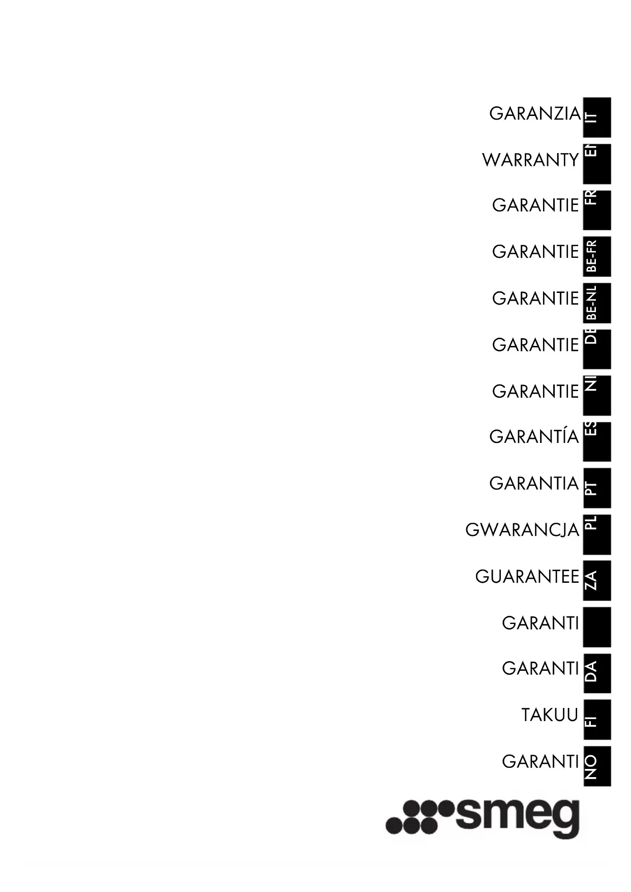 découper en suivant les pointillésdécouper en suivant les pointilléssuivre au verso FRFR DECLARATION DE CONDITIONS DE GARANTIE POURLES APPAREILS SMEG INSTALLES EN FRANCEVotre appareil vous est livré avec une garantie de 2 ans les conditions de garantie sont précisées ci-dessous.Pour vous faire bénéficier d’un meilleur service dans le cadre de cette garantie, la Carte d’Enregistrement ci-jointe doit être retournée au service Garantie SMEG France. SMEG / 83 rue Marcel Mérieux 1944 69960 CORBAS.DOMMAGES GARANTIS: Sont couverts par la garantie ( sous les réserves formulées ci-après ), les frais ( pièces, main d’oeuvre et déplacement ) ayant pour origine un phénomène électrique, électronique, électromécanique ou mécanique interne à l’appareil.La garantie ne joue pas pour les vices apparents : obligation est faite au client d’inspecter la marchandise à la livraison. A défaut, celle-ci est réputée exempte de vice.SONT EXCLUS DE LA GARANTIE- les appareils utilisés à des fins professionnelles, commerciales ou non domestiques. - les dommages dus à une mauvaise utilisation ou à une erreur de manipulation (exemple: four ne marchant pas car il a été programmé pour se mettre en marche en automatique à une heure prédéterminée), au manque d’entretien. - les frais de déplacement et main d’œuvre relatifs à des nettoyages, réglages, vérifications ou panne non constatée. Smeg France Service Garantie 83, rue Marcel Mérieux 69960 CORBAS (Lyon) Tel: 04.72.21.51.61 Fax: 04.72.50.00.14 email: sav@smeg.fr Apposez ici l'étiquette "produit" adhésive, reçue, dans le cas où elle est présente au dos de ce coupon, sinon, remplir les espaces ci-dessous en faisant référence à la plaque caractéristique du produit. MOD:_______________________ S/N:________________________ ATTENTION! COUPER ET RENVOYER EN ENVELOPPE CACHETEE Á L’ADRESSE INDIQUEE CI-DESSUS.Garantie