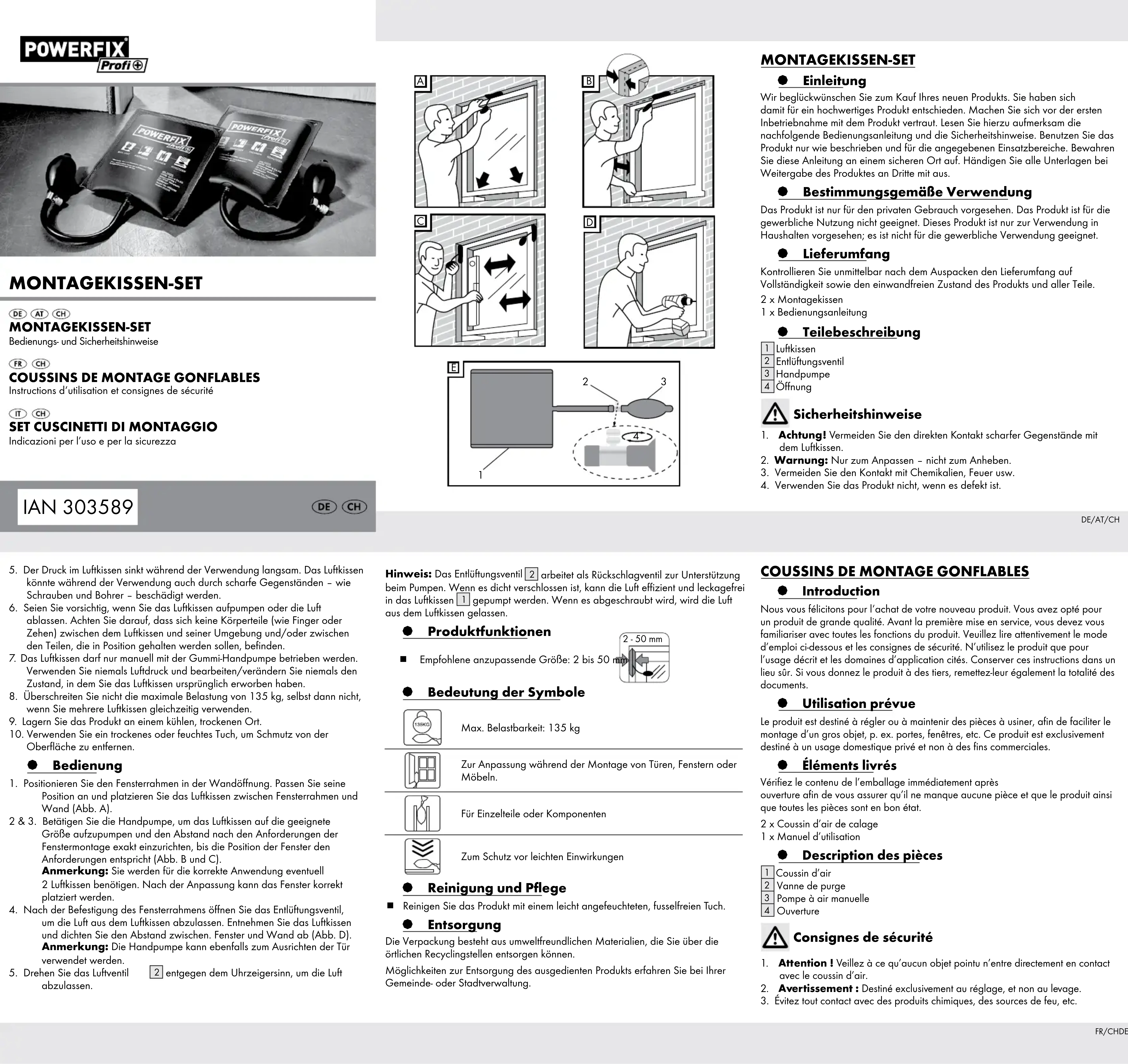 § Introduction Nous vous félicitons pour l‘achat de votre nouveau produit. Vous avez opté pour un produit de grande qualité. Avant la première mise en service, vous devez vous familiariser avec toutes les fonctions du produit. Veuillez lire attentivement le mode d’emploi ci-dessous et les consignes de sécurité. N’utilisez le produit que pour l’usage décrit et les domaines d’application cités. Conserver ces instructions dans un lieu sûr. Si vous donnez le produit à des tiers, remettez-leur également la totalité des documents. § Utilisation prévue Le produit est destiné à régler ou à maintenir des pièces à usiner, afin de faciliter le montage d’un gros objet, p. ex. portes, fenêtres, etc. Ce produit est exclusivement destiné à un usage domestique privé et non à des fins commerciales. § Éléments livrés Vérifiez le contenu de l’emballage immédiatement après ouverture afin de vous assurer qu’il ne manque aucune pièce et que le produit ainsi que toutes les pièces sont en bon état. 2 x Coussin d’air de calage 1 x Manuel d’utilisation § Description des pièces