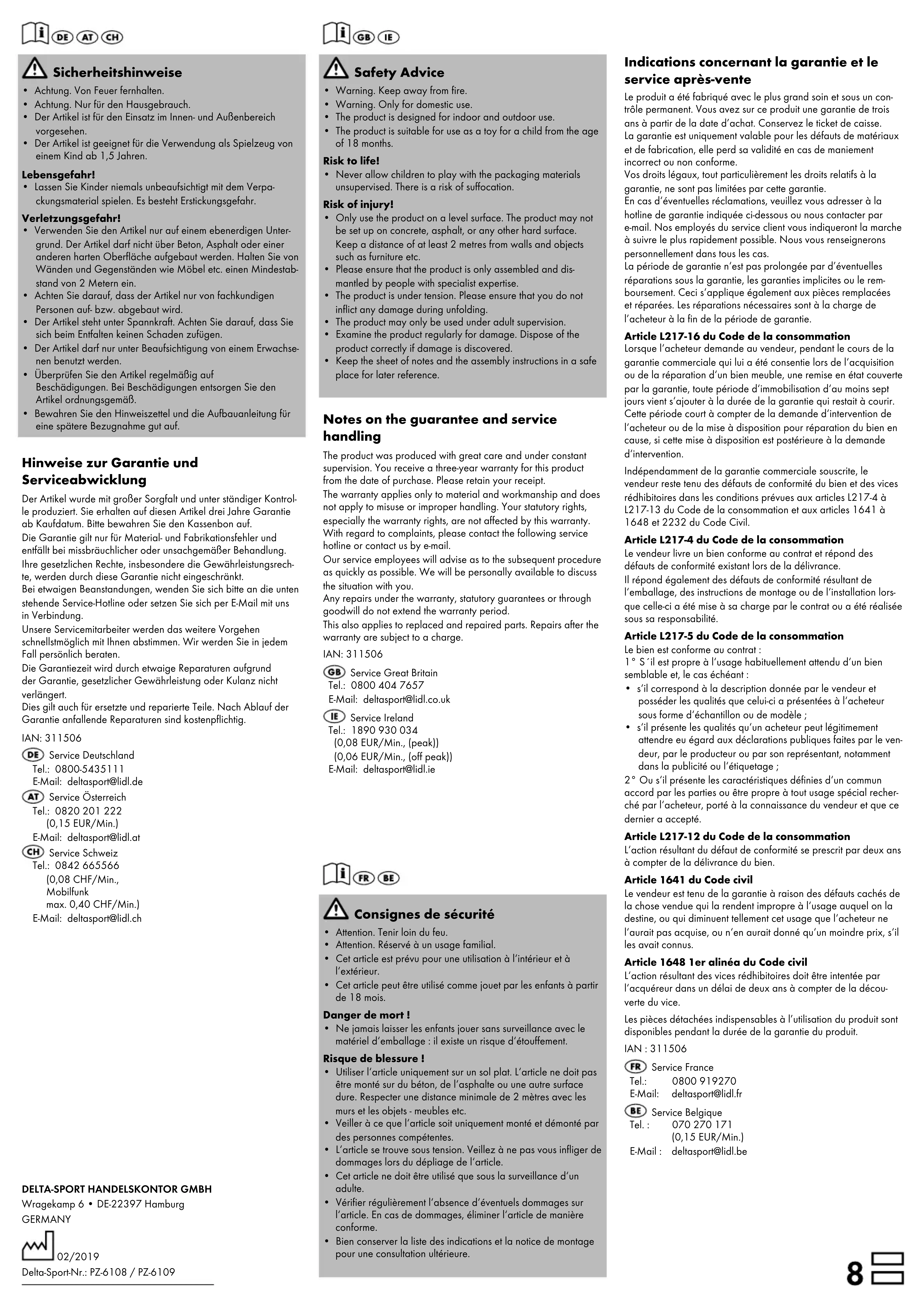 - s‘il présente les qualités qu‘un acheteur peut légitimement attendre eu égard aux déclarations publiques faites par le ven- deur, par le producteur ou par son représentant, notamment dans la publicité ou l‘étiquetage ; 2° Ou s‘il présente les caractéristiques définies d‘un commun accord par les parties ou être propre à tout usage spécial recher- ché par l‘acheteur, porté à la connaissance du vendeur et que ce dernier a accepté. Article L217-12 du Code de la consommation L‘action résultant du défaut de conformité se prescrit par deux ans à compter de la délivrance du bien. Article 1641 du Code civil Le vendeur est tenu de la garantie à raison des défauts cachés de la chose vendue qui la rendent impropre à l‘usage auquel on la destine, ou qui diminuent tellement cet usage que l‘acheteur ne l‘aurait pas acquise, ou n‘en aurait donné qu‘un moindre prix, s‘il les avait connus. Article 1648 1er alinéa du Code civil L‘action résultant des vices rédhibitoires doit être intentée par l‘acquéreur dans un délai de deux ans à compter de la décou- verte du vice. Les pièces détachées indispensables à l’utilisation du produit sont disponibles pendant la durée de la garantie du produit. IAN : 311506 Service France Tel.: 0800 919270 E-Mail: deltasport@lidl.fr Service Belgique Tel. : 070 270 171 (0,15 EUR/Min.) E-Mail : deltasport@lidl.be