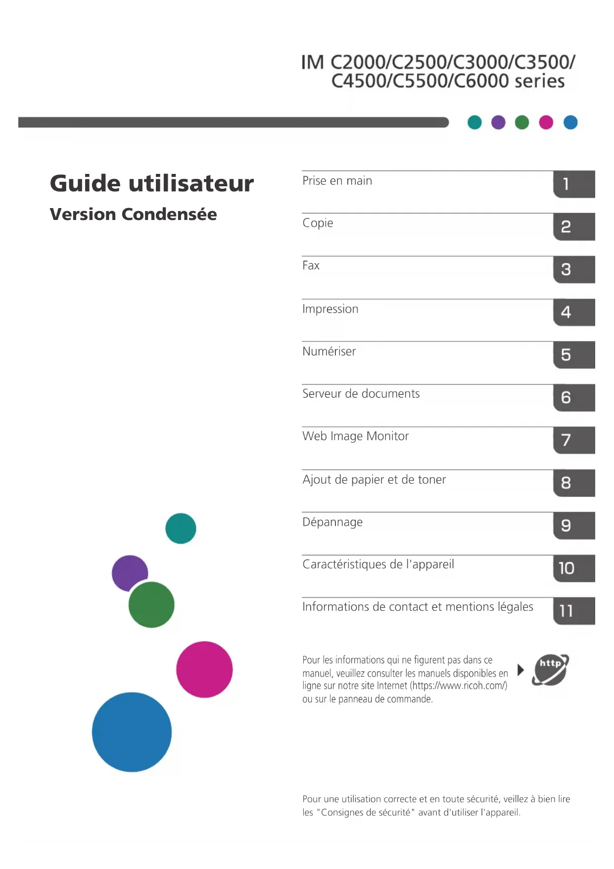 Pour une utilisation correcte et en toute sécurité, veillez à bien lire les "Consignes de sécurité" avant d'utiliser l'appareil. Pour les informations qui ne figurent pas dans ce manuel, veuillez consulter les manuels disponibles en ligne sur notre site Internet (https://www.ricoh.com/) ou sur le panneau de commande. Informations de contact et mentions légales Caractéristiques de l'appareil Dépannage Ajout de papier et de toner Web Image Monitor Serveur de documents Numériser Impression Fax Copie Prise en main Guide utilisateur Version CondenséeComment lire les manuels Symboles utilisés dans les manuels Ce manuel utilise les symboles suivants : Signale les points importants pour l'utilisation des fonctions. Ce symbole signale les points pour lesquels le non-respect des instructions peut rendre le produit ou le service inutilisable ou entraîner une perte de données. Veillez à lire attentivement ces explications. Fournit des explications supplémentaires sur les fonctions de l'appareil, et des instructions sur la résolution d'erreurs d'utilisateur.