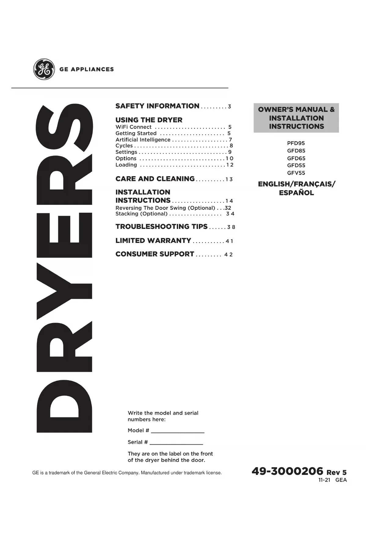 GUIDE DE L’UTILISATEUR ET INSTRUCTION D’INSTALLATION Inscrivez ici les numéros de modèle et de série : Modèle # ________________ Série # __________________ Ces informations figurent sur l’étiquette située à l’avant de la sécheuse, derrière la porte. FRANÇAIS 49-3000206 Rev 5 PFD95 GFD85 GFD65 GFD55 GFV552 49-3000206 Rev 5 NOUS VOUS REMERCIONS D’ACCUEILLIR GE APPLIANCES CHEZ VOUS Que vous ayez grandi avec GE Appliances ou qu’il s’agisse de votre première acquisition, nous sommes heureux de vous accueillir dans notre famille. Nous sommes fiers du savoir-faire, de l’innovation et de l’esthétique qui composent chaque appareil GE Appliances, et nous pensons que vous le serez aussi. Dans cette optique, nous vous rappelons que l’enregistrement de votre électroménager vous assure la communication de renseignements importants sur le produit et la garantie lorsque vous en avez besoin. Enregistrez votre électroménager GE en ligne dès maintenant. Des sites Web et des numéros de téléphone utiles figurent dans la section Soutien au consommateur de ce manuel d’utilisation. Vous pouvez aussi poster la fiche de garantie préimprimée incluse dans l’emballage.49-3000206 Rev 5 3 LIRE ET