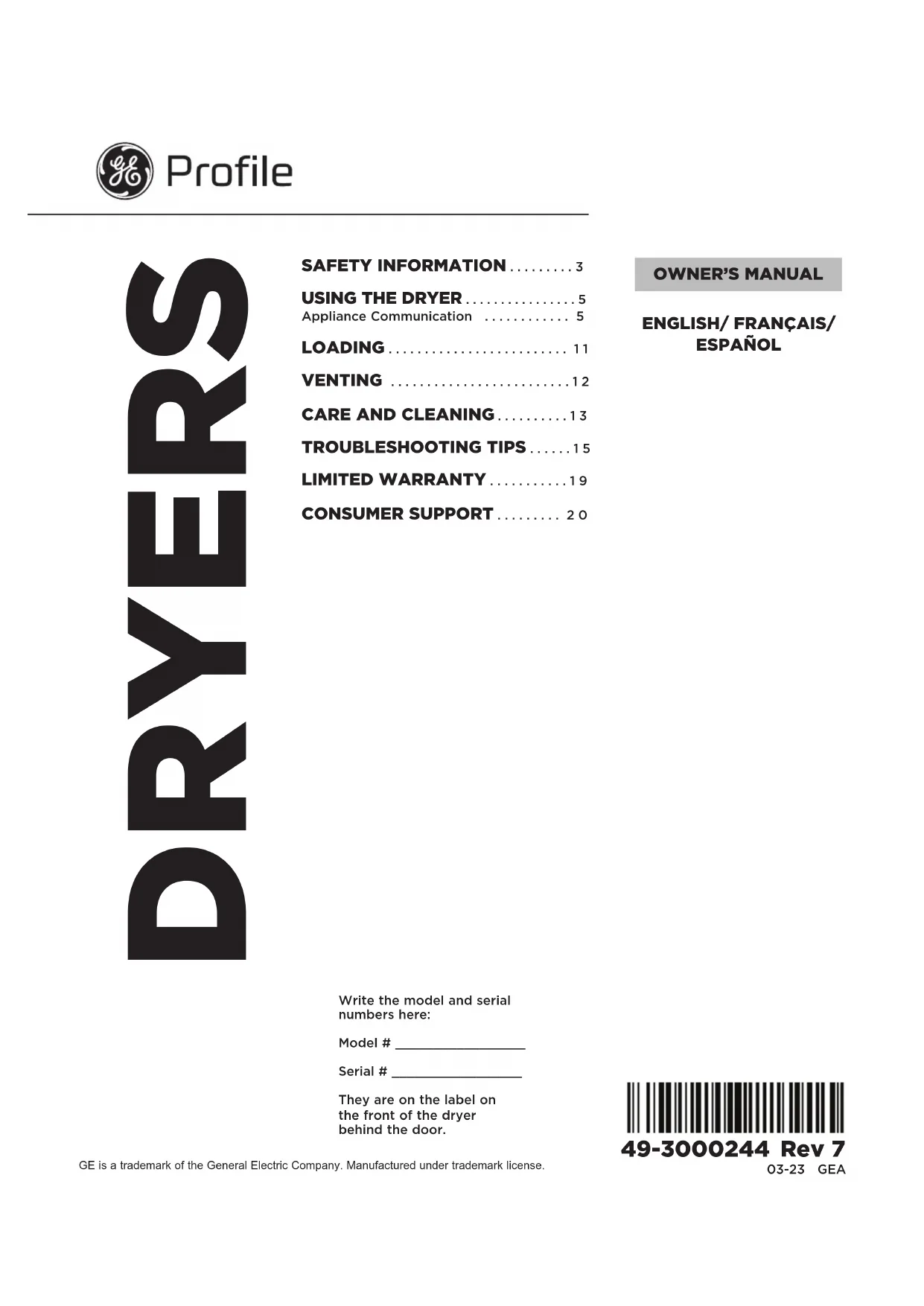 GUIDE DE L’UTILISATEUR SÉCHEUSES Inscrivez ici les numéros de modèle et de série : Modèle # ________________ Série # __________________ Ces informations figurent sur l’étiquette située à l’avant de la sécheuse, derrière la porte. FRANÇAIS 49-3000244 Rev 7 03-23 GEA2 49-3000244 Rev 7 NOUS VOUS REMERCIONS D’ACCUEILLIR GE APPLIANCES CHEZ VOUS Que vous ayez grandi avec GE Appliances ou qu’il s’agisse de votre première acquisition, nous sommes heureux de vous accueillir dans notre famille. Nous sommes fiers du savoir-faire, de l’innovation et de l’esthétique qui composent chaque appareil GE Appliances, et nous pensons que vous le serez aussi. Dans cette optique, nous vous rappelons que l’enregistrement de votre électroménager vous assure la communication de renseignements importants sur le produit et la garantie lorsque vous en avez besoin. Enregistrez votre électroménager GE en ligne dès maintenant. Des sites Web et des numéros de téléphone utiles figurent dans la section Soutien au consommateur de ce manuel d’utilisation. Vous pouvez aussi poster la fiche de garantie préimprimée incluse dans l’emballage.49-3000244 Rev 7 3 LIRE ET