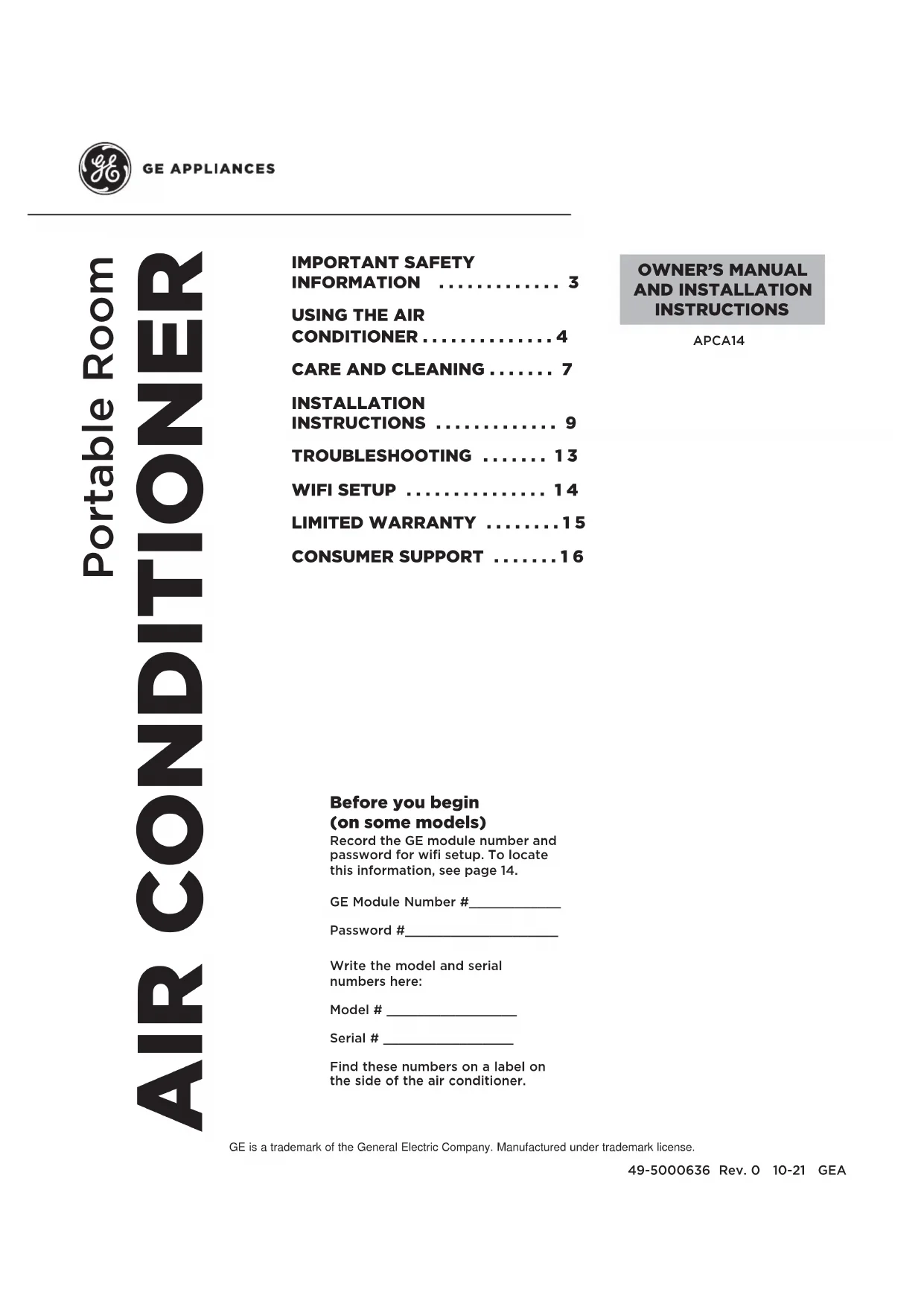 ET INSTRUCTIONS D’INSTALLATION Transcrivez les numéros de modèle et de série ici : # de modèle _____________ # de série _______________ Vous trouverez l’étiquette signalétique sur le côté du climatiseur. GE est une marque déposée de General Electric Company. Fabriqué sous licence de marque.2 49-5000636 Rev. 0 NOUS VOUS REMERCIONS D’ACCUEILLIR GE APPLIANCES CHEZ VOUS Que vous ayez grandi avec GE Appliances ou qu’il s’agisse de votre première acquisition, nous sommes heureux de vous accueillir dans notre famille. Nous sommes fiers du savoir-faire, de l’innovation et de l’esthétique qui composent chaque appareil GE Appliances, et nous pensons que vous le serez aussi. Dans cette optique, nous vous rappelons que l’enregistrement de votre électroménager vous assure la communication de renseignements importants sur le produit et la garantie lorsque vous en avez besoin. Enregistrez votre électroménager GE en ligne dès maintenant. Des sites Web et des numéros de téléphone utiles figurent dans la section Soutien au consommateur de ce manuel d’utilisation.49-5000636 Rev. 0 3