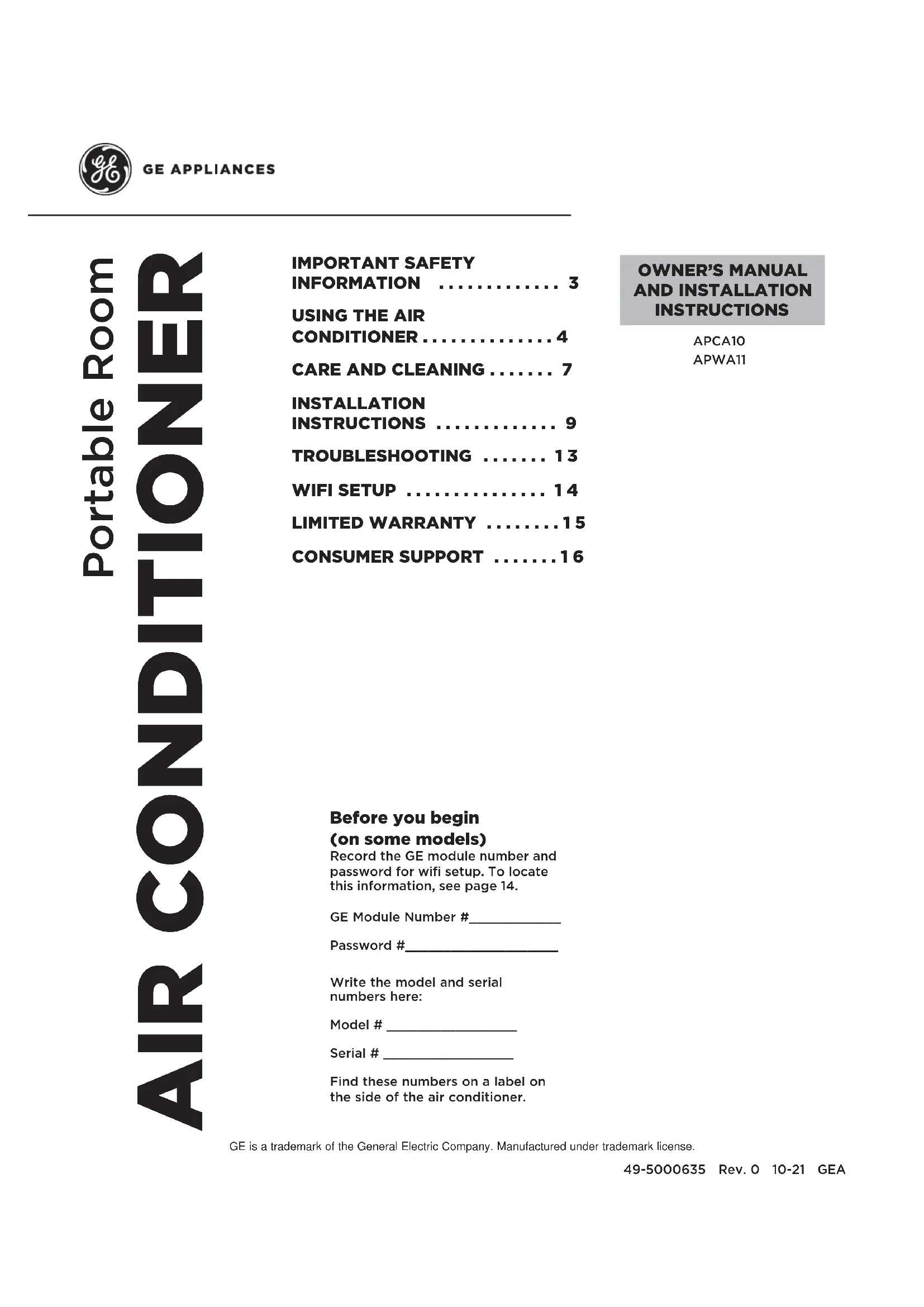 de Série ______________ Vous trouverez ces numéros sur l’étiquette apposée sur le côté du climatiseur. GE est une marque de commerce de General Electric Company. Fabriqué sous licence de marque.2 49-5000635 Rev. 0 NOUS VOUS REMERCIONS D’INTÉGRER GE APPLIANCES À VOTRE DEMEURE Que vous ayez grandi avec des électroménagers GE Appliances ou qu’il s’agisse de votre première acquisition, nous sommes heureux de vous accueillir dans notre famille. Nous sommes fiers du savoir-faire, de l’innovation et du design qui constituent chaque électroménager GE, et nous pensons que vous le serez aussi. Nous vous rappelons que l’enregistrement de votre électroménager vous assure de recevoir des renseignements importants sur le produit et la garantie lorsque vous en avez besoin. Enregistrez votre électroménager GE en ligne dès maintenant. Des sites Web et des numéros de téléphone utiles figurent dans la section Soutien au consommateur de ce manuel d’utilisation. Vous pouvez également envoyer par courrier la carte d’enregistrement pré-imprimée qui se trouve dans l’emballage de votre appareil.49-50004635 Rev. 0 3