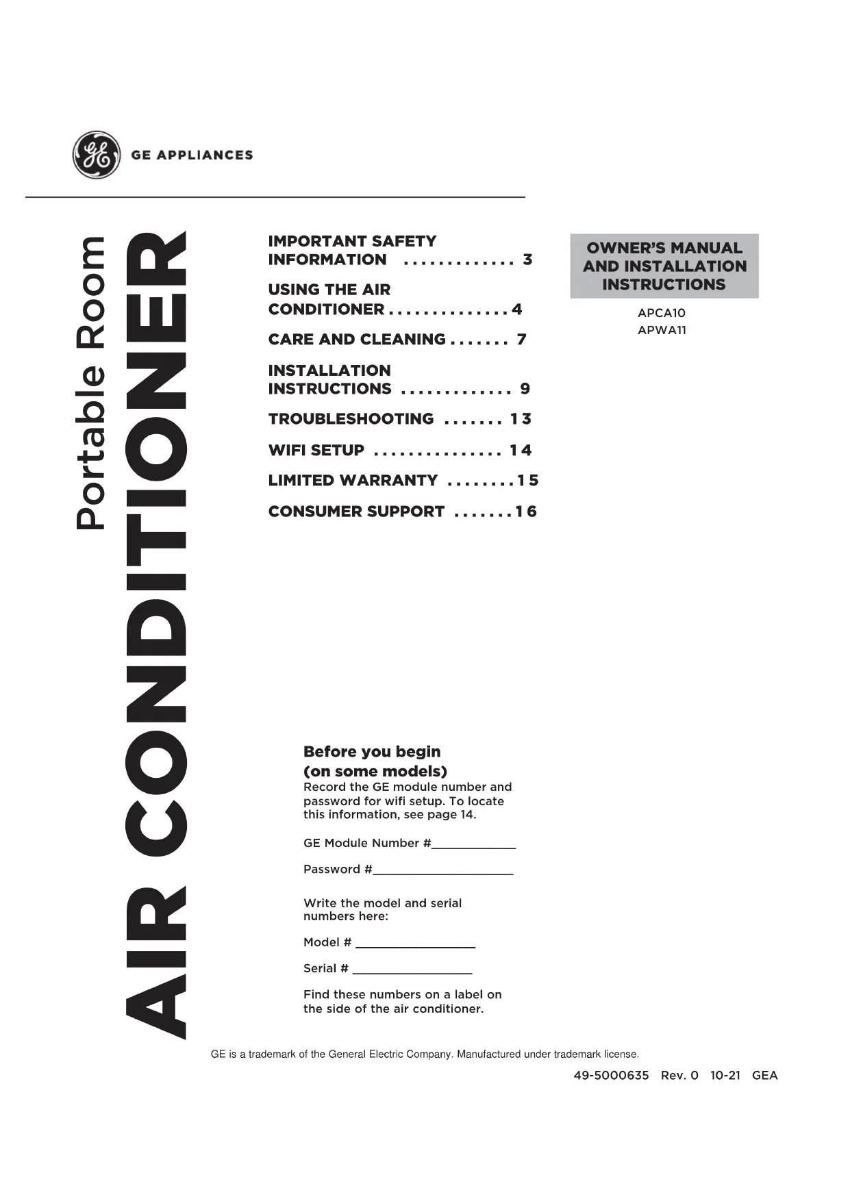 APCA10YBBW - Climatisation GE - Notice d'utilisation et mode d'emploi gratuit