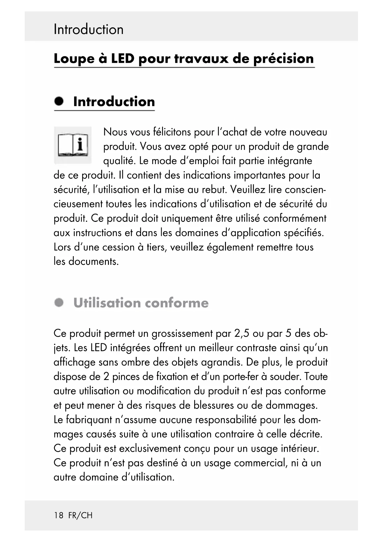 nicht zerkratzt. Wickeln Sie das Produkt in ein weiches Tuch ein. Entsorgung Die Verpackung besteht aus umweltfreundlichen Materialien, die Sie über die örtlichen Recyclingstellen entsorgen können. Möglichkeiten zur Entsorgung des ausgedienten Produkts erfahren Sie bei Ihrer Gemeinde oder Stadtverwaltung. Werfen Sie Ihr Produkt, wenn es ausgedient hat, im Interesse des Umweltschutzes nicht in den Hausmüll, sondern führen Sie es einer fachgerech- ten Entsorgung zu. Über Sammelstellen und deren Öffnungszeiten können Sie sich bei Ihrer zuständi- gen Verwaltung informieren. Defekte oder verbrauchte Batterien müssen gemäß Richtlinie 2006 / 66 / EC und deren Änderungen recycelt werden. Ge- ben Sie Batterien und / oder das Gerät über die angebote- nen Sammeleinrichtungen zurück.16 DE/AT/CH Entsorgung Umweltschäden durch falsche Entsorgung der Batterien! Batterien dürfen nicht über den Hausmüll entsorgt werden. Sie können giftige Schwermetalle enthalten und unterliegen der Sondermüllbehandlung. Die chemischen Symbole der Schwermetalle sind wie folgt: Cd = Cadmium, Hg = Queck- silber, Pb = Blei. Geben Sie deshalb verbrauchte Batterien bei einer kommunalen Sammelstelle ab.17 FR/CH Table des matières Introduction ........................................................Page 18 Utilisation conforme .................................................Page 18 Description des pièces et éléments .........................Page 19 Données techniques ................................................. Page 20 Contenu de livraison ................................................ Page 20 Sécurité ..................................................................Page 21 Instructions générales de sécurité ...........................Page 21 Instructions de sécurité relatives aux piles .............. Page 23 Avant la mise en service ..........................Page 24 Mise en place des piles ........................................... Page 24 Fixation du dispositif de réparation ........................Page 24 Montage de la loupe ...............................................Page 25 Utilisation ............................................................. Page 25 Utilisation de la loupe à LED pour mécanique de précision ..........................................Page 25 Remplacement des piles ..........................................Page 26 Solution aux problèmes .......................... Page 26 Nettoyage et entretien ............................. Page 27 Traitement des déchets .............................Page 2718 FR/CH Introduction Loupe à LED pour travaux de précision Introduction Nous vous félicitons pour l‘achat de votre nouveau produit. Vous avez opté pour un produit de grande qualité. Le mode d‘emploi fait partie intégrante de ce produit. Il contient des indications importantes pour la sécurité, l’utilisation et la mise au rebut. Veuillez lire conscien- cieusement toutes les indications d‘utilisation et de sécurité du produit. Ce produit doit uniquement être utilisé conformément aux instructions et dans les domaines d‘application spécifiés. Lors d‘une cession à tiers, veuillez également remettre tous les documents. Utilisation conforme Ce produit permet un grossissement par 2,5 ou par 5 des ob- jets. Les LED intégrées offrent un meilleur contraste ainsi qu‘un affichage sans ombre des objets agrandis. De plus, le produit dispose de 2 pinces de fixation et d’un porte-fer à souder. Toute autre utilisation ou modification du produit n‘est pas conforme et peut mener à des risques de blessures ou de dommages. Le fabriquant n‘assume aucune responsabilité pour les dom- mages causés suite à une utilisation contraire à celle décrite. Ce produit est exclusivement conçu pour un usage intérieur. Ce produit n‘est pas destiné à un usage commercial, ni à un autre domaine d‘utilisation.19 FR/CH Introduction Ce produit ne peut pas servir d‘éclairage de pièce. Description des pièces et éléments