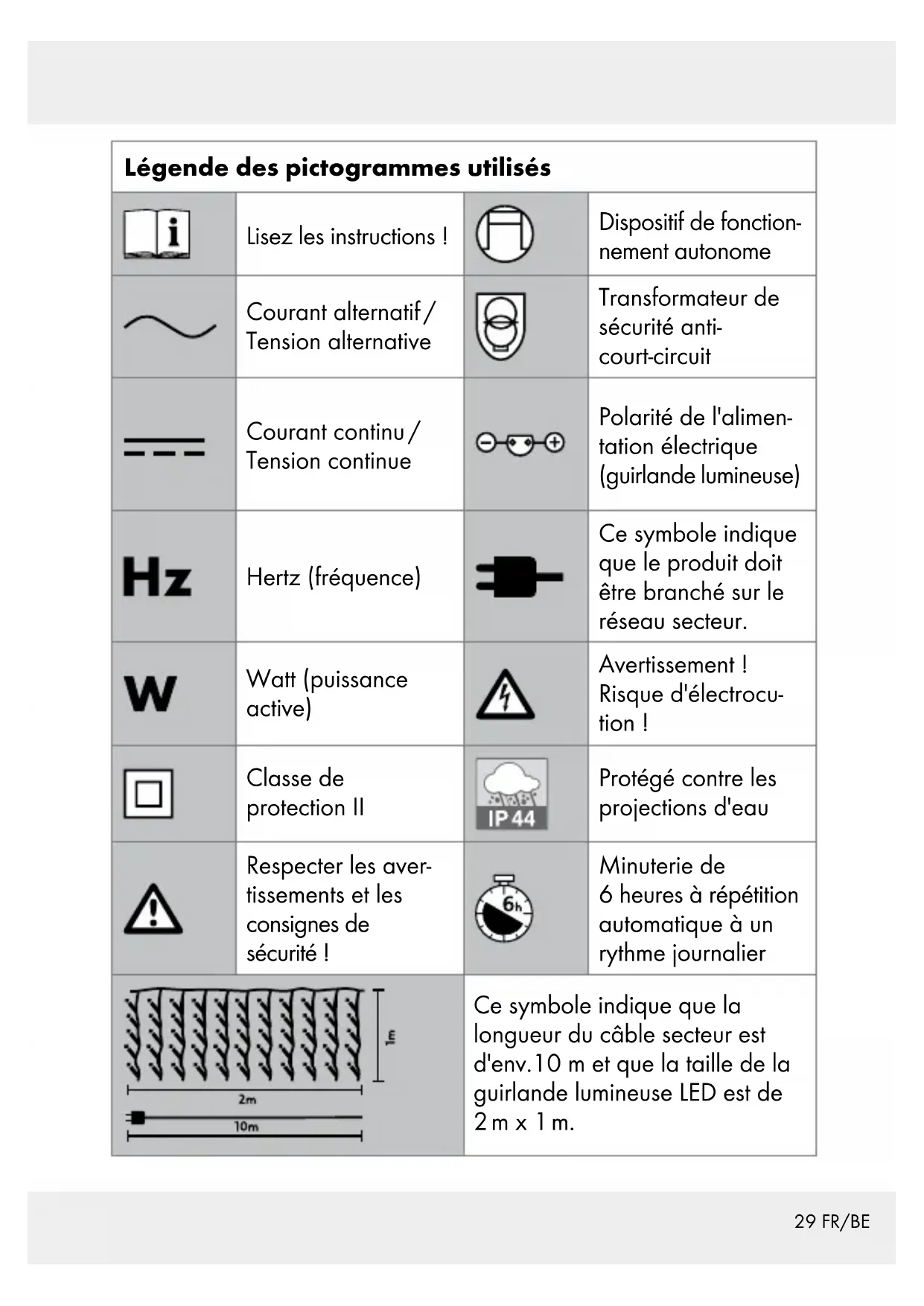 avant le montage, le démontage ou le nettoyage du produit. Ne jamais toucher la fiche du produit, ou le produit même, avec des mains mouillées. Le produit ne doit pas être raccordé électriquement à une autre guirlande lumineuse.