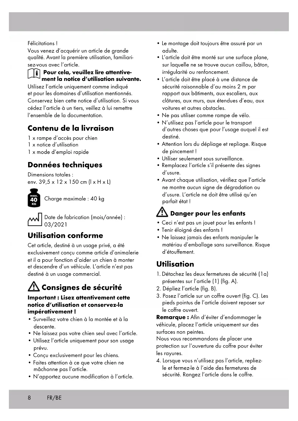 Charge maximale : 40 kg Date de fabrication (mois/année) : 03/2021 Utilisation conforme Cet article, destiné à un usage privé, a été exclusivement conçu comme article d’animalerie et il a pour fonction d’aider un chien à monter et descendre d’un véhicule. L’article n’est pas destiné à un usage commercial. Consignes de sécurité Important : Lisez attentivement cette notice d’utilisation et conservez-la impérativement !