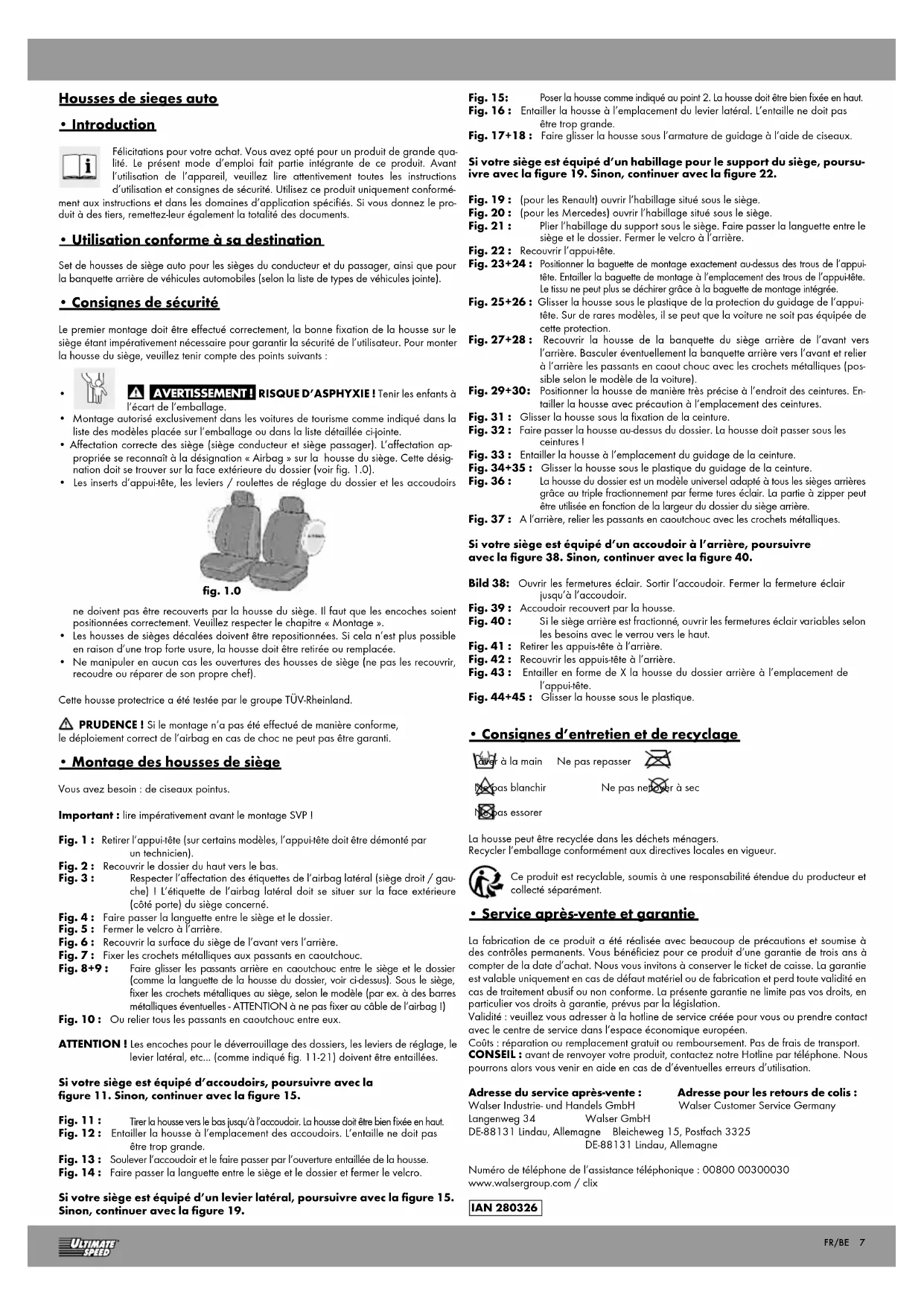- Service après-vente et garantie La fabrication de ce produit a été réalisée avec beaucoup de précautions et soumise à des contrôles permanents. Vous bénéficiez pour ce produit d’une garantie de trois ans à compter de la date d’achat. Nous vous invitons à conserver le ticket de caisse. La garantie est valable uniquement en cas de défaut matériel ou de fabrication et perd toute validité en cas de traitement abusif ou non conforme. La présente garantie ne limite pas vos droits, en particulier vos droits à garantie, prévus par la législation. Validité : veuillez vous adresser à la hotline de service créée pour vous ou prendre contact avec le centre de service dans l’espace économique européen. Coûts : réparation ou remplacement gratuit ou remboursement. Pas de frais de transport. CONSEIL : avant de renvoyer votre produit, contactez notre Hotline par téléphone. Nous pourrons alors vous venir en aide en cas de d’éventuelles erreurs d’utilisation. Adresse du service après-vente : Adresse pour les retours de colis : Walser Industrie- und Handels GmbH Walser Customer Service Germany Langenweg 34 Walser GmbH DE-88131 Lindau, Allemagne Bleicheweg 15, Postfach 3325 DE-88131 Lindau, Allemagne Numéro de téléphone de l’assistance téléphonique : 00800 00300030 www.walsergroup.com / clix IAN 280326 fig. 1.0Article L211-16 du Code de la consommation Lorsque l‘acheteur demande au vendeur, pendant le cours de la garantie commerciale qui lui a été consentie lors de l‘acquisition ou de la réparation d‘un bien meuble, une remise en état couverte par la garantie, toute période d‘immobilisation d‘au moins sept jours vient s‘ajouter à la durée de la garantie qui restait à courir. Cette période court à compter de la demande d‘intervention de l‘acheteur ou de la mise à disposition pour réparation du bien en cause, si cette mise à disposition est postérieure à la demande d‘intervention. Indépendamment de la garantie commerciale souscrite, le vendeur reste tenu des défauts de conformité du bien et des vices rédhibitoires dans les conditions prévues aux articles L211-4 à L211-13 du Code de la consommation et aux articles 1641 à 1648 et 2232 du Code Civil. Article L211-4 du Code de la consommation Le vendeur est tenu de livrer un bien conforme au contrat et répond des défauts de conformité existant lors de la délivrance. Il répond également des défauts de conformité résultant de l‘emballage, des instruc-tions de montage ou de l‘installation lorsque celle-ci a été mise à sa charge par le contrat ou a été réalisée sous sa responsabilité. Article L211-5 du Code de la consommation Pour être conforme au contrat, le bien doit : 1° Etre propre à l‘usage habituellement attendu d‘un bien semblable et, le cas échéant : - correspondre à la description donnée par le vendeur et posséder les qualités que celui- ci a présentées à l‘acheteur sous forme d‘échantillon ou de modèle ; - présenter les qualités qu‘un acheteur peut légitimement attendre eu égard aux déclarations publiques faites par le vendeur, par le producteur ou par son représen- tant, notamment dans la publicité ou l‘étiquetage ; 2° Ou présenter les caractéristiques définies d‘un commun accord par les parties ou être propre à tout usage spécial recherché par l‘acheteur, porté à la connaissance du vendeur et que ce dernier a accepté. Article L211-12 du Code de la consommation L‘action résultant du défaut de conformité se prescrit par deux ans à compter de la dé- livrance du bien. Article 1641 du Code civil Le vendeur est tenu de la garantie à raison des défauts cachés de la chose vendue qui la rendent impropre à l‘usage auquel on la destine, ou qui diminuent tellement cet usa-ge que l‘acheteur ne l‘aurait pas acquise, ou n‘en aurait donné qu‘un moindre prix, s‘il les avait connus. Article 1648 1er alinéa du Code civil L‘action résultant des vices rédhibitoires doit être intentée par l‘acquéreur dans un délai de deux ans à compter de la découverte du vice. Les pièces détachées indispensables à l’utilisation du produit sont disponibles pendant la durée de la garantie du produit. FR/BE 8NL/BE 9 Set autostoelbekledingen