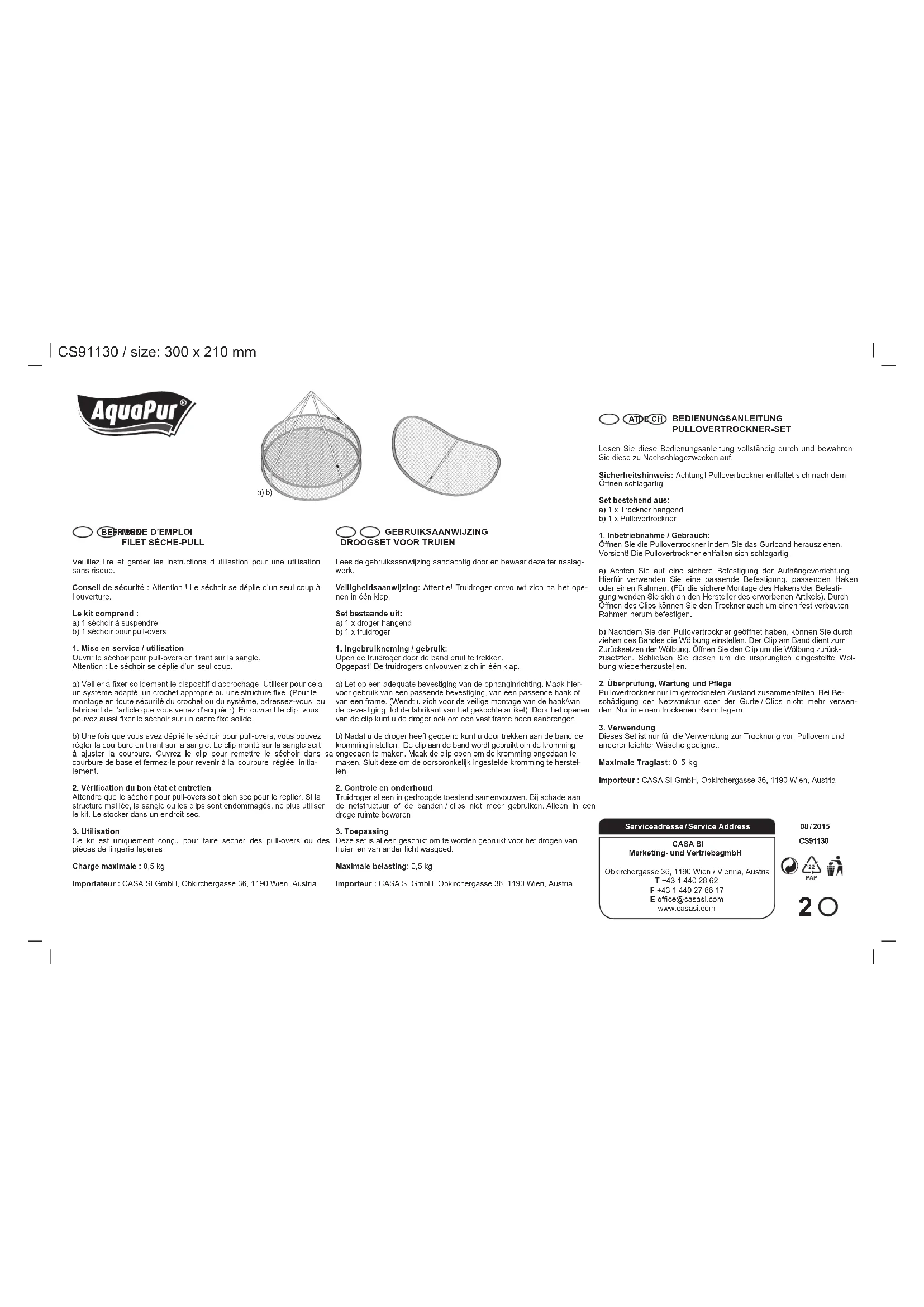 Veuillez lire et garder les instructions d‘utilisation pour une utilisation sans risque. Conseil de sécurité : Attention ! Le séchoir se déplie d’un seul coup à l‘ouverture. Le kit comprend : a) 1 séchoir à suspendre b) 1 séchoir pour pull-overs