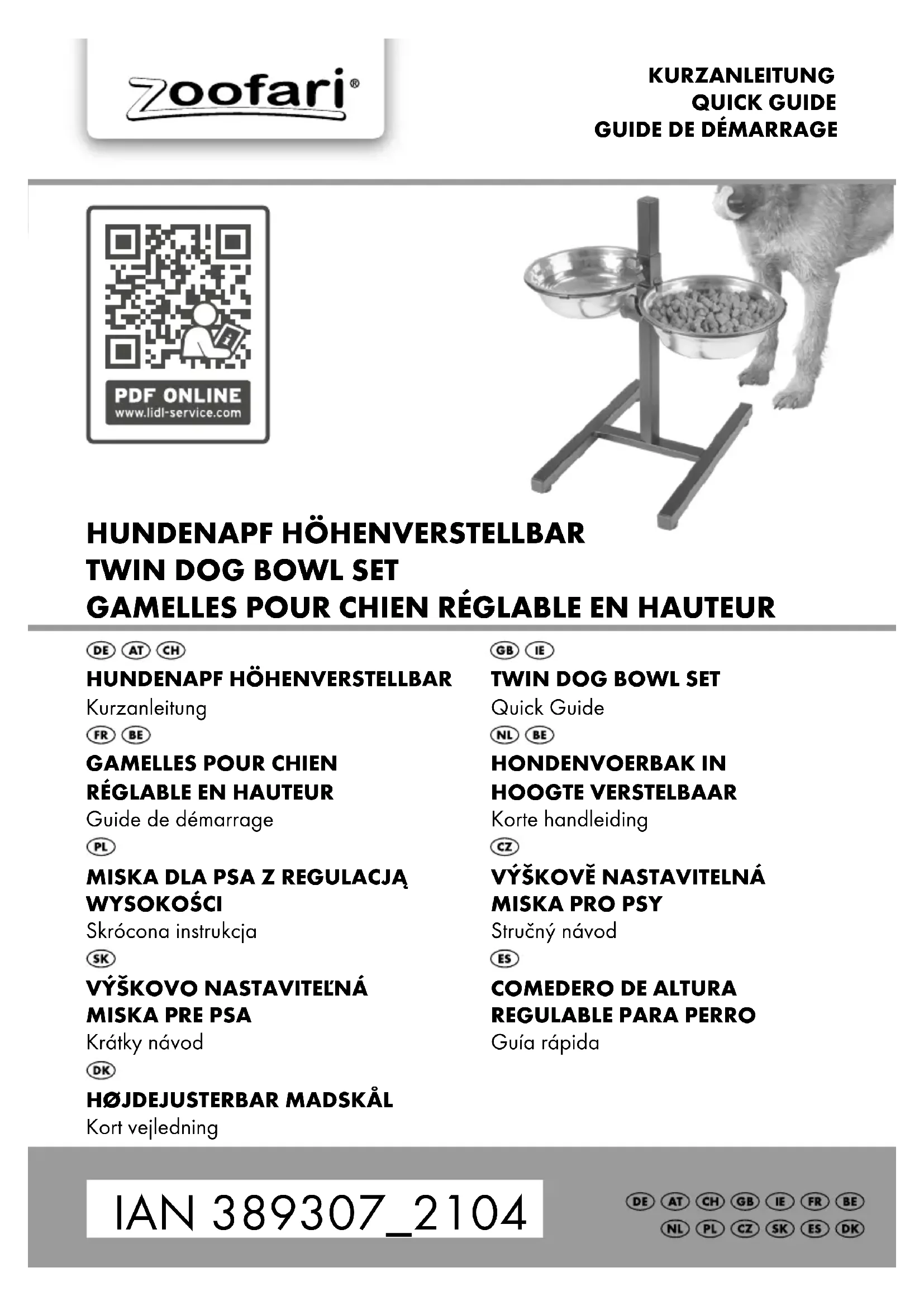 Note: compensate for an uneven floor by adjusting the rubber feet. GB/IE7GB/IE Use You can remove the bowls (8) from the holder (3) by undoing the locking screw (5) on the locking mechanism (4) and sliding it up. Note: when replacing the bowls, ensure they are securely in place. Storage, cleaning When not in use, always store the product clean and dry at room temperature. Clean only with water and a mild detergent, and wipe dry afterwards with a cloth. IMPORTANT! Never clean the product with harsh cleaning agents. The bowls are dishwasher-safe.8 FR/BE Ce document est une version imprimée abrégée de la notice d’utilisation complète. En scannant le code QR, vous serez directement redirigé(e) vers la page des services de Lidl (www.lidl-ser- vice.com) et vous pourrez consulter et téléchar- ger la notice d’utilisation complète en saisissant le numéro d’article (IAN) 389307_2104. ATTENTION ! Respectez bien toutes les indica- tions de la notice d’utilisation et les consignes de sécurité afin d’éviter tout dommage corporel et matériel. Le guide de démarrage fait partie intégrante de cet article. Familiarisez-vous avec la notice d’utilisation et les consignes de sécurité avant d’utiliser l’article. Conservez bien ce guide de démarrage et si vous cédez l’article à un tiers, remettez-lui l’ensemble de la documenta- tion. Étendue de la livraison 1 porte-gamelles, démonté (1 - 7) 2 écuelles (8) 6 bagues en caoutchouc (9) 1 clé hexagonale 1 guide de démarrage Caractéristiques techniques Dimensions du porte-gamelles : env. 42 x 27 x 47 cm (P x La x H) Dimensions d’une écuelle : 23 x 6,8 cm (Ø x H) Date de fabrication (mois/année) : 10/2021 Utilisation conforme à sa destination Cet article a été conçu exclusivement pour les animaux et sert de gamelle pour l’alimentation animale. L’article convient aux aliments secs et humides. L’article est destiné à un usage privé et n’est pas prévu pour une utilisation commerciale. Consignes de sécurité Important : lisez attentivement cette notice d’utilisation et conservez-la abso- lument ! Danger de mort !