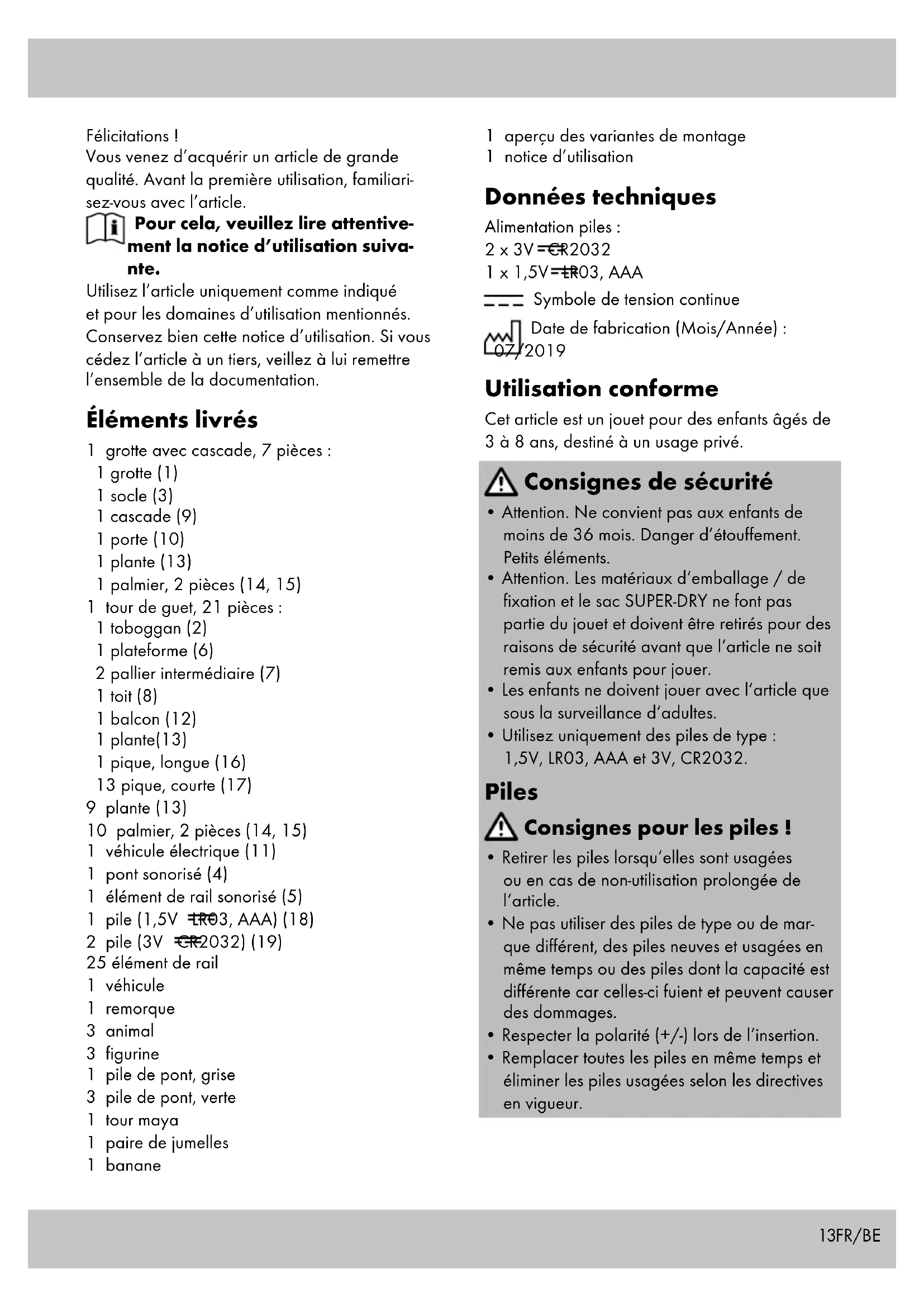 - Si un véhicule roule par-dessus le bouton (4d) sur le pont (4) ou l’élément de rail (5) sonori- sé, le son s’active. Stockage, nettoyage Lorsque vous n’utilisez pas l’article, rangez-le toujours dans un endroit sec, propre, sans piles et à une température ambiante. Nettoyez l’article uniquement avec un chiffon de nettoyage humide, puis séchez-le en l’essuyant. Attention : veuillez nettoyer les rails avant la première utilisation ! IMPORTANT ! Ne jamais laver avec des produ- its de nettoyage agressifs. Mise au rebut Éliminez l‘article et le matériel d‘emballage conformément aux directives locales en vigueur. Le matériel d‘emballage tel que les sachets en plastique par exemple ne doivent pas arriver dans les mains des enfants. Conservez le matéri- el d‘emballage hors de portée des enfants. Ce produit est recyclable. Il est soumis à la responsabilité élargie du fabricant et est collecté séparément. Éliminez les produits et les emballages dans le respect de l‘environnement. Le code de recyclage est utilisé pour identifier les différents matériaux pour le retour dans le circuit de recyclage. Le code se compose du symbole de recyclage, qui doit correspondre au circuit de recyclage, et d‘un numéro identifiant le matériau. Les appareils qui portent le symbole ci-contre ne doivent pas être jetés avec les ordures ménagères. Vous êtes dans l‘obligation d‘éliminer séparément les appareils électriques et électroniques usagés. Informez- vous auprès de votre commune sur les possibili- tés d‘élimination réglementée. Avant de mettre l‘article au rebut, retirez la pile qui s‘y trouve. Consignes pour l’élimination des piles Attention ! Les piles sont des déchets spéciaux qui, conformément à la législati- on, ne doivent pas être jetés avec les ordures ménagères. Vous pouvez déposer gratuitement les batteries usagées dans les points de collecte communaux ou dans le commerce où des récipients de collecte spéci- aux sont mis à disposition. Indications concernant la garantie et le service après- vente Le produit a été fabriqué avec le plus grand soin et sous un contrôle permanent. Vous avez sur ce produit une garantie de trois ans à partir de la date d’achat. Conservez le ticket de caisse. La garantie est uniquement valable pour les défauts de matériaux et de fabrication, elle perd sa validité en cas de maniement incorrect ou non conforme. Vos droits légaux, tout particulière- ment les droits relatifs à la garantie, ne sont pas limitées par cette garantie. FR/BE16 En cas d‘éventuelles réclamations, veuillez vous adresser à la hotline de garantie indiquée ci-dessous ou nous contacter par e-mail. Nos employés du service client vous indiqueront la marche à suivre le plus rapidement possible. Nous vous renseignerons personnellement dans tous les cas. La période de garantie n‘est pas prolongée par d’éventuelles réparations sous la garantie, les garanties implicites ou le remboursement. Ceci s‘applique également aux pièces remplacées et réparées. Les réparations nécessaires sont à la charge de l’acheteur à la fin de la période de garantie. Article L217-16 du Code de la consommation Lorsque l‘acheteur demande au vendeur, pendant le cours de la garantie commerciale qui lui a été consentie lors de l‘acquisition ou de la réparation d‘un bien meuble, une remise en état couverte par la garantie, toute période d‘immobilisation d‘au moins sept jours vient s‘ajouter à la durée de la garantie qui restait à courir. Cette période court à compter de la demande d‘intervention de l‘acheteur ou de la mise à disposition pour réparation du bien en cause, si cette mise à disposition est postérieure à la demande d‘intervention. Indépendamment de la garantie commerciale souscrite, le vendeur reste tenu des défauts de conformité du bien et des vices rédhibitoires dans les conditions prévues aux articles L217-4 à L217-13 du Code de la consommation et aux articles 1641 à 1648 et 2232 du Code Civil. Article L217-4 du Code de la consommation Le vendeur livre un bien conforme au contrat et répond des défauts de conformité existant lors de la délivrance. Il répond également des défauts de conformité résultant de l‘emballage, des instructions de montage ou de l‘installation lorsque celle-ci a été mise à sa charge par le contrat ou a été réalisée sous sa responsabilité. FR/BE Article L217-5 du Code de la consommation Le bien est conforme au contrat : 1° S´il est propre à l‘usage habituellement attendu d‘un bien semblable et, le cas échéant :