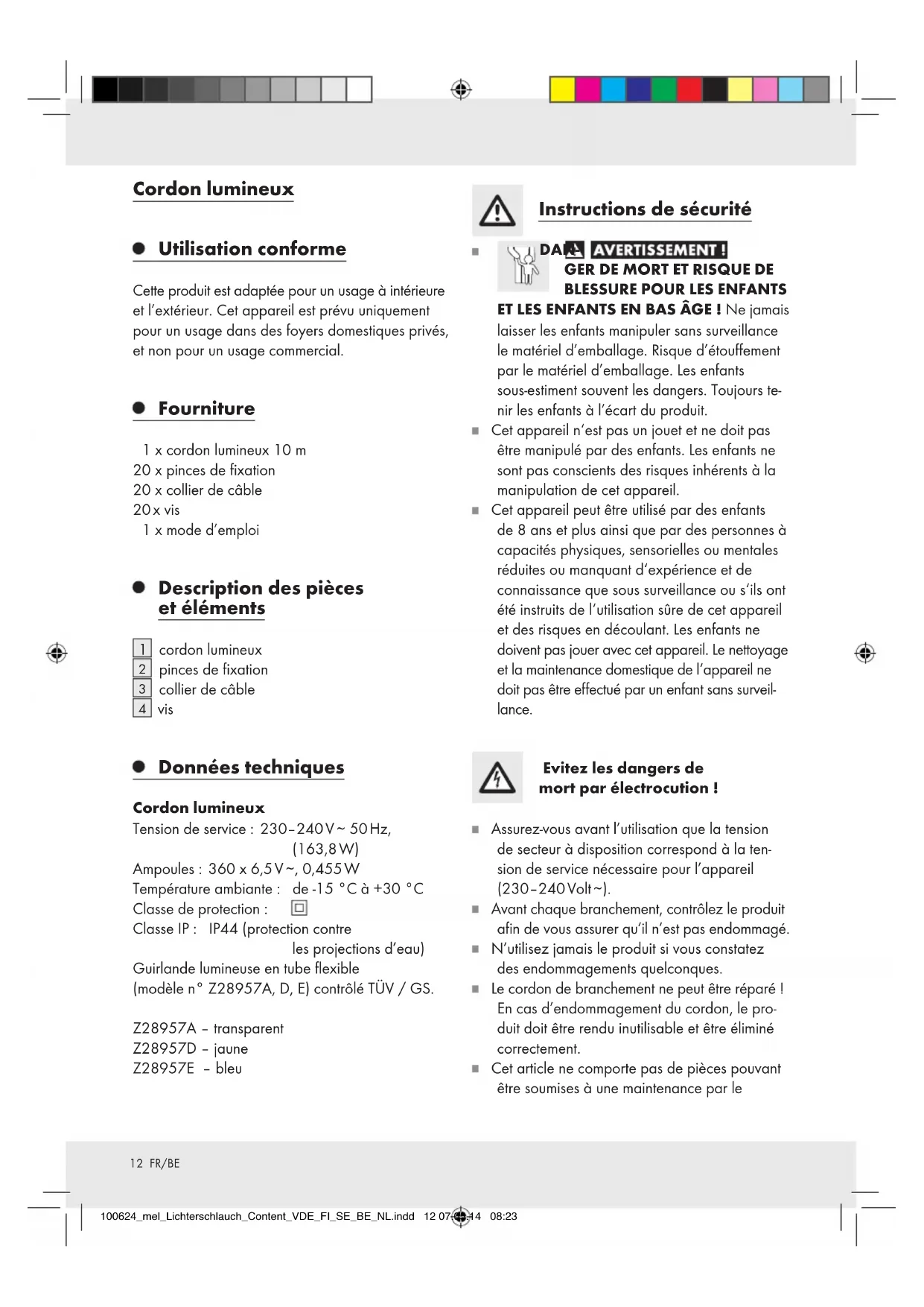 vis Données techniques Cordon lumineux Tension de service: 230–240 V ∼ 50 Hz, (163,8 W) Ampoules: 360 x 6,5 V ∼, 0,455 W Température ambiante: de -15 °C à +30 °C Classe de protection: Classe IP : IP44 (protection contre les projections d’eau) Guirlande lumineuse en tube flexible (modèle n° Z28957A, D, E) contrôlé TÜV / GS. Z28957A – transparent Z28957D – jaune Z28957E – bleu Instructions de sécurité DAN-
